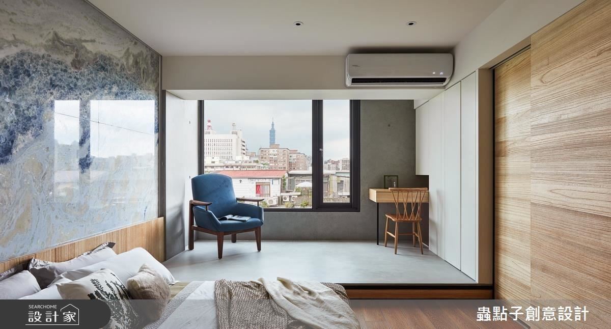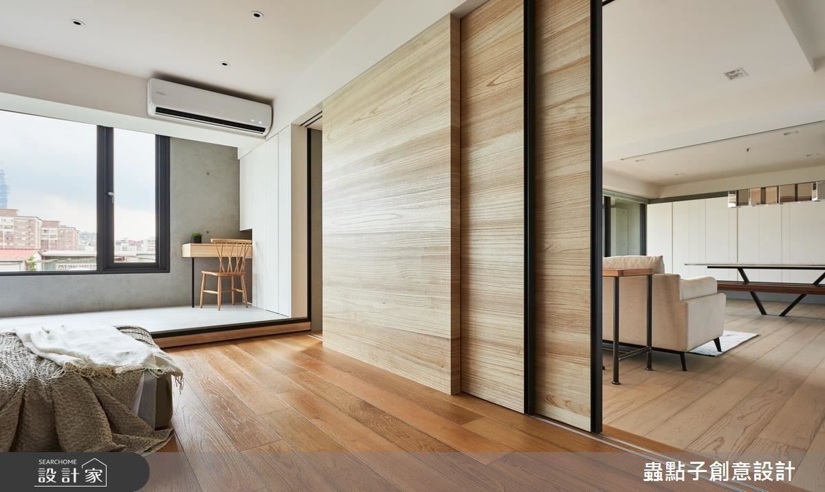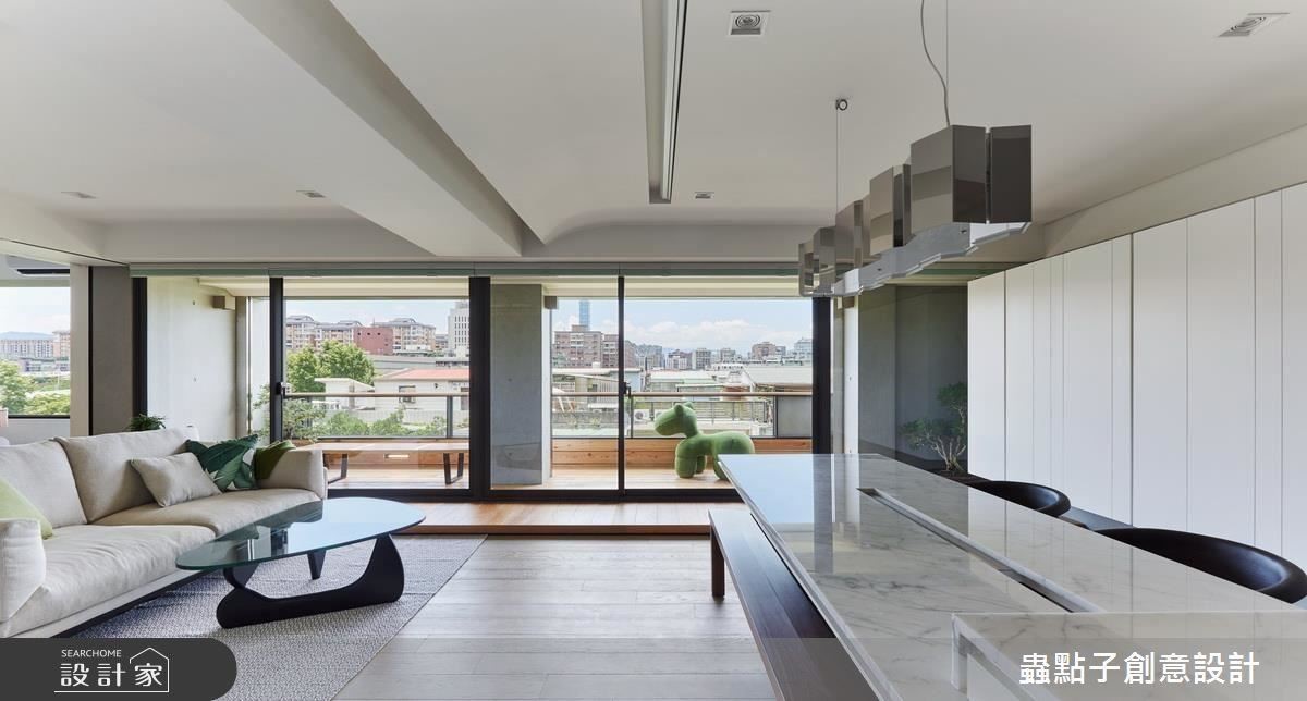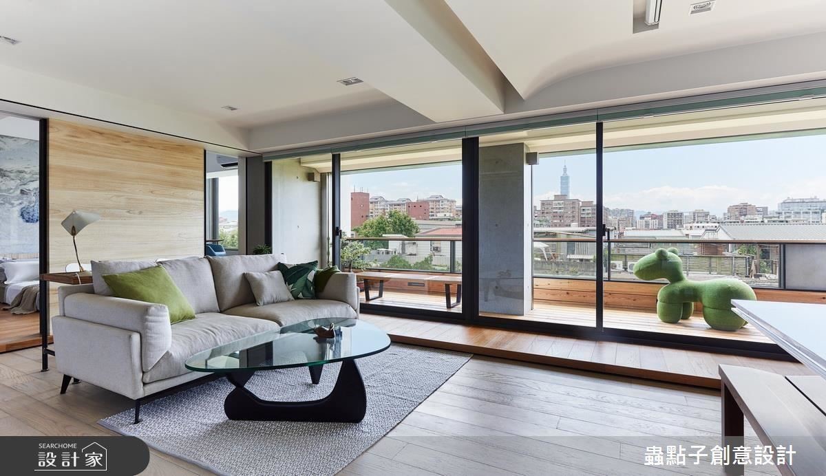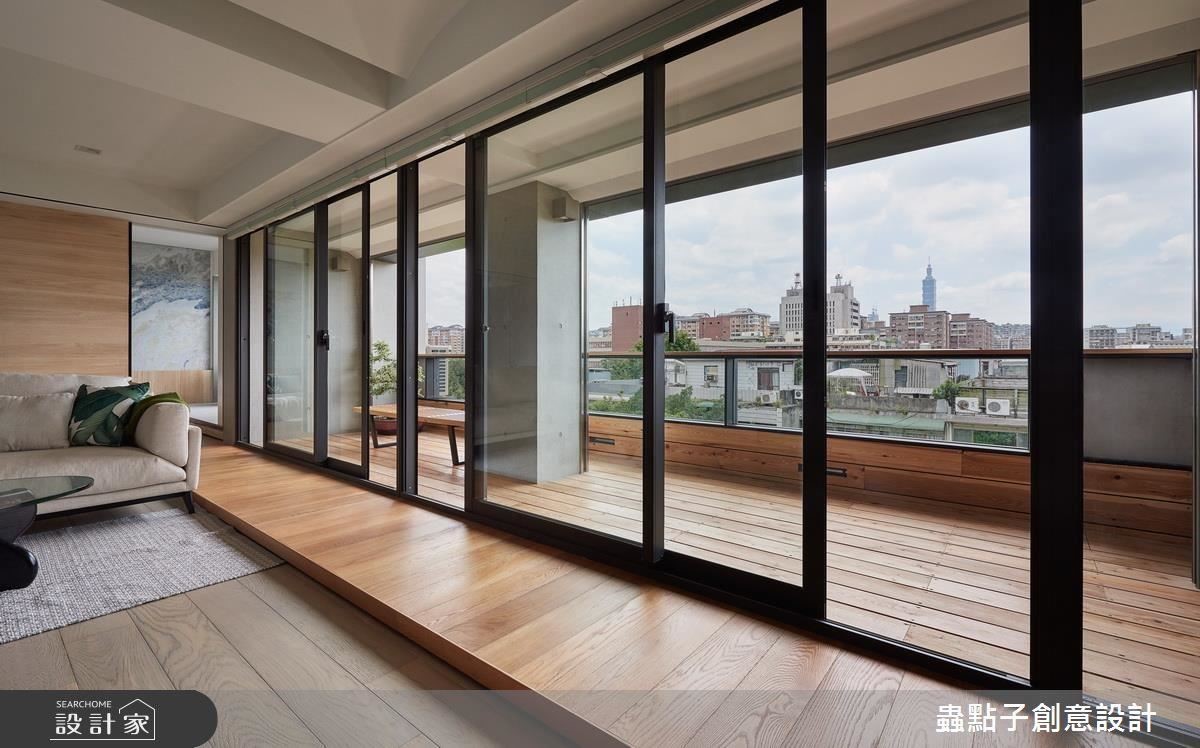 被前屋主外推的陽台,改以更大的佔地面積內退還原,壓低的女兒牆吸納最美的城市天際線,並鋪設與室內等高的木質地板,創造邊界模糊卻黏著性佳的過渡地帶,讓原本受限的空間景深,可以和戶外的樹冠層、遠處的城市輪廓產生連結。