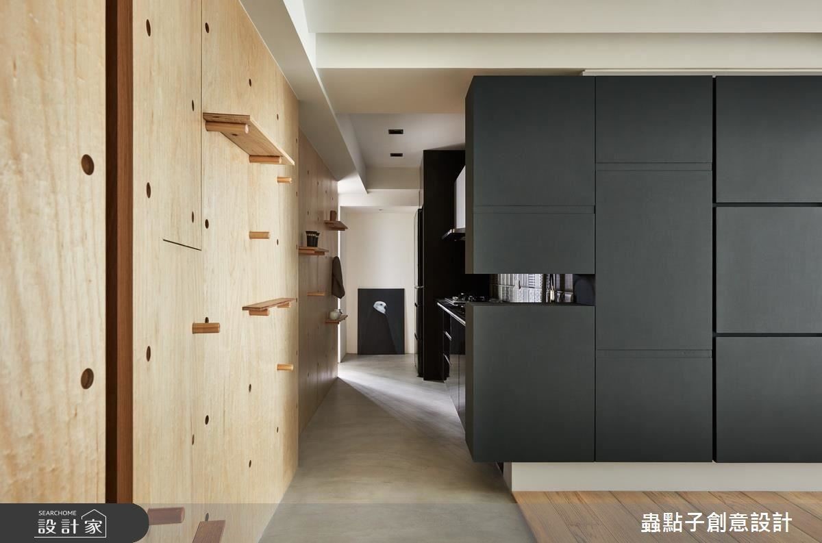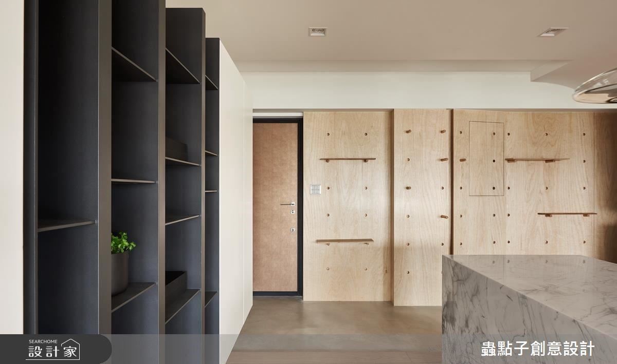 從大門往廚房的左側連續牆面以夾板基材來施作,分段做出層次的立面造型附設背景光,一方面修飾突兀的電表箱,一方面在板材上鑿出成排洞孔,讓使用者可以自由改變層架形式,其實小編覺得不放東西也超有質感。