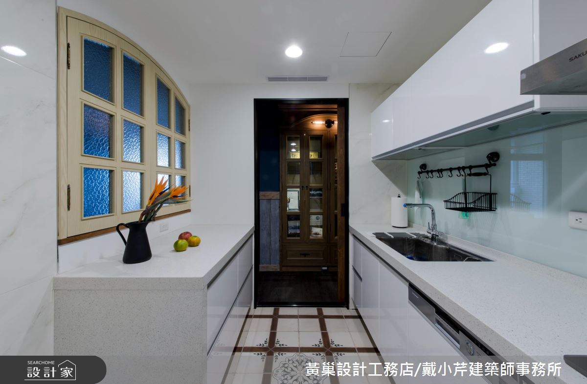 書房與廚房雖然皆為獨立,但是分別利用玻璃格狀窗與木百葉推窗與公領域空間串連,尤其是廚房推窗打開能直接與餐廳吧台連接,創造流暢烹飪動線!