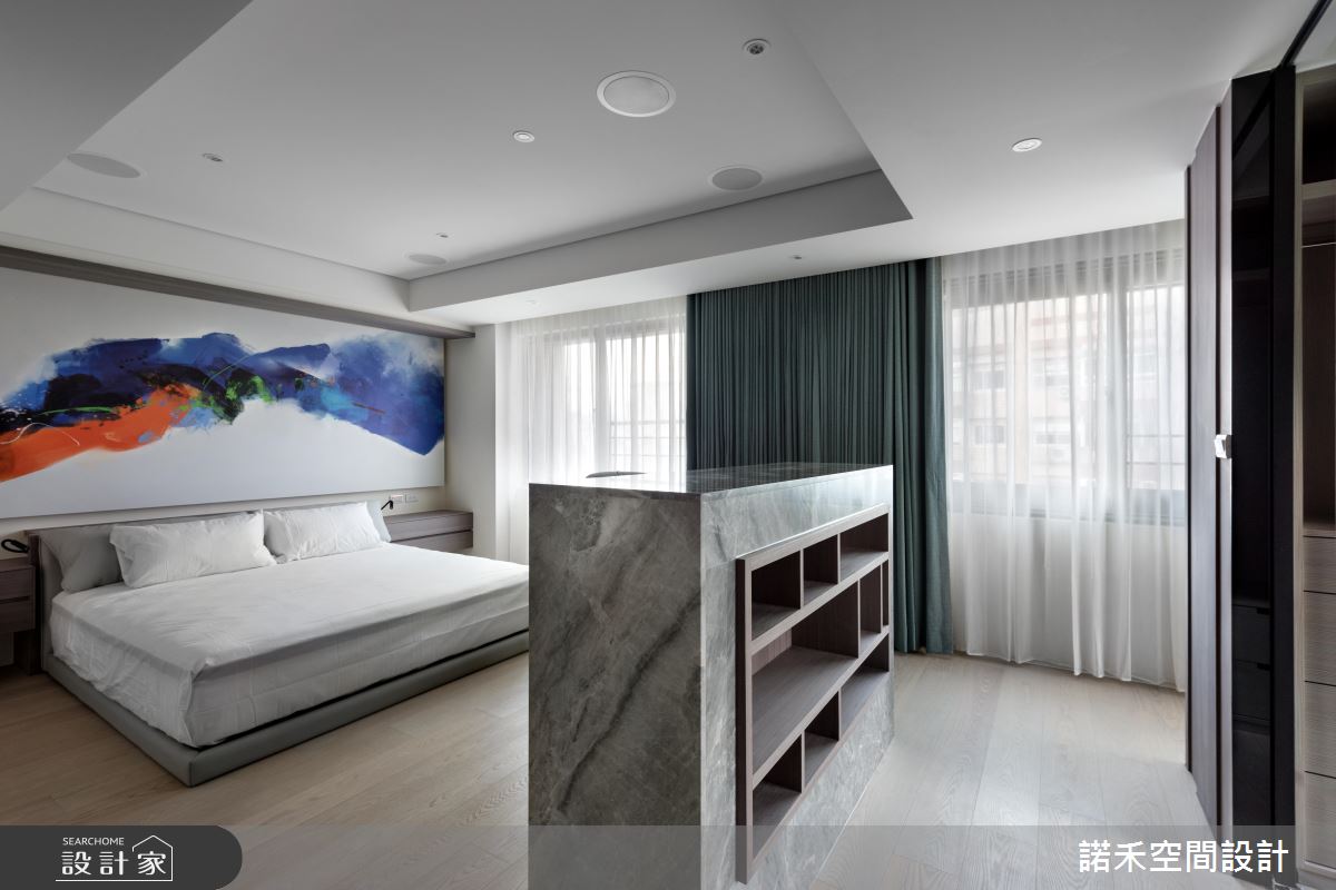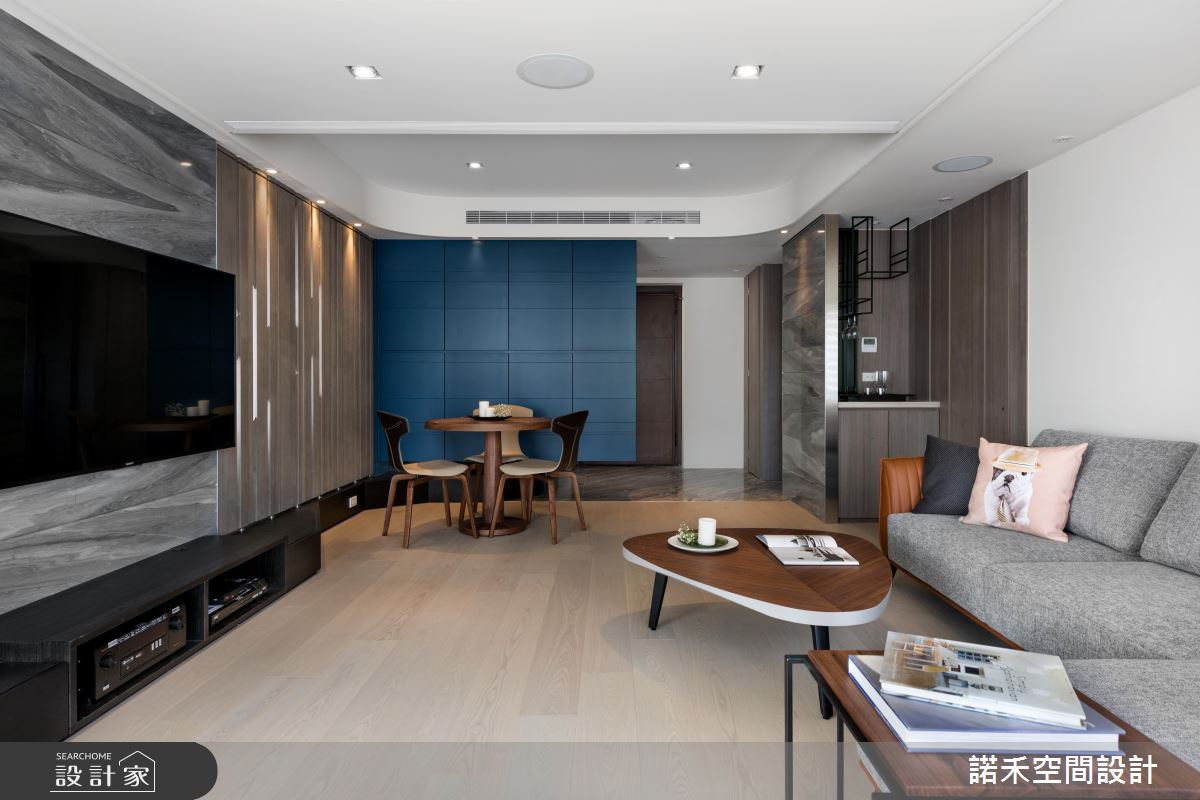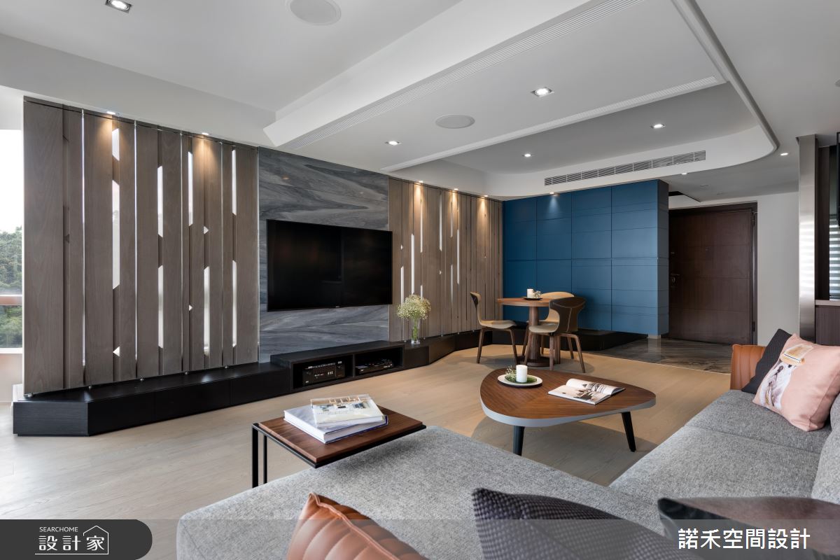 大門處,設計師利用藍色烤漆懸吊櫃、圍塑出獨立的玄關,搭佐俐落的線條轉折,凝聚令人印象深刻的入門視野,廳區則在天花加入圓弧造型、修飾樑位過低的缺陷,且運用弧線的延伸,將整個公共範圍予以串聯,同時降低櫃體與家具高度,讓光線可從客廳分享至餐廳區,而窗邊規劃的六角窗區塊,也無形中增加了公領域的明亮氛圍;二樓樓高則因較為偏低,同樣降低家具或量體高度,型塑光與視線的流動,且讓管線集中於次要空間,並於臥房內保有大面積的美好窗景,創造出休閒具品味的生活意境!