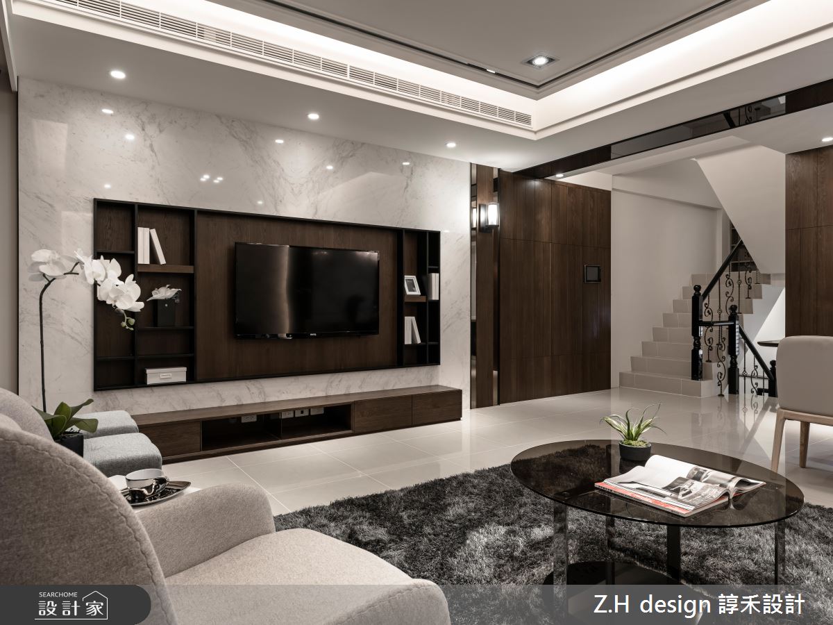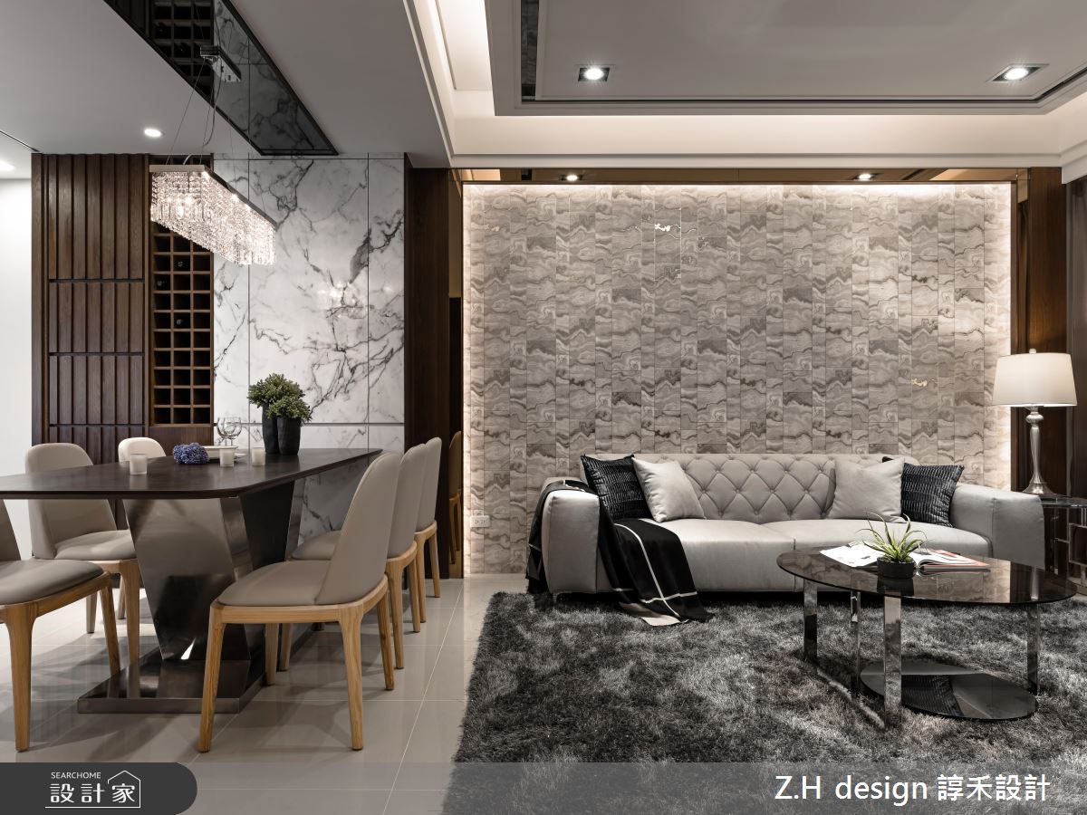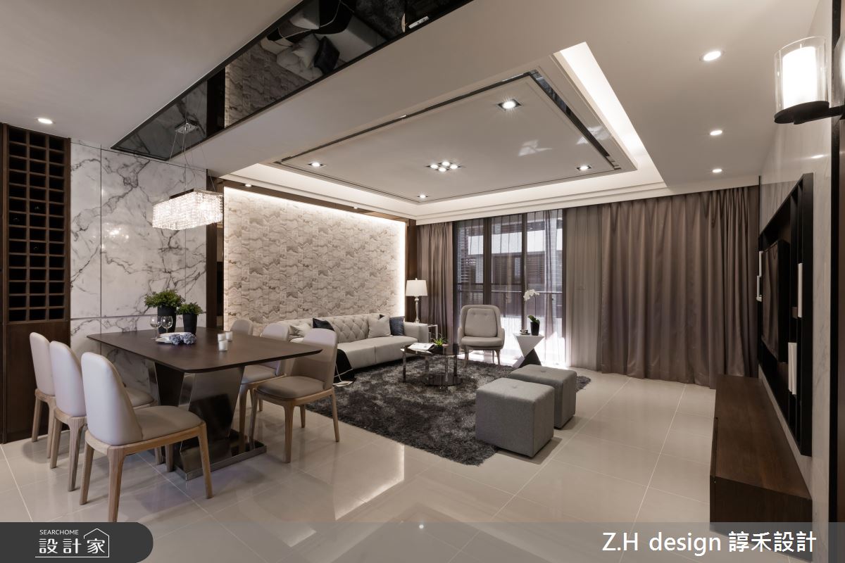 客廳區,電視牆以白色大理石為底,加入木皮與黑鐵框架的堆砌,不僅添注展示機能,也在線條切割之中帶出豐富表情,沙發牆則巧妙選用石材壁紙鋪敘,與居宅使用的大理石建材形成呼應,呈現出低調奢華的立面印象,同時運用開放式的公領域格局、帶來開闊敞亮的視野,並加入燈光與鏡面的框塑點綴,藉此達到拉抬空間的作用;主臥採以白色為基底,呈現素雅舒適的風格底蘊,且將電視牆整合收納及衣櫃,落實一體成型的俐落機能!