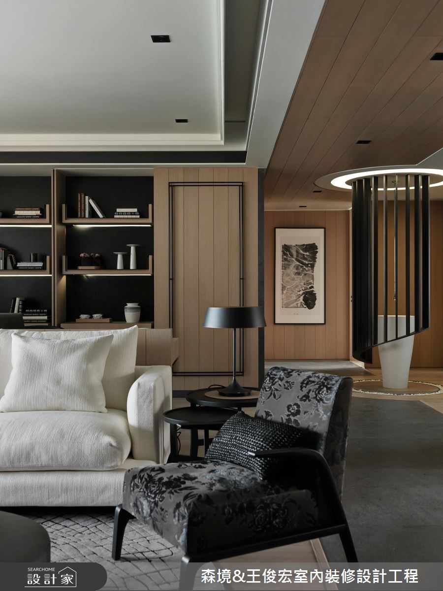 打造開闊舒適的住宅,關鍵在於創造讓人舒心的窗景,設計師將零碎而不必要的隔間拆除,促使公共空間敞開,引進大量採光與大面窗景;而貫穿空間的走道,則猶如摩西帶領眾人穿越紅海,一刀劃分公、私領域,盡頭處用鐵件造型格柵,將盥洗檯妝點如裝置藝術的存在,破解人們以為的理所當然,方與圓的造型,不斷在空間中重複,盥洗檯裝置藝術的天花板、地坪,在大空間的方框中,彷彿另闢一處靜謐;客廳一隅的掛畫,偏安一處,也在方、圓造型間取得平衡,如同生活中的取、捨,唯有能捨,才能得。