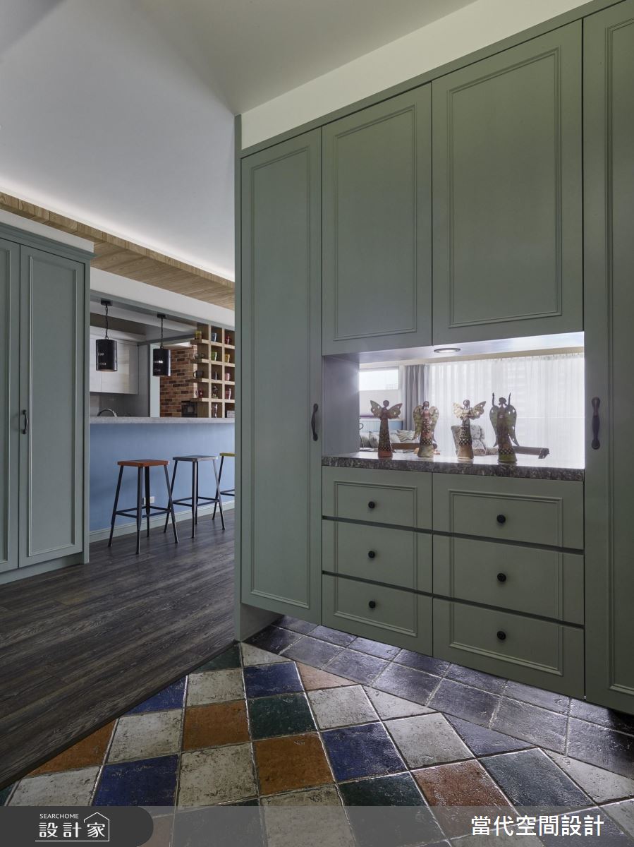 豐富配色、帶著斑駁感的磁磚鋪陳玄關地坪,不工整的切割展現自然不造作的精神,創造迎賓的獨特魅力,多樣色彩交織出室內風格的序曲,大面鞋櫃同時轉化為隔屏機能,界定出內外領域。開放式的公領域裡,伴隨充沛暖陽的灑落,照亮色彩相融的鄉村風尚,隨著視覺停留在不同色系上,心境也隨之轉換;電視牆以紅磚質感的文化石打造,與對面的書牆壁面相互呼應,搭配對襯的鐵件壁燈,彷彿走入歐風小鎮裡;天花大樑界定出客、餐、廚與書房空間,藍色系的檯面成為廚房與書房隔間,呈現舒服、清涼感受,而粉綠色系則詮釋餐廳主題;多色與原木質感的收納櫃創造出靈活多變的櫃體設計,甚至還規劃菱格形狀的紅酒櫃,兼具收納與展示收藏的需求,同時豐盈視覺變化。
