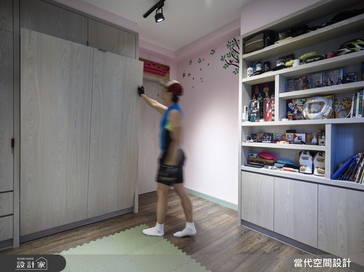 大地色系的木紋佈滿天花板與地坪,創造安定、溫暖的空間基底,設計師藉由繽紛色彩點綴壁面、門板,形塑不同的風格領域,加上男屋主時常出國工作,帶回一件件充滿異國風的收藏品,因此透過大量的展示與收納櫃,讓風格物件得以收納,同時陳列於空間裡,成為絕佳的風格裝飾。