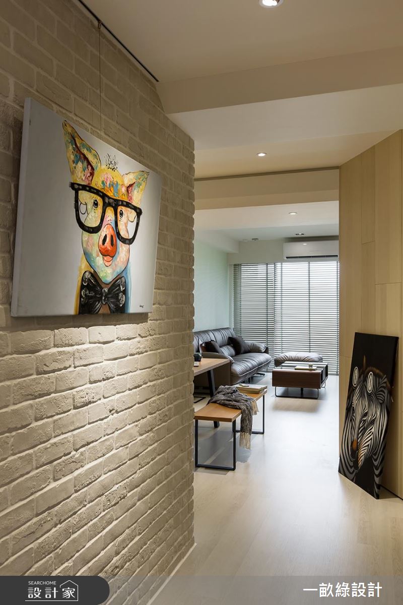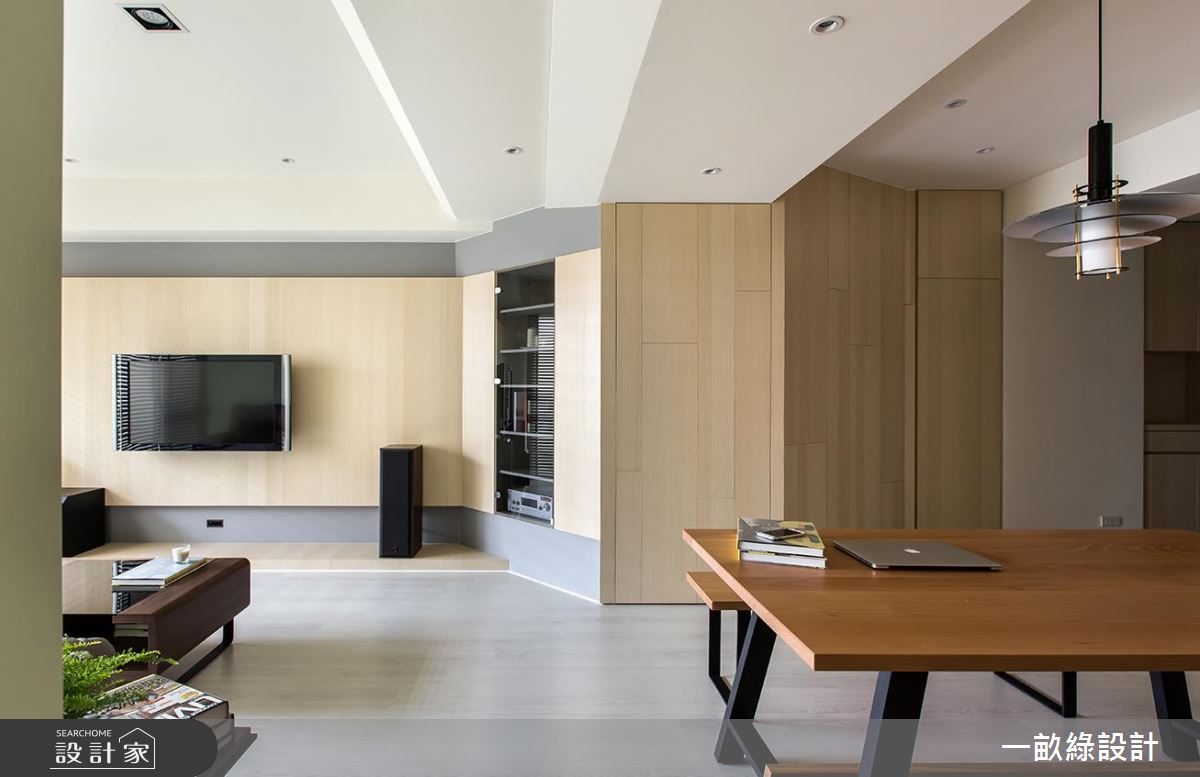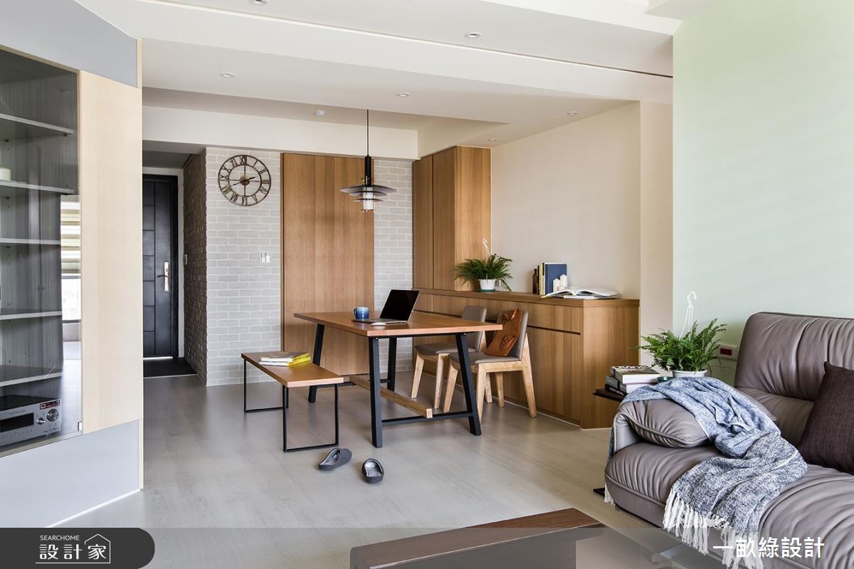 由於 20 坪空間坪數有限,首先,以開放設計援引單邊開窗的充沛日光,達成採光第一要件。接著,順應基地長邊鋪設色調輕淺的超耐磨木地板,巧妙延伸客、餐廳視覺,與從玄關延伸至電視牆的實木皮相呼應,且為了修飾柱體,設計師以不規則立面為電器、收納櫃營造視覺活潑度,以木設計為整體空間營造溫潤、清爽的感受。最後,在沙發背牆塗刷高明度的淺綠色調,與玄關的文化石牆面一同注入生機盎然的氣息;另一方面,在家具、軟件與局部牆面回歸黑、白、灰色調,創造平衡、冷靜的效果。