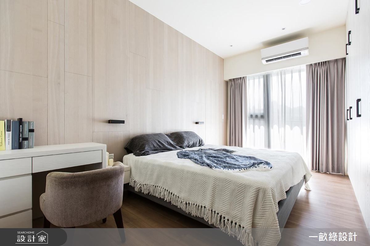 臥房以收納機能為主,大面積櫃體與床頭背牆經過拼貼的木皮,形成溫馨舒適的明亮景象,佐以無印風格的軟件配色,打造優雅的日系臥房。