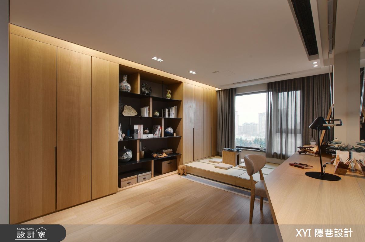 書房內除了挹注收納機能,也依循良好採光,在窗下規劃休憩臥榻區,搭配著小巧的桌几與坐墊、以及溫暖的微日式禪韻,一個私人的和風小茶室於焉成形!