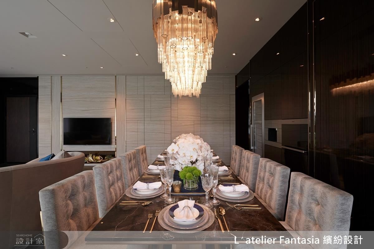 金色系的水晶主燈,是開放區域的視覺亮點,餐桌尺度安排 8-10 人的空間,餐桌擺設能夠搭配主題與節氣變換花藝,餐盤的擺設與圈環,讓生活中增加樂趣與儀式感。