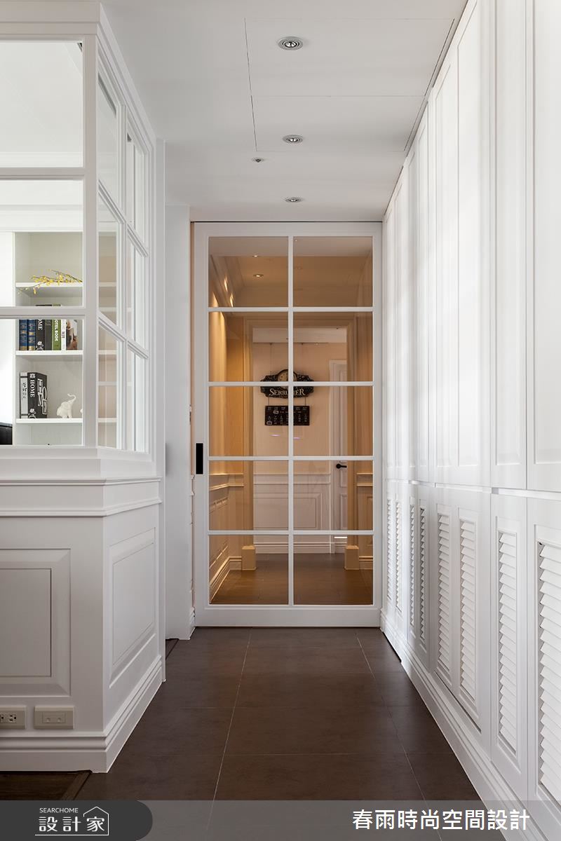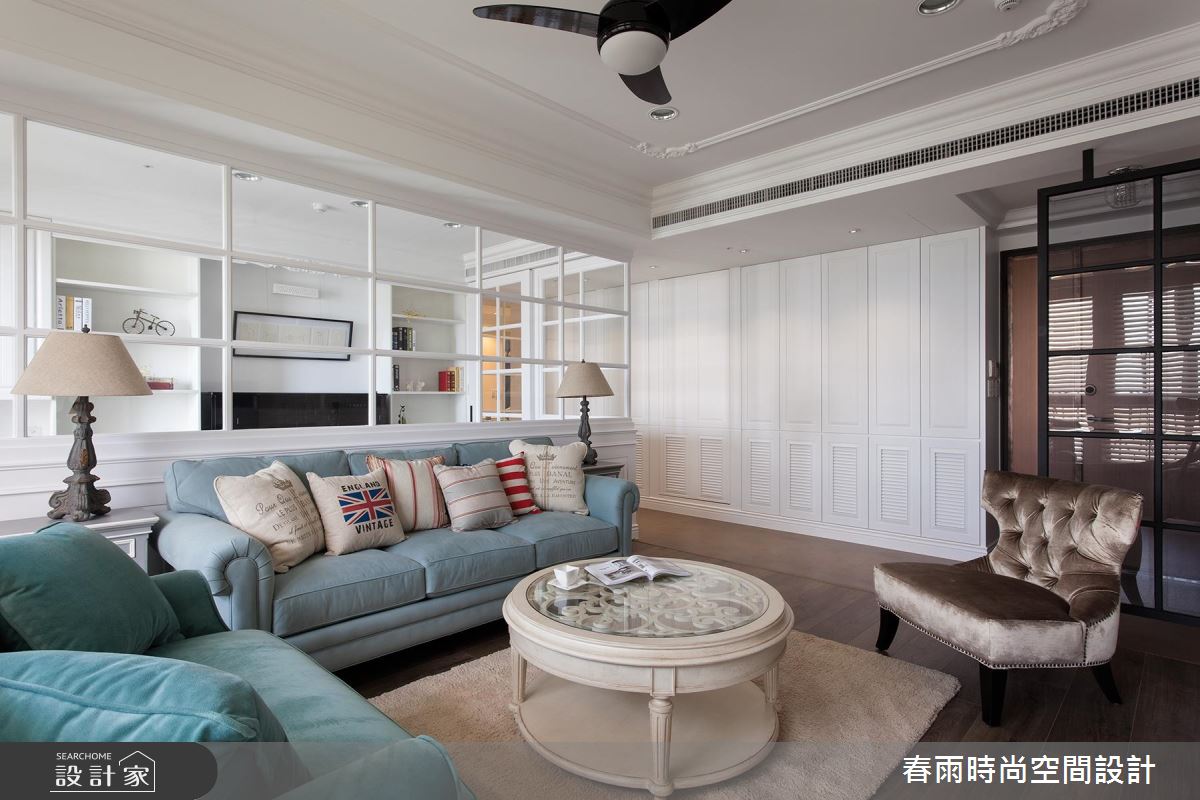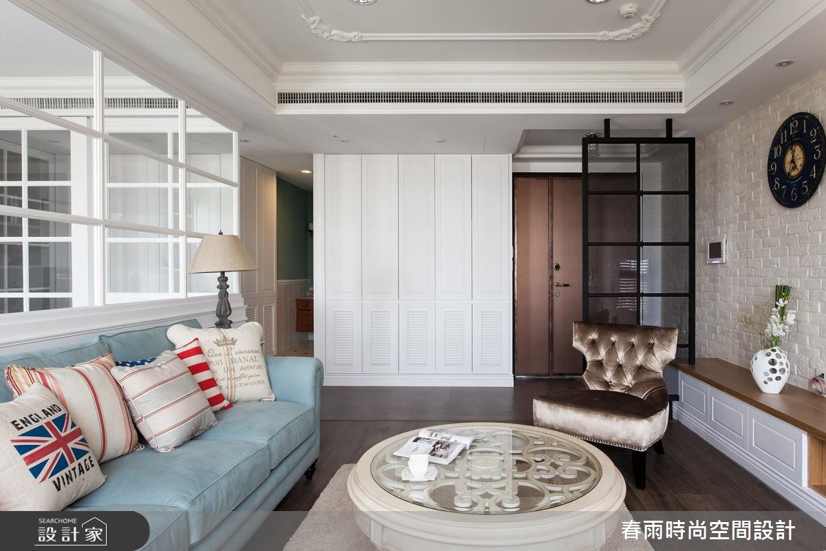 首先針對動線規劃,設計師以灰玻屏隔巧妙畫出玄關空間,同時化解穿堂煞風水疑慮,且維持客廳的開闊視覺。為了維持整體公領域的通透感,利用極富穿透性的格狀玻璃串連客廳與獨立書房,維持隱私卻不減日光穿透性。為了維持適當的冷房效應,在通往餐廳的廊道上設立一道拉門,也創造公私領域的分野。接著針對收納機能,設計師為屋主在玄關延伸至廊道設置大面積木百葉櫃體,搭配通往客浴的隱藏門片,兼具充裕收納並收攏視覺。主臥收納則巧妙將整排收納櫃與床頭牆結合,並作出通往衛浴的走道動線。最後,針對風格營造,設計師在客廳以純白文化石牆、木百葉搭配色調沉穩的超耐磨木地板,並選用高明度的藍色系沙發;另外,把壁爐設計置於餐廳,佐以精緻的天花雕飾,型塑時尚不失溫馨的美式風情。
