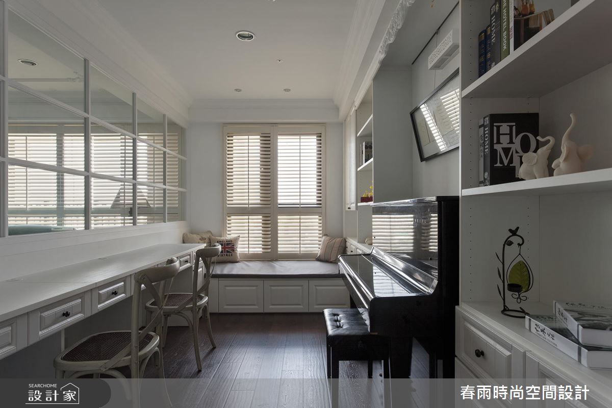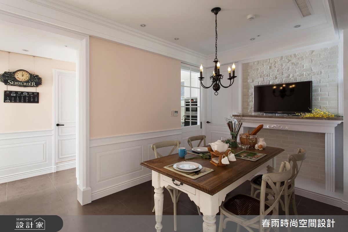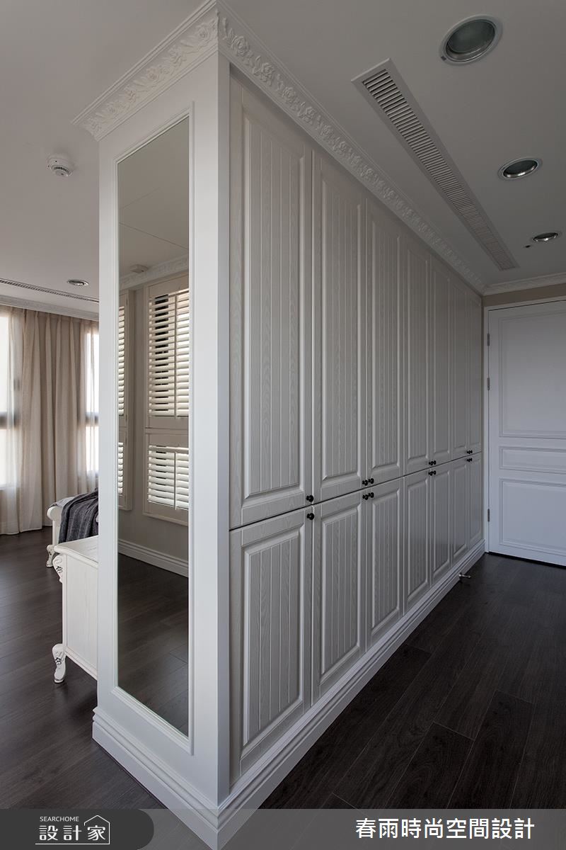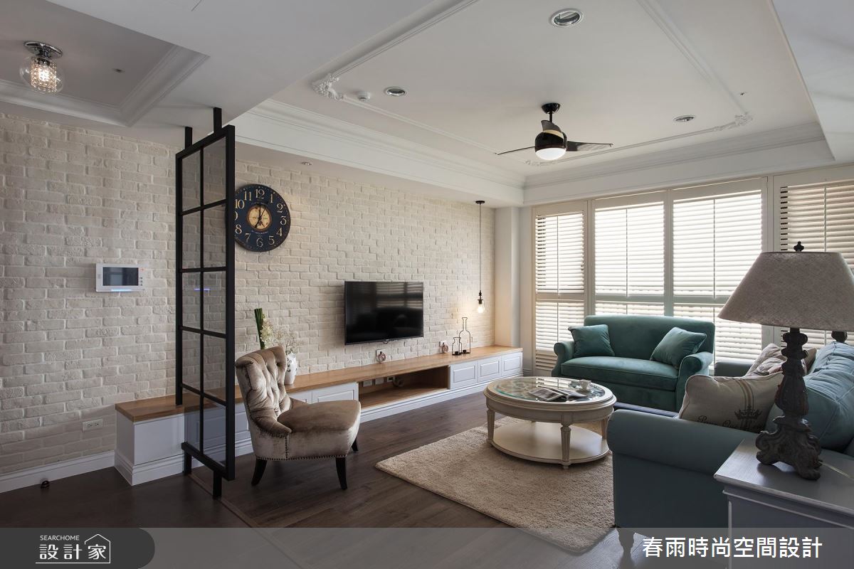 首先針對動線規劃,設計師以灰玻屏隔巧妙畫出玄關空間,同時化解穿堂煞風水疑慮,且維持客廳的開闊視覺。為了維持整體公領域的通透感,利用極富穿透性的格狀玻璃串連客廳與獨立書房,維持隱私卻不減日光穿透性。為了維持適當的冷房效應,在通往餐廳的廊道上設立一道拉門,也創造公私領域的分野。接著針對收納機能,設計師為屋主在玄關延伸至廊道設置大面積木百葉櫃體,搭配通往客浴的隱藏門片,兼具充裕收納並收攏視覺。主臥收納則巧妙將整排收納櫃與床頭牆結合,並作出通往衛浴的走道動線。最後,針對風格營造,設計師在客廳以純白文化石牆、木百葉搭配色調沉穩的超耐磨木地板,並選用高明度的藍色系沙發;另外,把壁爐設計置於餐廳,佐以精緻的天花雕飾,型塑時尚不失溫馨的美式風情。