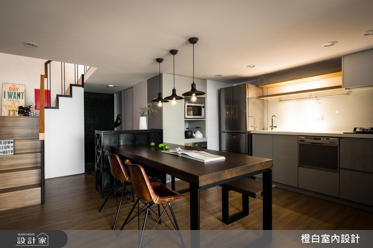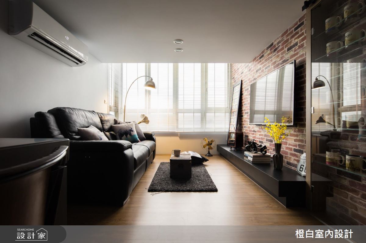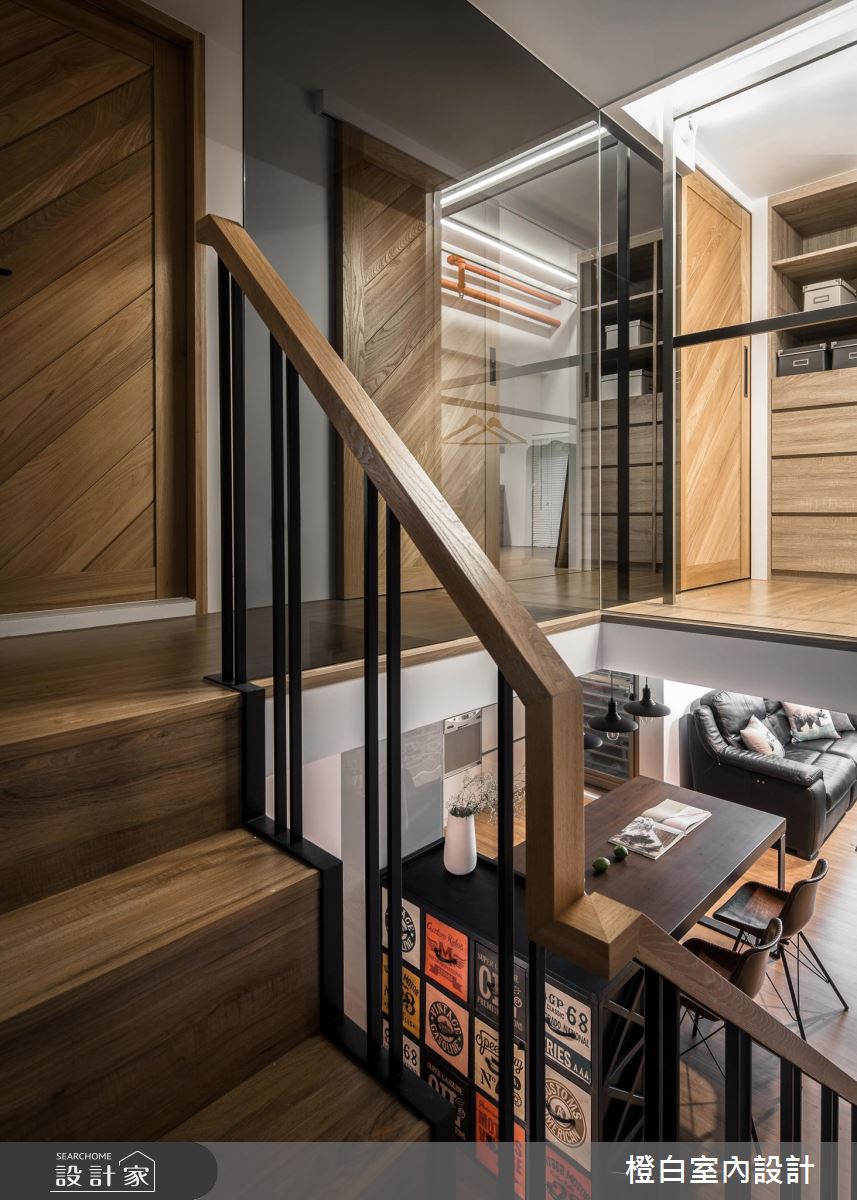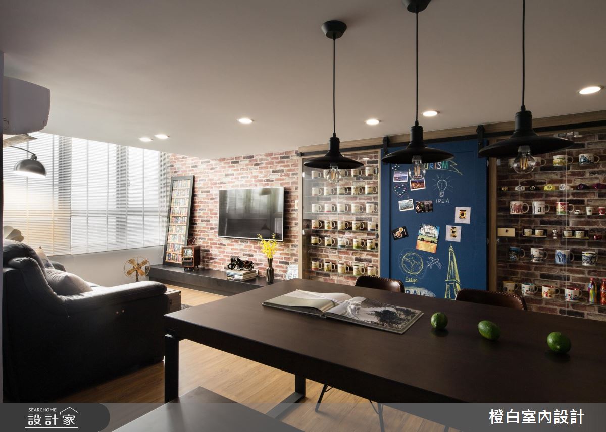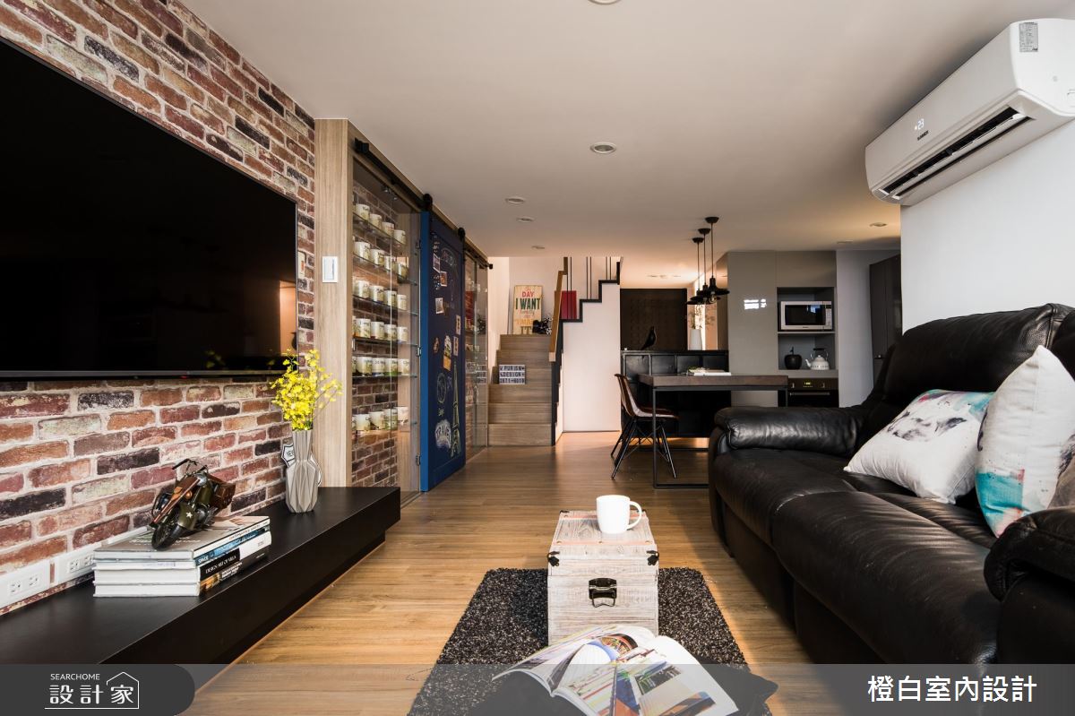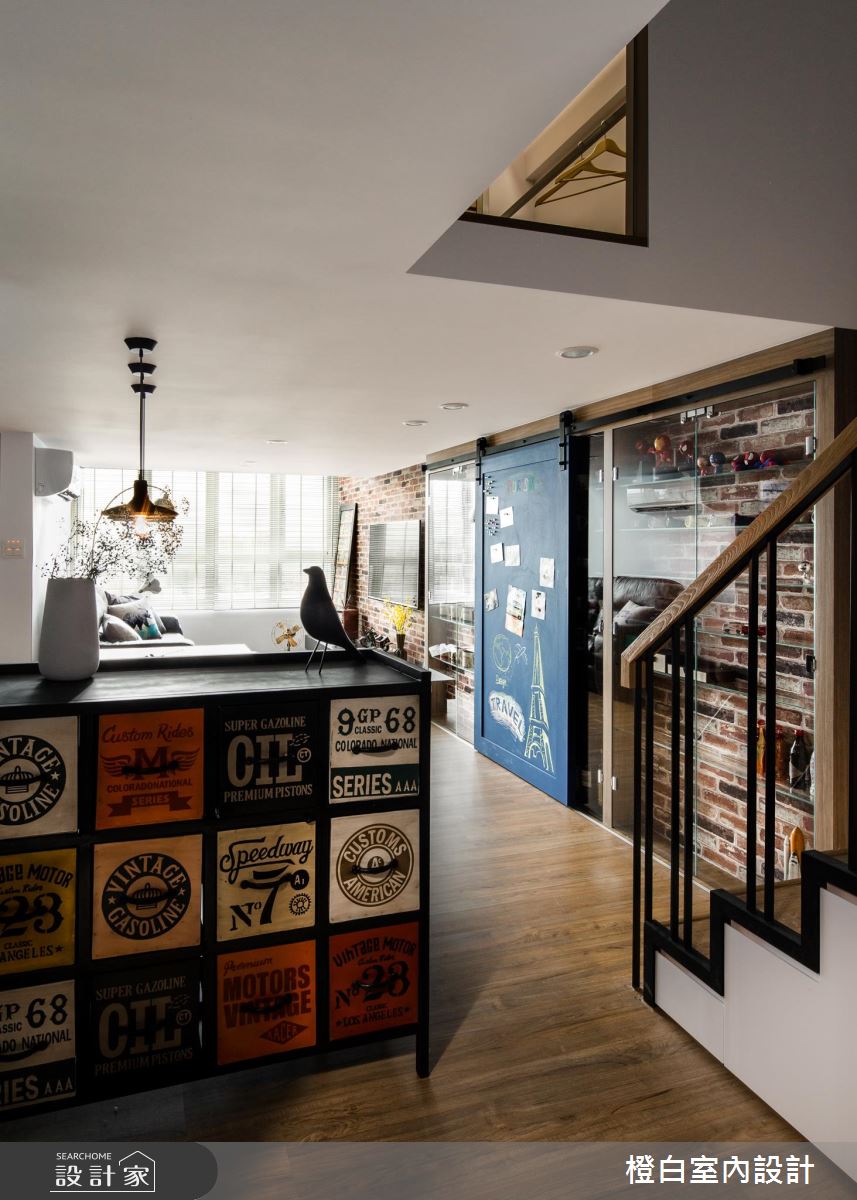 公領域中,設計師讓客廳、餐廳、廚房三者形成互為開放的關係,網羅更多空間感,並將整道電視牆作為主題焦點, 由紅磚鋪述背景,搭配琳瑯滿目的馬克杯陳列,以及俏皮的藍色門片、相片裝飾等,演繹復古而隨興的美式精神;而收納規劃也是設計中重要的一環,利用樓梯下方做出儲物空間,完善每一項生活機能,並在梯間側牆加入可透光的深色灰玻建材,串起上下層樓視線,同步彰顯隱私度與通透感;私領域則被安置於夾層上方地帶,配置了半套衛浴,麻雀雖小、五臟俱全,在有限坪數裡,打造出最為舒適的個人休寢環境!