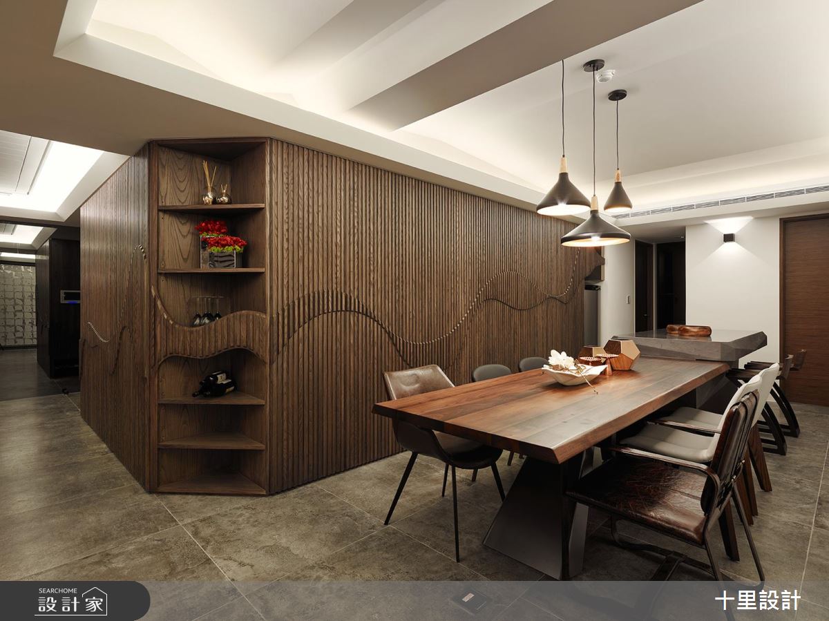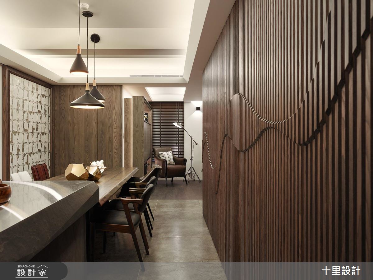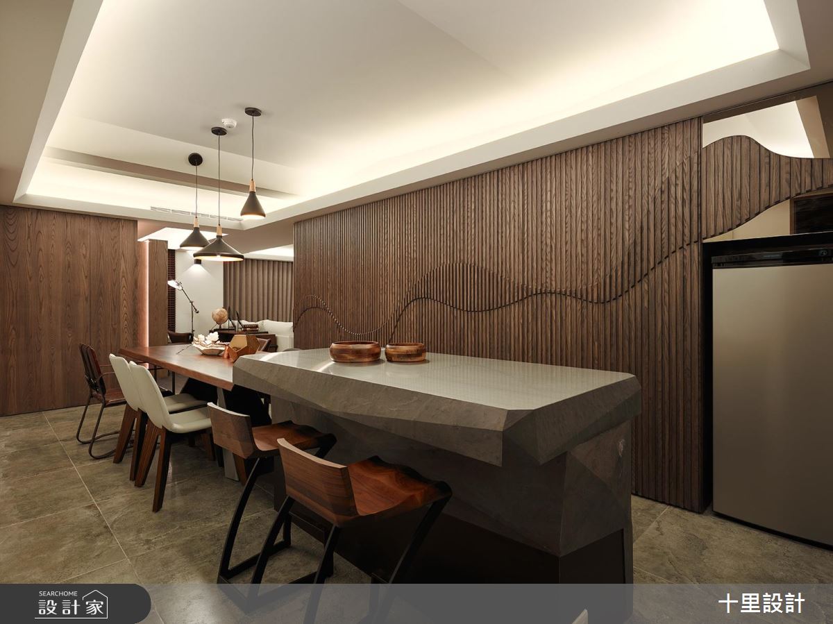 整體挹注安定簡約的氣息,以半拋面石英磚搭配木地板形成地坪界定,將開放的公領域區劃出各自主題性,引申流暢的生活動線走向,同時大量使用重複性的垂直線性,包覆櫃體與立面,藉由簡練靜謐的深邃色澤,搭襯極簡純淨的線條序列,展現量體、牆面的協調風貌;客廳中,則特選帶有天然圓石意象的桌几,上頭擺放一盆植栽加以妝點,搭配 L 型沙發的包覆圍塑,型構樸實具禪味的舒適角落;餐廳場域巧妙將溫潤木作、冷冽石材混搭運用,延伸出加長型的中島吧檯,一側則接續客廳的線性序列,並在轉折處加入展示功能,成功凝聚轉角地帶的視覺焦點;寢臥延續自然的木質紋理,並在床頭加入隱藏式收納機能,以不著痕跡的把手細節撫平牆面表情,而中段透空的展示平檯,則陳列裝飾品加以點綴,演繹具有雅致品味的空間美學!