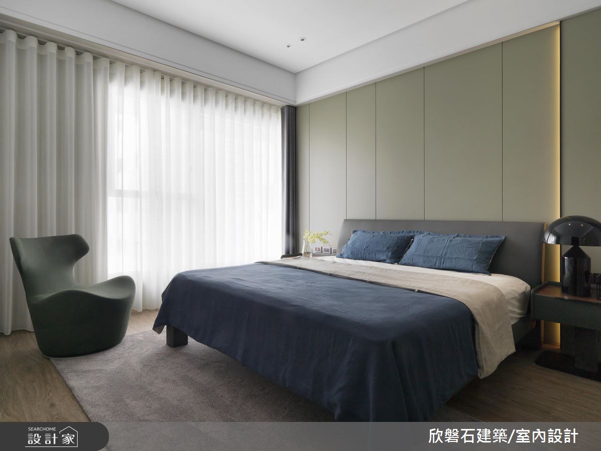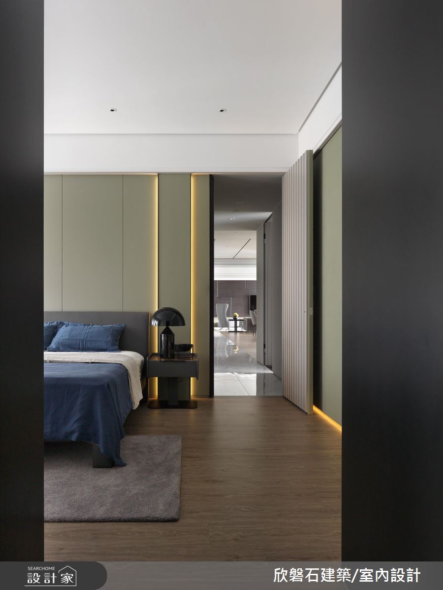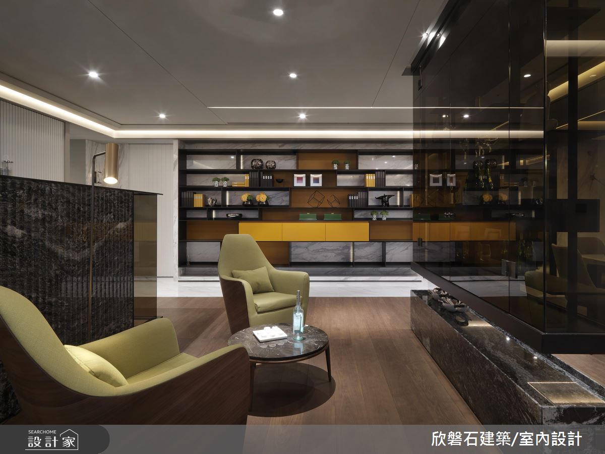 走進這處住宅,大面的落地窗映入一整片城市風景,將視線所及轉換成遼闊的空間視野,當夜晚時分來臨時,拉開窗簾就能欣賞璀璨壯觀的夜景。而開放式的空間則利用家具及展示櫃,為客廳、餐廳、書房界定了各自的專屬領域,廊道一側加入鮮黃、黑色烤漆的鮮明對比,搭配銀狐大理石的拼接,提升了高級精品質感。餐廳旁設置一道玻璃展示櫃,以鏤空、懸浮的設計手法,化解厚實沉重感,帶來更輕盈、精緻的感受。私領域則藉由淺綠、木質色系,營造出寧謐、放鬆的溫潤氛圍,再以簡約的線條刻劃時尚個性,打造出兼具質感和舒適度的睡眠區。