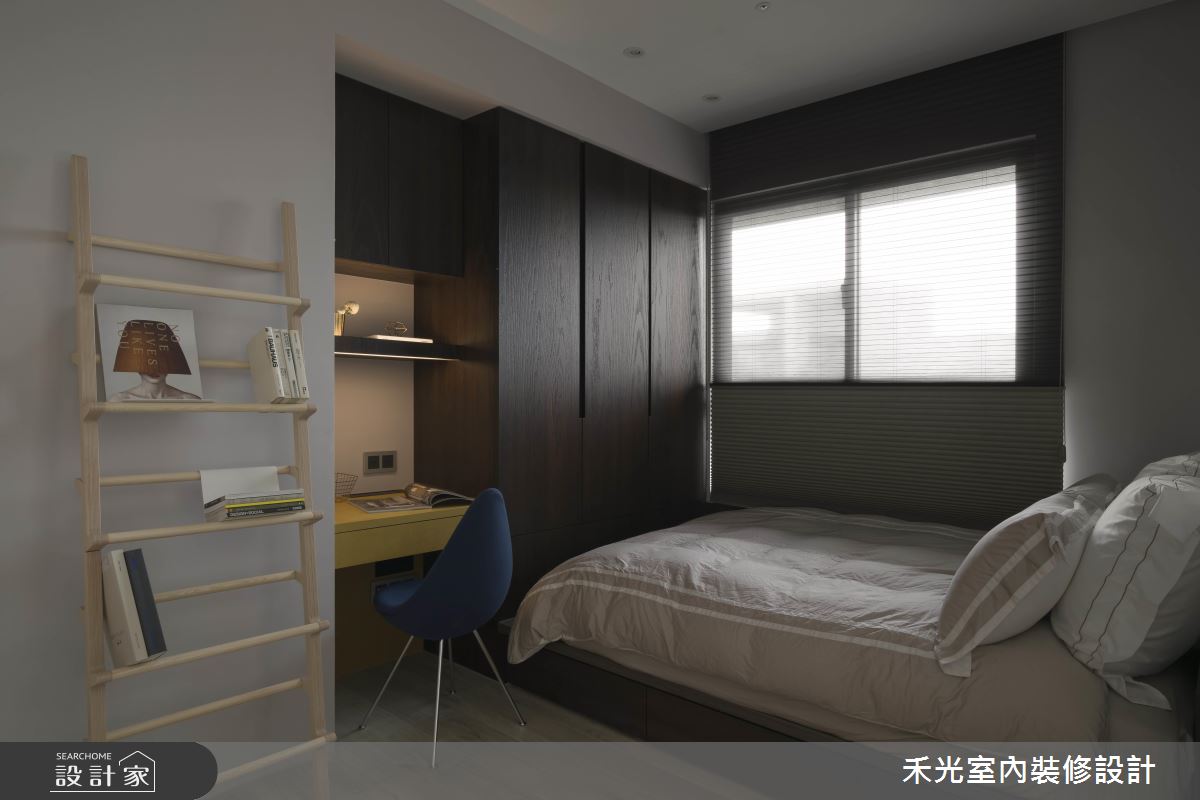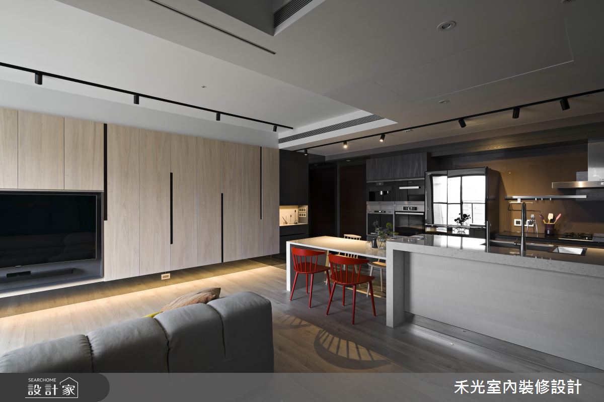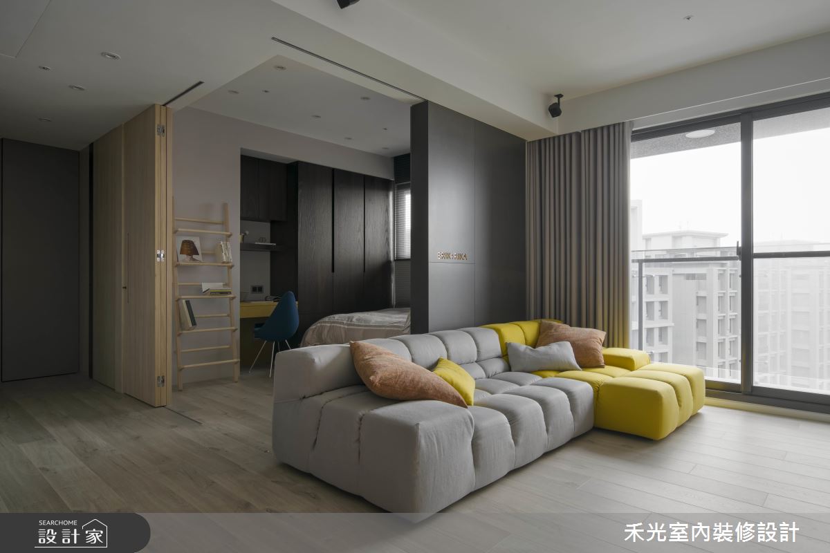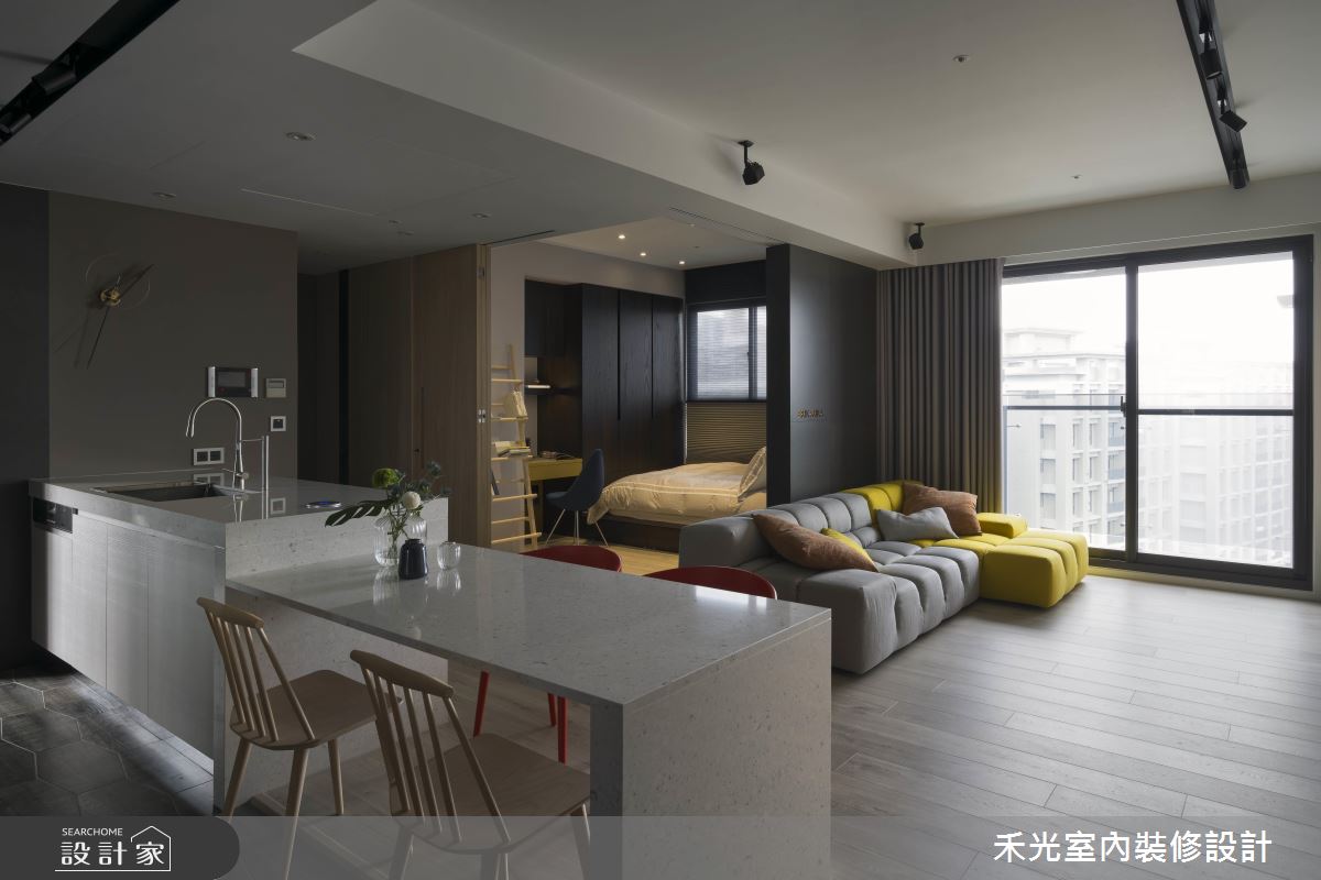 進入空間,設計師以開放式設計手法,圍塑出客、餐廳與多功能房的一體共鳴,再運用陽光形成串聯,打亮整體居宅、創造自然氛圍,同時引用鮮豔的軟件跳色,搭佐濃厚俐落的線條感,注入清新年輕的廳區印象;沙發後方則配置一道烙印著屋主記號的沃克板立面,並與推拉門結合,必要時可將後方房間完全隱匿,打造出充滿彈性的生活情境;餐、廚區域則佔去整個家的1/4領域,被視為核心之處,延長的中島吧檯,匯集了用餐、閱讀與輕食等多功能,可讓三五好友在此佇留圍繞、凝聚情感互動;寢臥內,刻意採用清透灰玻作為睡臥、浴室的隔間,使光線可相互流動,並延伸出視線通透性,營造親密且獨立的場域關係!