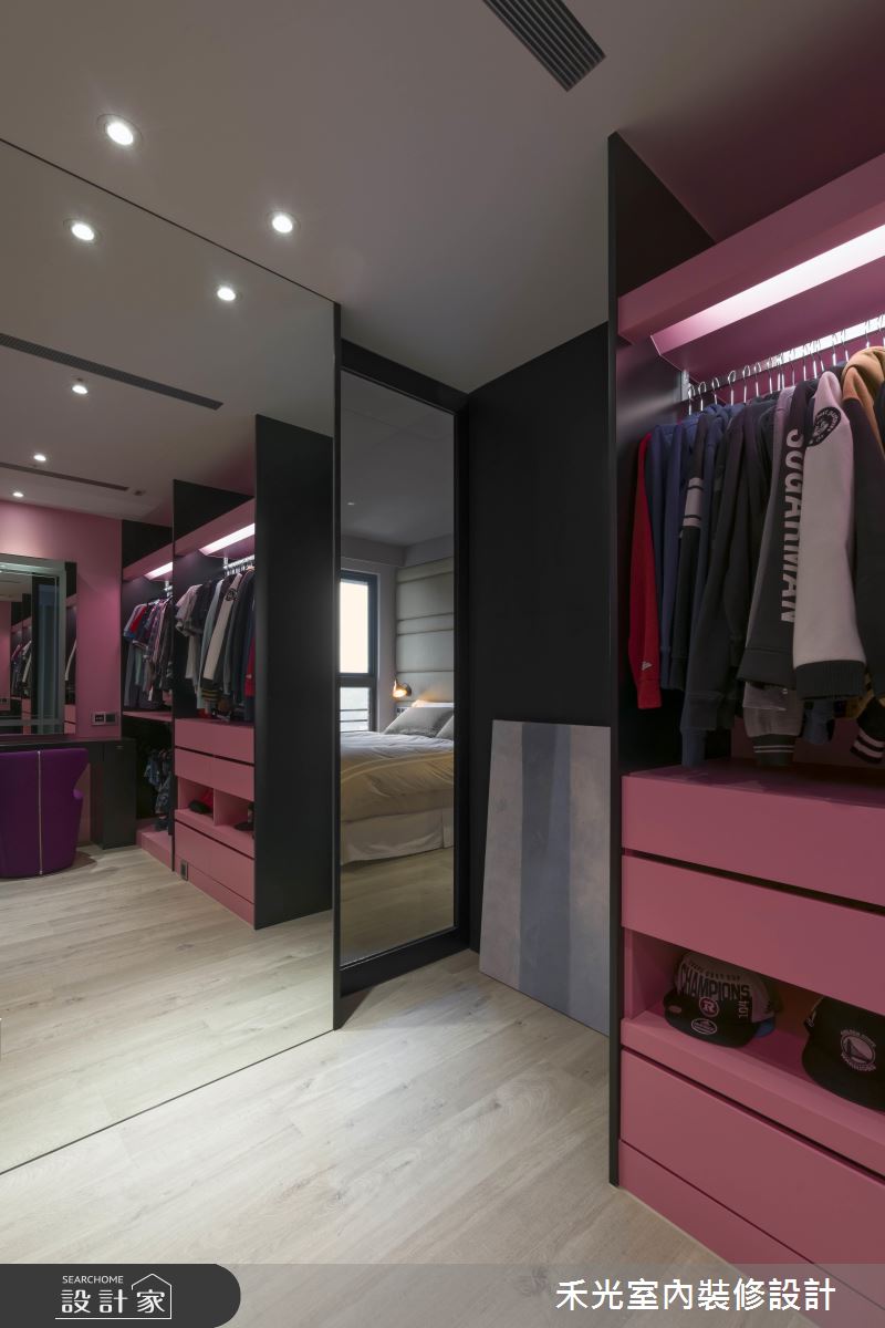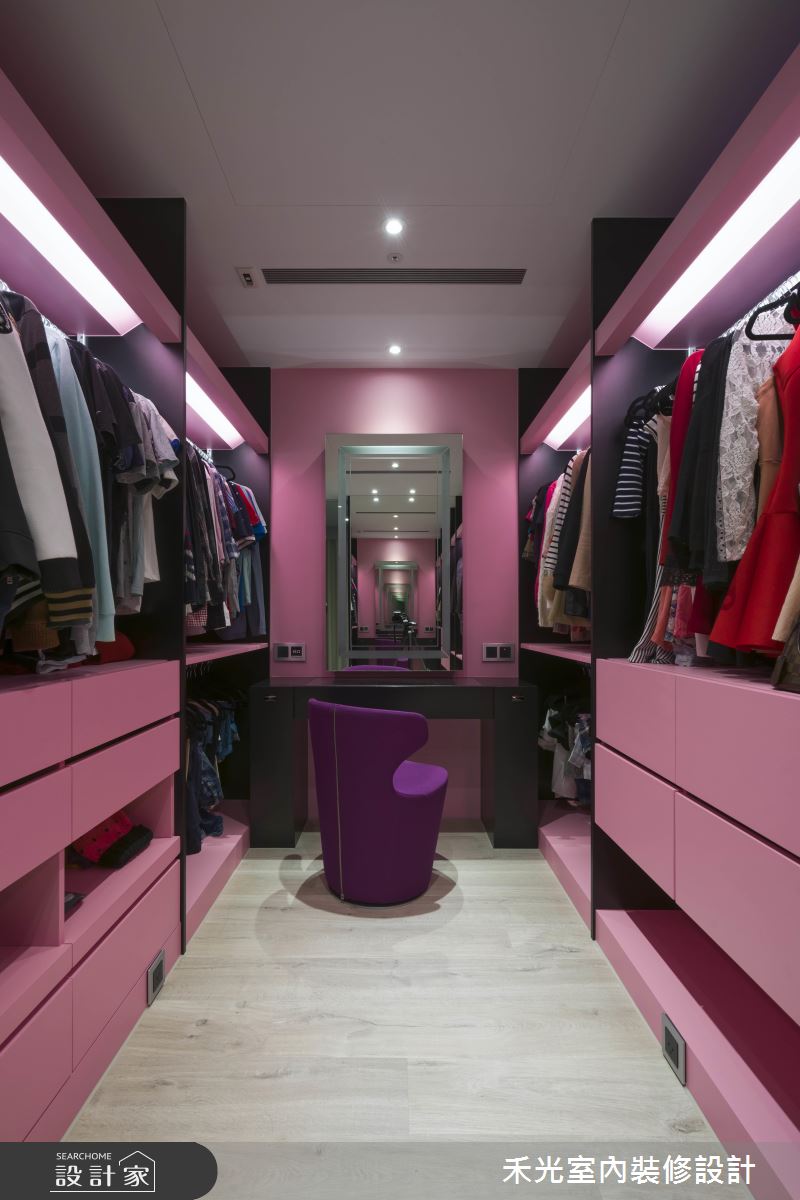 鮮豔的粉紅色更衣間,無疑是居宅的一大亮點,不僅具備充足的衣物收納機能,更滿足視覺饗宴,讓此處儼然成為屋主的摩登伸展台!