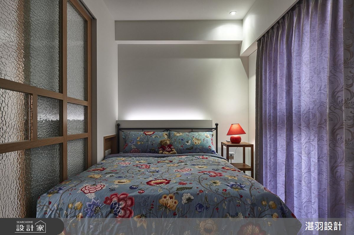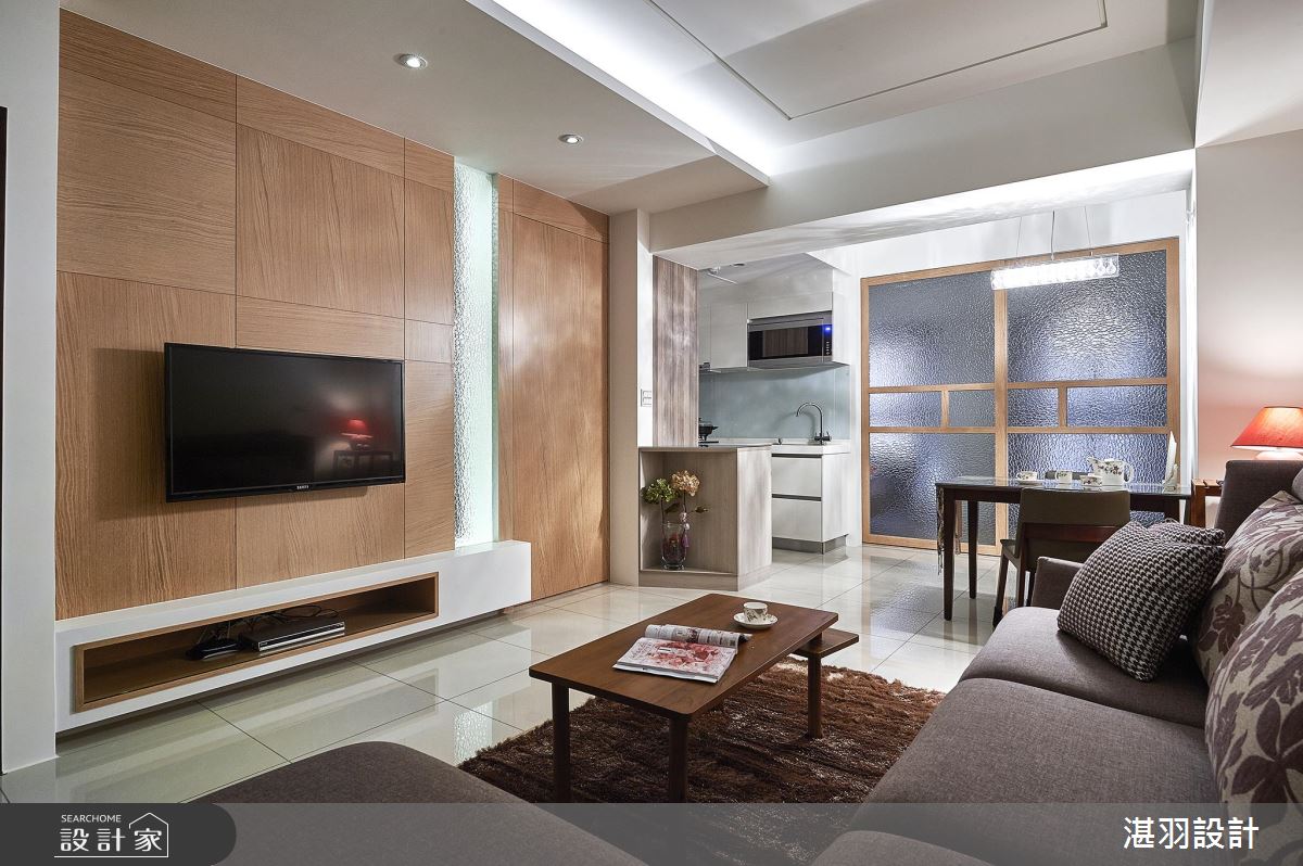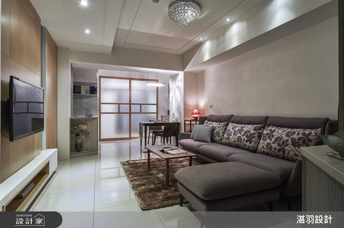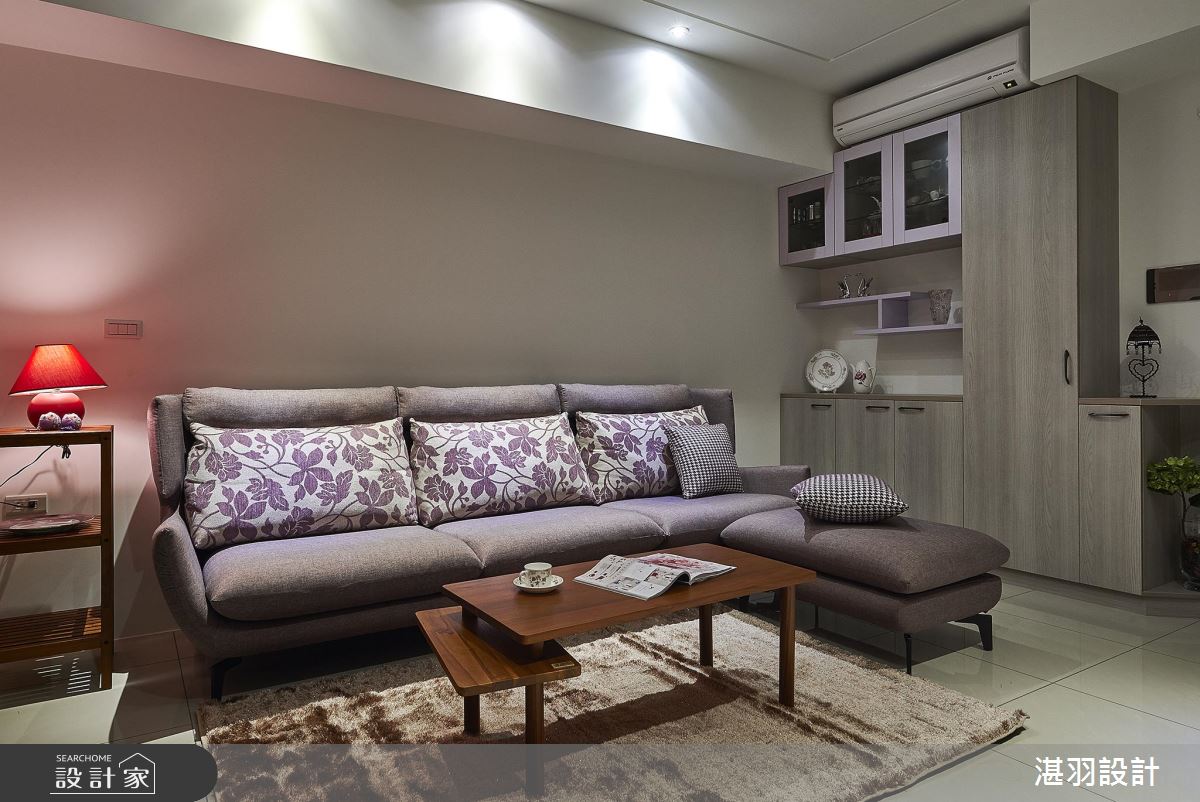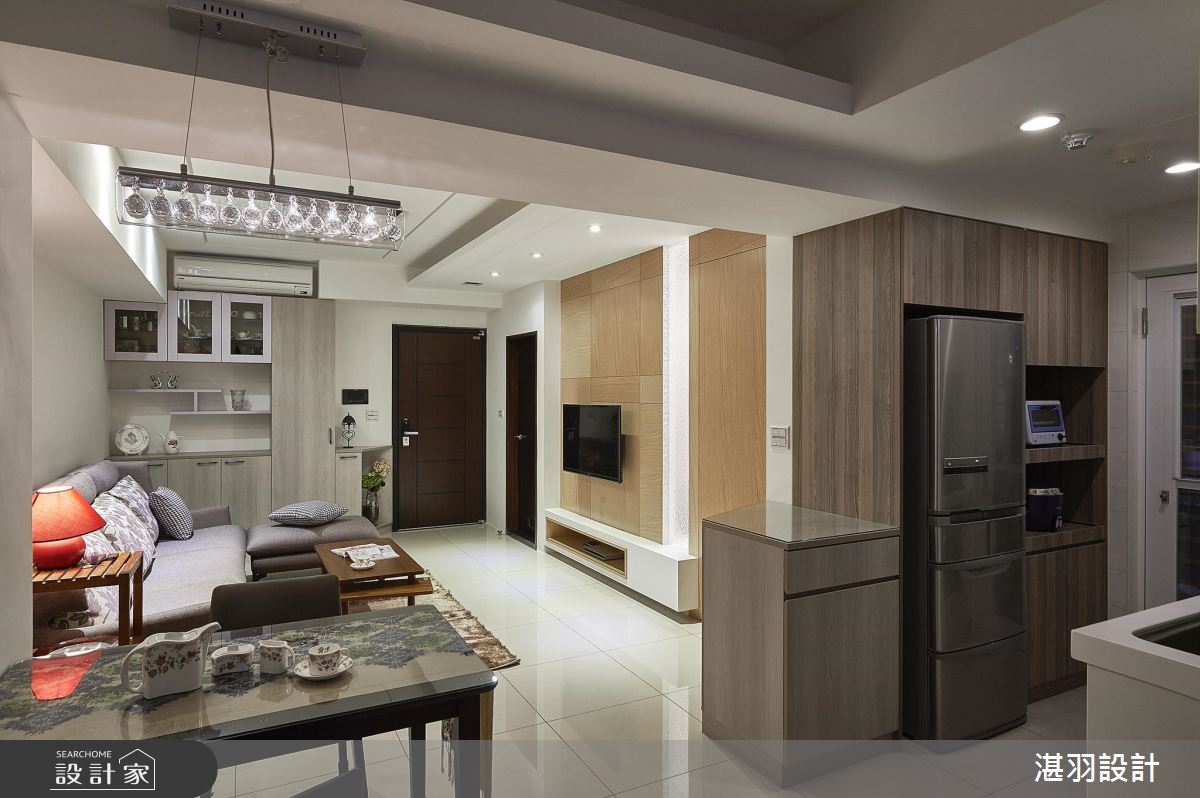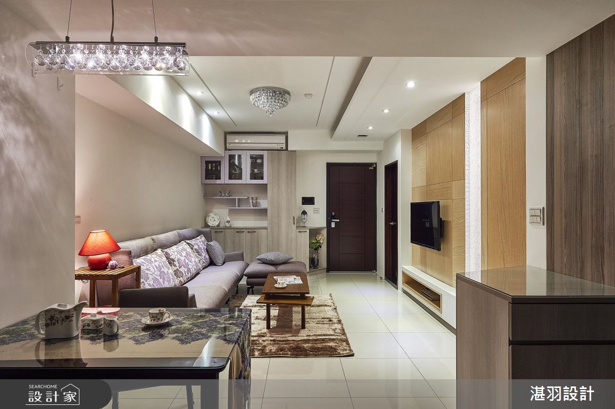 在有限的居家空間裡,創造應有盡有的生活機能,滿足屋主對家的想望。大門的右側壁面,創造出收納鞋與家用備品的櫃體,利用開放與封閉層板造型,搭配簡約的層板線條,展現靈活變化的收納設計;開放的公領域裡,客廳利用L型沙發搭配紫色印花抱枕,天花板飾以華麗感的水晶燈飾,展現屋主優雅的生活品味;電視牆以木作打造,右側拼接水波紋玻璃質材,豐盈視覺變化,晶瑩透亮的材質帶來放大感受;大樑結構的兩側分別規劃餐、廚領域,桌面擺設中式桌布與茶器設計,替餐廳挹注一股東方風情;廚房後方則藉由玻璃拉門,區隔出休憩的主臥領域,玻璃材質的推門設計與電視牆相互呼應,交織完整、和諧的室內造型。