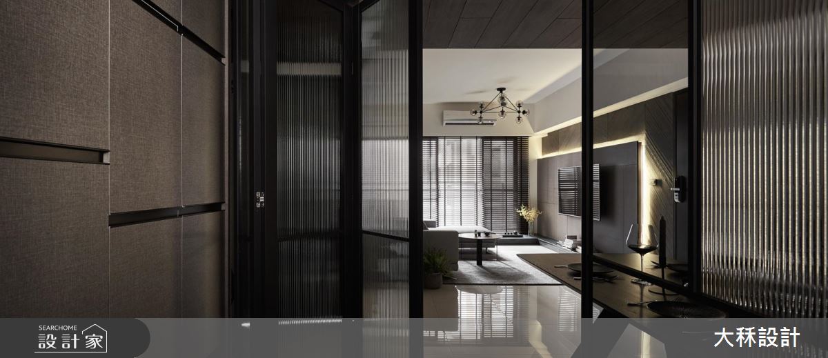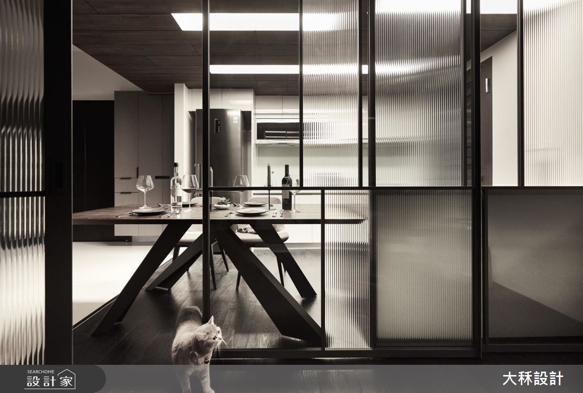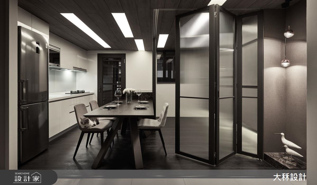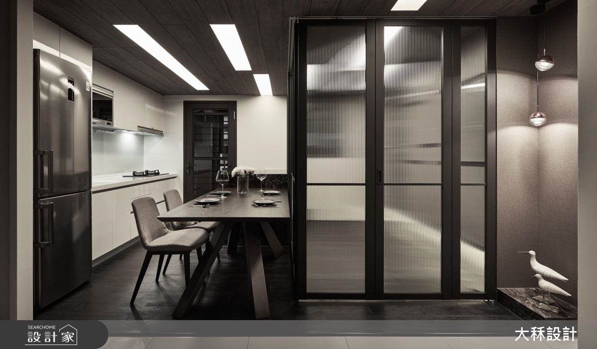 居宅內運用大面積的深色鋪敘,營造出內斂冷靜、頗具典雅的時尚風範,並透過天花與地坪的材質差異,分界餐廚和客廳範圍,特別加入燈帶、流明天花、工業風吊燈等,讓每個地帶分別坐擁不同的光影特色;且在有限坪數中,善用玻璃打造隔間,選用直紋玻璃與清玻璃相互拼接,圍塑出可彈性開放的多功能室,運用通透及隱密的雙重特性延展視野,模糊場域之間的明確界線,並以大理石串聯木餐桌,打造迷你實用的中島吧檯,廚房則位於一旁,賦予充滿互動感的生活情境!