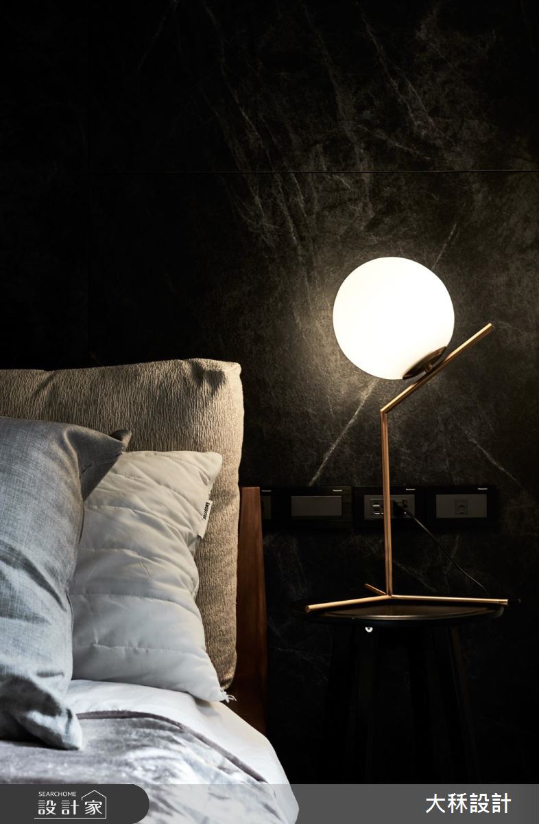 主臥床頭採以大理石為背景,局部搭配嵌入式的燈條照明,同時擺設精緻的圓球造型床頭燈,在沉穩黑調中增加些許華麗!