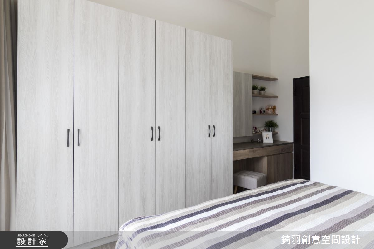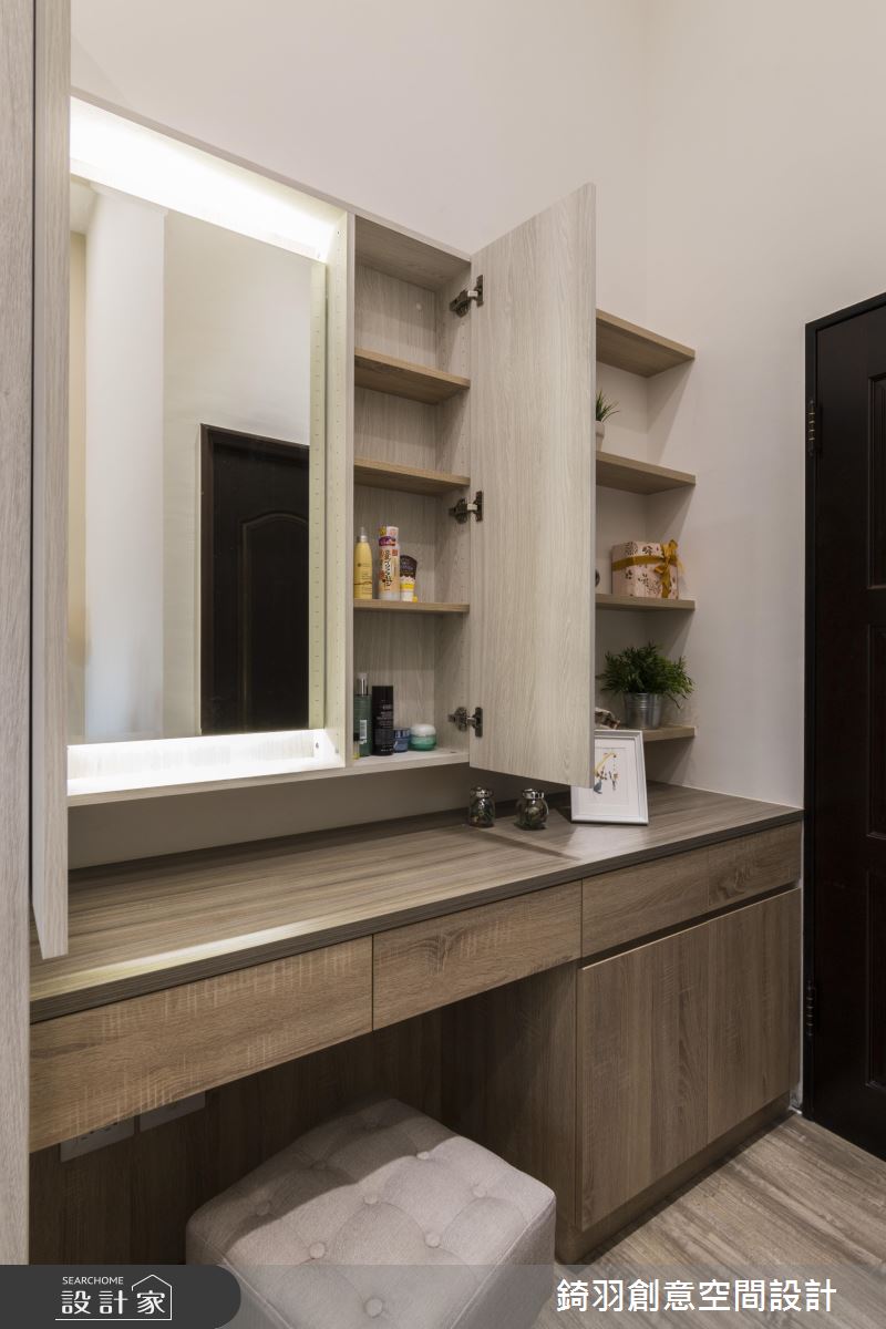 為了化解鏡子對床的風水忌諱,梳妝檯採用開門式的化妝鏡櫃設計,鏡面隨時可以開放或收起,另外也設置燈光和瓶罐的收納空間,使用上更加便利。