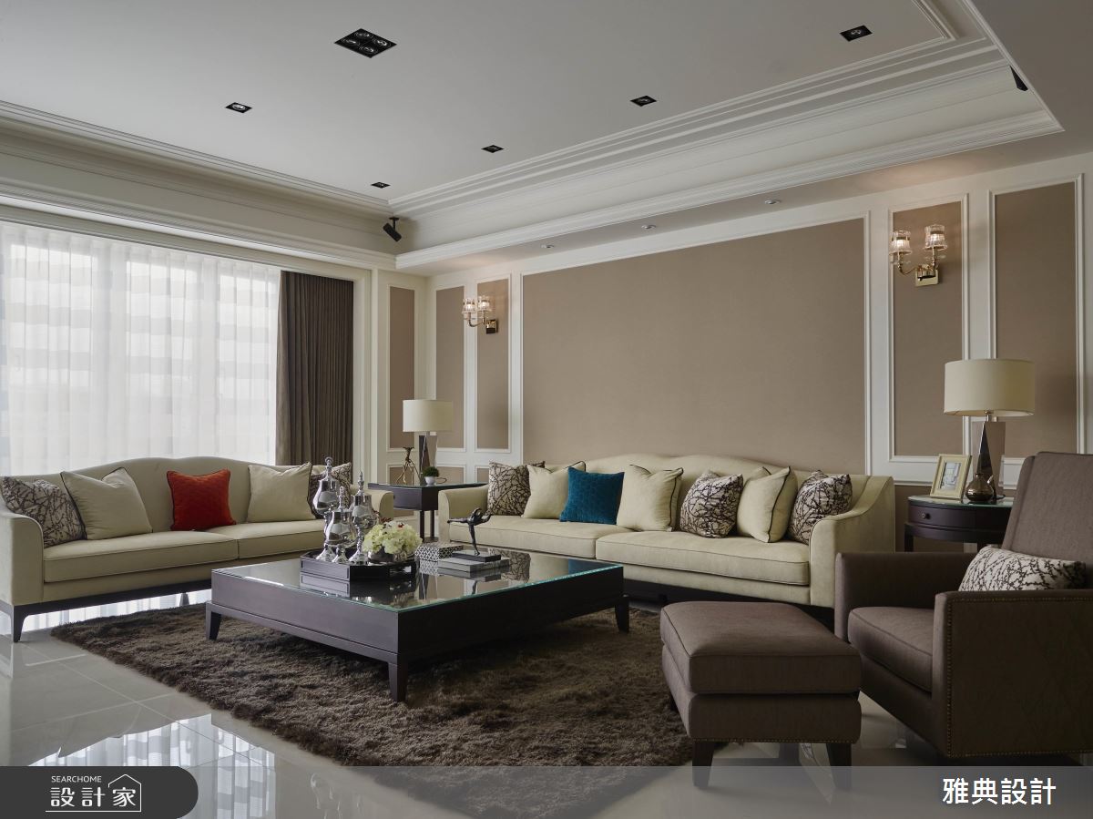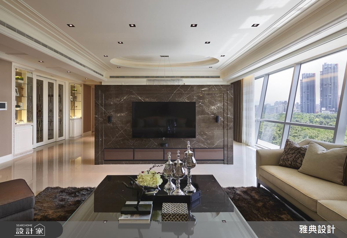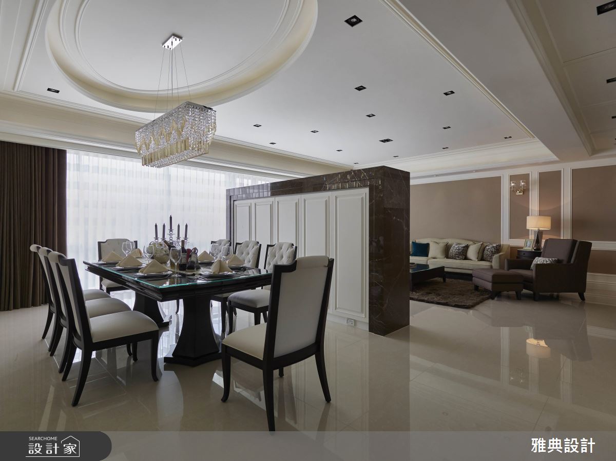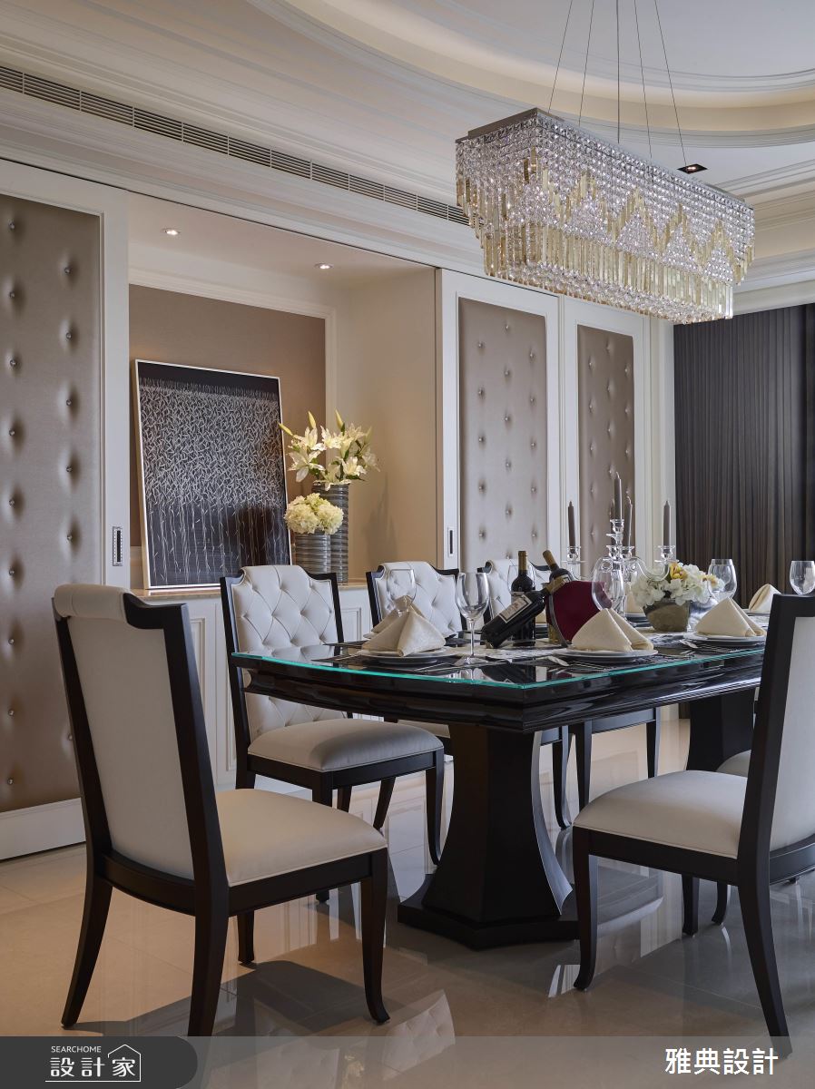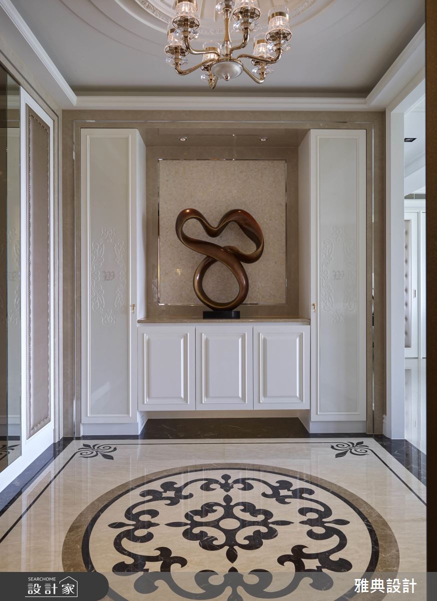 玄關是室內設計的一大焦點。漸層的天花板飾以水晶吊燈,地坪利用石材水刀拼花舖陳,隱喻古典的華麗序曲;前方鞋櫃更內藏貼心的設計細節,兩側鞋櫃烙上屋主姓氏的家徽圖樣,且以施華洛世奇水晶鑲嵌其中;對稱櫃體的中央擺設一座弧形雕塑品,米色飾以金屬框線的背景,更顯非凡大器,形塑藝術質韻的端景設計。公領域裡,整排的落地窗將一片樹海與城市之美納入室內設計裡,隨著四季更迭與日夜交替,藉由光線變化的投射,烘托視覺的層次變化;以米、金色系為客、餐廳主色調,局部搭配大地色系,烘托領域核心,調和溫潤、沉靜的空間氛圍;半高石材打造電視牆,同時成為客、餐領域的分水嶺,不置頂的高度、兩側保有走道,創造通透、流動的室內氣息;餐廳領域裡,繃皮飾以收納門片,中央矮櫃以畫作與花卉陳列,營造出奢華又不失人文的美學氛圍。