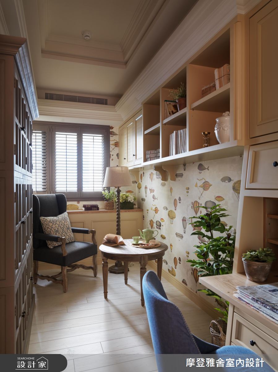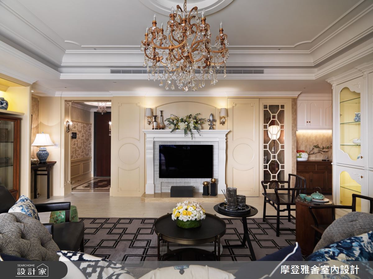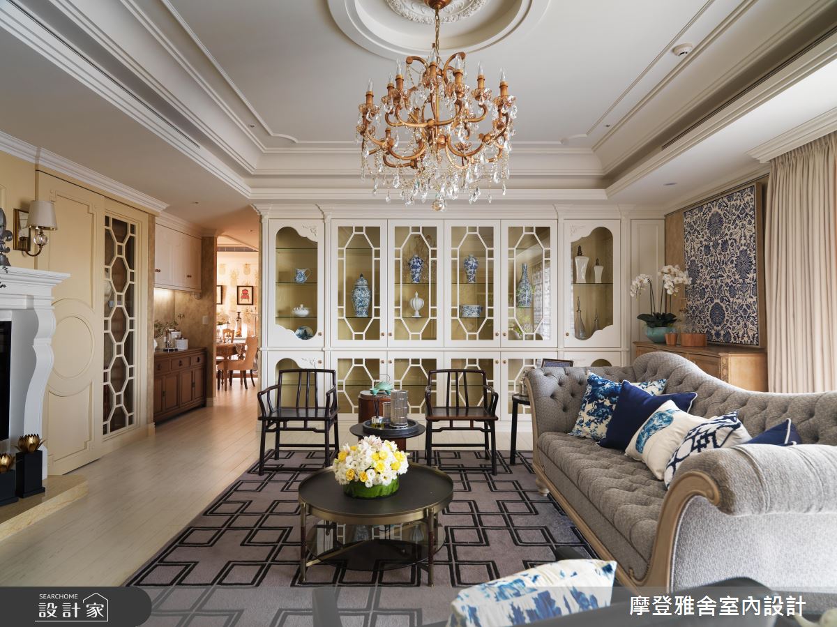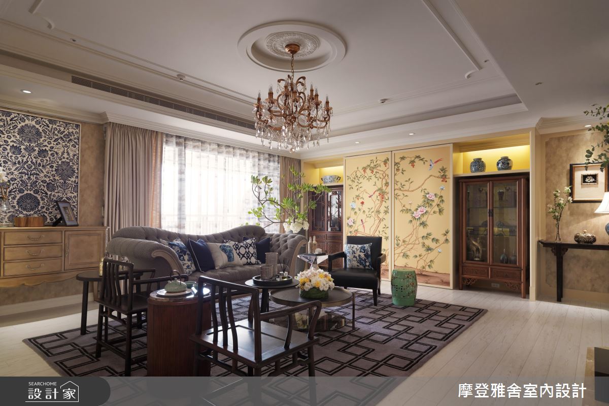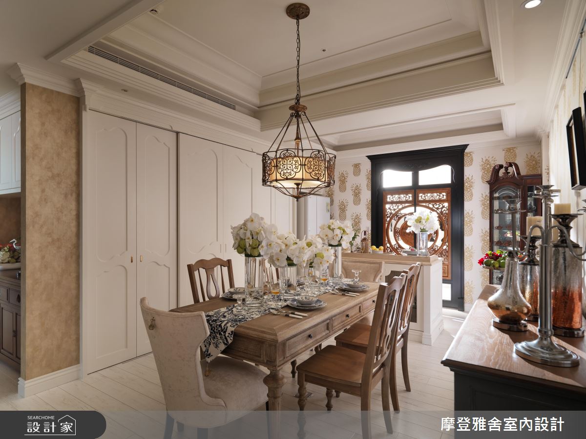 設計師首先拆解公領域一道牆,化解財位問題,達到拓大場域的效果,再運用方型天花結合圓型語彙,闡述天圓地方的概念,客廳則選用淡黃色粉刷牆面,搭配微量的金色妝點,帶出古樸風情,搭配西式線板與中式圓型洞門語彙,創造中西合璧的視覺之美,並採用特殊的雙主牆設計,以「鳥語花香」手繪櫃門對應精品展示櫃,顯示屋主的身分及品味;餐廳則將屋主收藏的古董窗花客製成廚房門片,不僅美化立面,更再造古件新價值,且在周邊立面做出俐落的美型收納,落實清爽的格局視野;回歸到私領域,設計師也給予客製化設計,滿足同堂三代的不同需求,像是長親房即融入羅馬柱與金錢紋窗花,帶入吉祥風水意義,書房以壁紙布藝成就整體風格,帶入令人耳目一新的年輕奔放感!