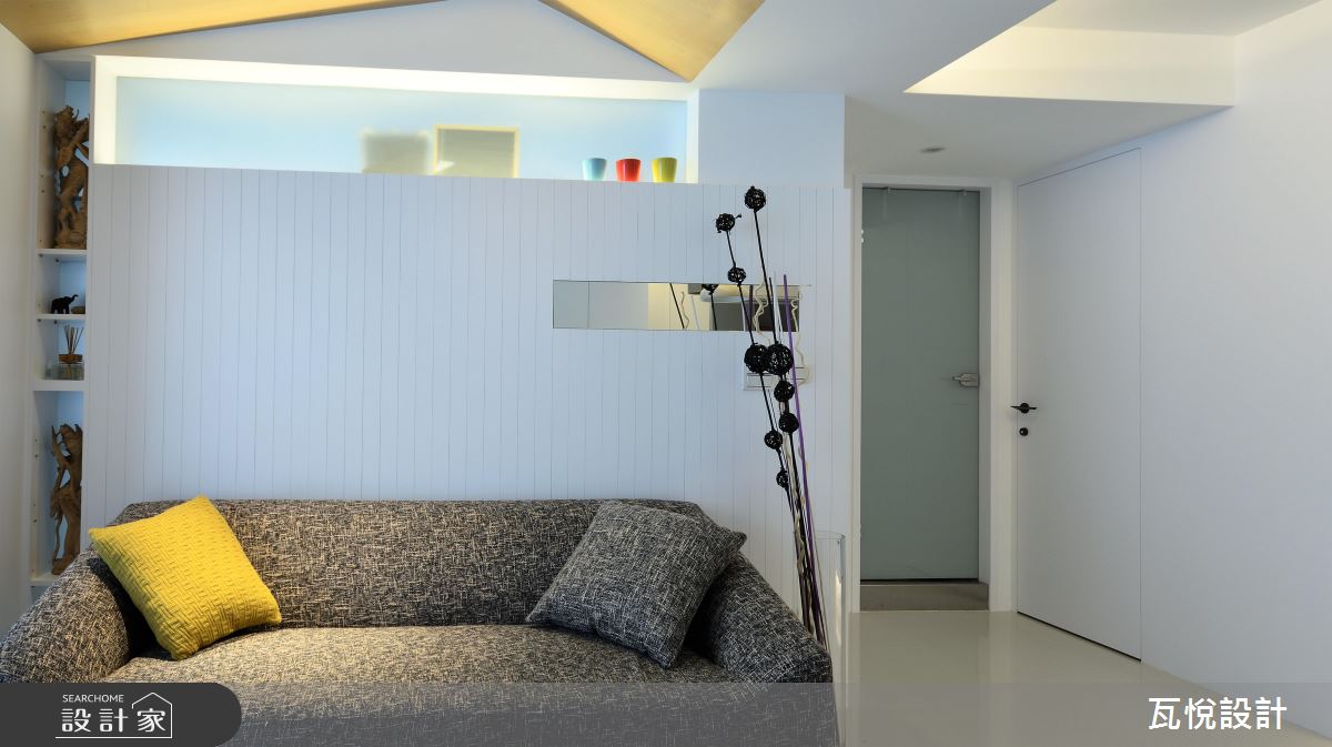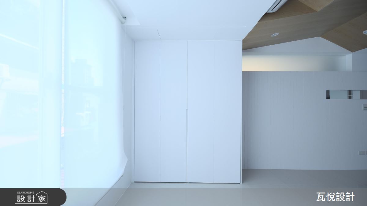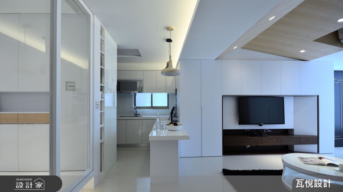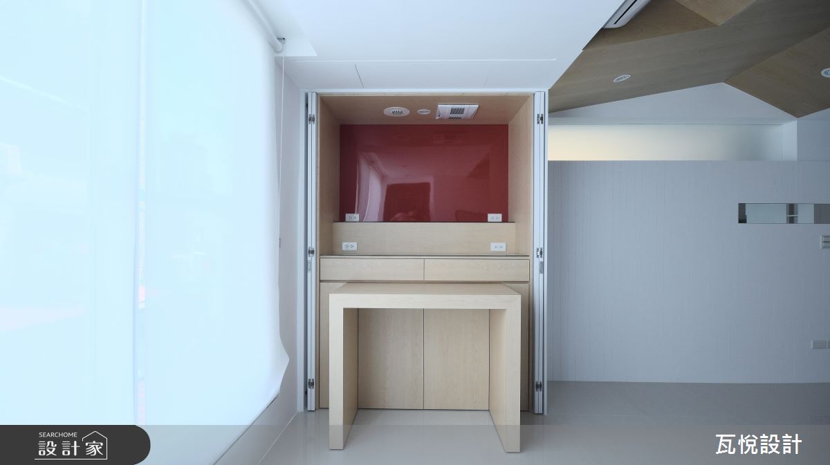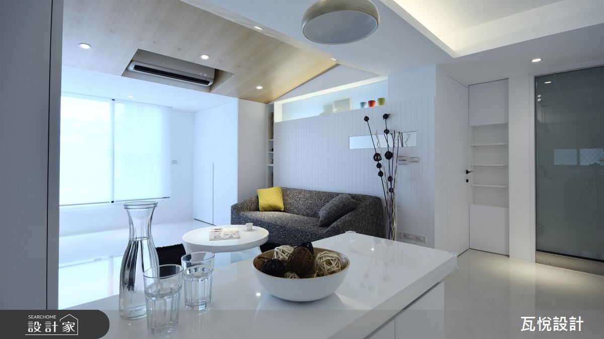 公領域以開闊通透的視覺為主,因此以純白色調搭配俐落線條作為主軸,並依據屋主用餐習性,由廚房延伸的吧台取代餐桌,並以流暢動線串連廚房與客廳。由於客廳天花板的樑柱過近,導致樓高產生壓迫感,因此設計師採用原木材質將天花板修飾為由一大一小三角形組成的波浪式斜屋頂,搭配沙發背牆與電視主牆俐落垂直線條,成功拉抬視覺感受。另一方面,設計師更擴大窗戶面積,並巧妙應用背牆鏡面與多功能次臥的玻璃拉門,創造空間放大、明亮通透的整體視覺。針對最受矚目的收納機能,設計師以「多層次隱藏收納」為主軸,首先,因應風水考量,將神明廳隱於櫃體中,並加裝移動式佛桌;接著將電視牆結合隱藏收納櫃,創造公領域的充裕機能。