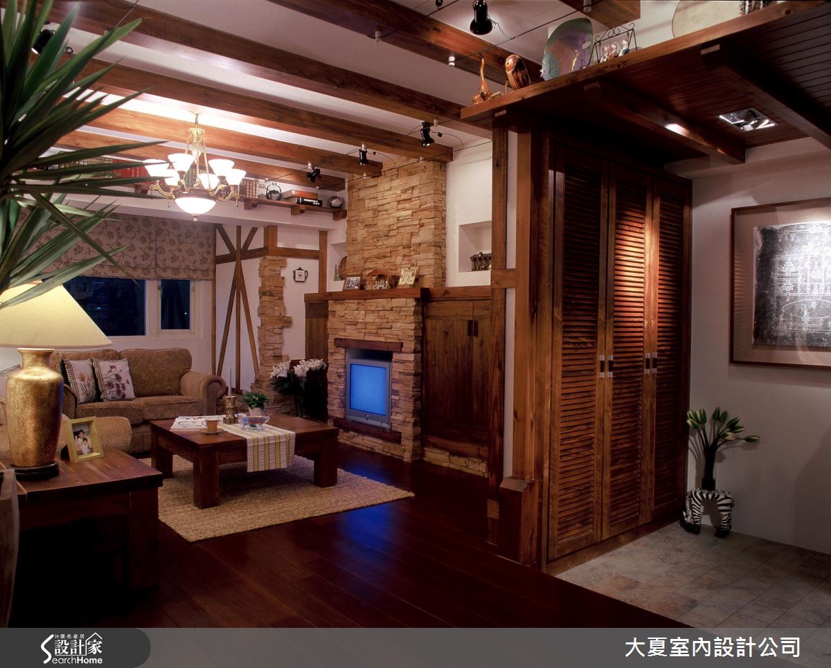 深咖啡色系的原木肌理佈滿空間,從玄關的鞋櫃開始,來到公領域後,成為地坪與天花板的格柵造型,甚至也轉化為室內門片、餐桌椅與中島的自然表情。客廳裡,藉由文化石堆砌出電視牆,展現出粗獷的立面質感,流露出樸實、原味的生活態度,更明確拉出空間的核心領域;客廳旁打造半高窗台,白天時可將窗簾拉開,將戶外的自然風光引入,並運用低矮大樑到天花板間的高度,轉化為書籍收藏的收納機能;大樑與中島檯界定出餐廚領域,壁面擺設中式畫作與意象,挹注濃濃的東方藝術,壁面更藉由內嵌式的櫃體和層板,隨著風格逸品的陳列,豐盈美學生活。