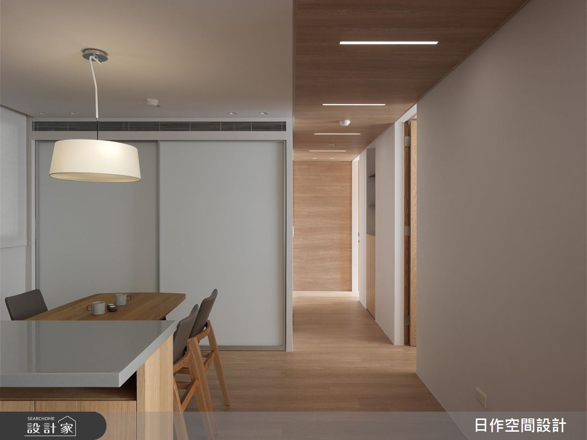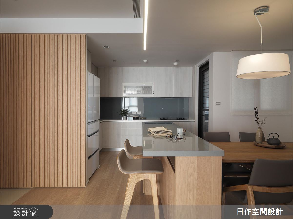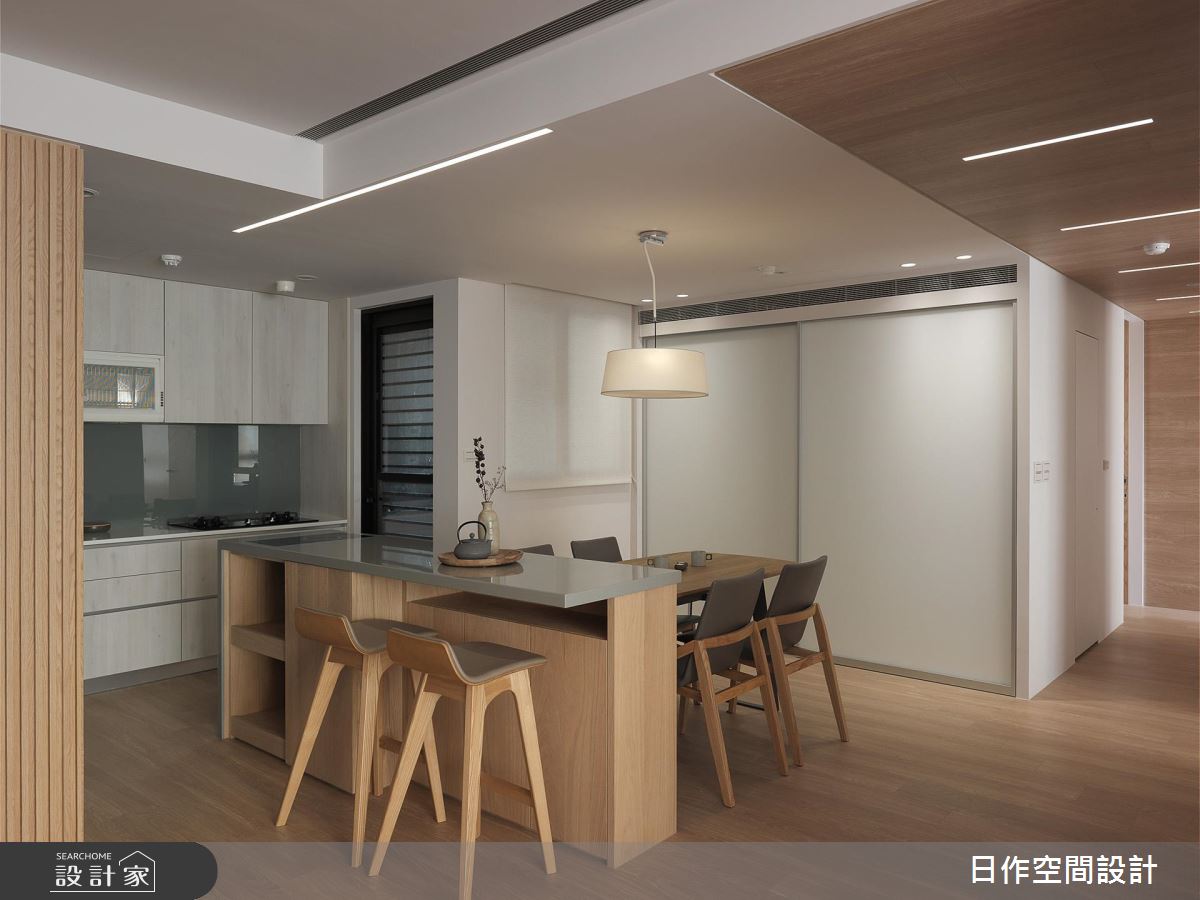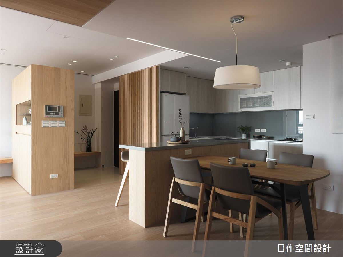 設計師保留了原有 3 房 2 廳的格局,透過簡約風的設計手法,大量挹注橡木、檜木等木質元素,帶來寬敞的大客廳、餐廚比例,並利用櫃體作為界定,在滿足收納需求之餘,也圍塑出玄關的獨立範疇。客廳降低了沙發和臥榻的高度,不但放大空間的視覺感受,輕質量的家具選擇也看起來輕盈而舒適。餐廚區採開放式設計,並在烹飪區和餐桌之間,延伸一道中島吧檯,既可作為備料用途,也可以是夫妻倆談心的私房空間,豐富了多元機能性。