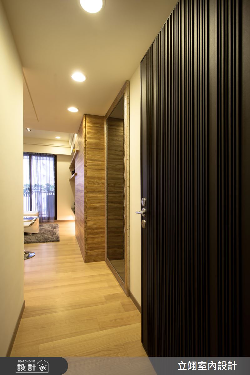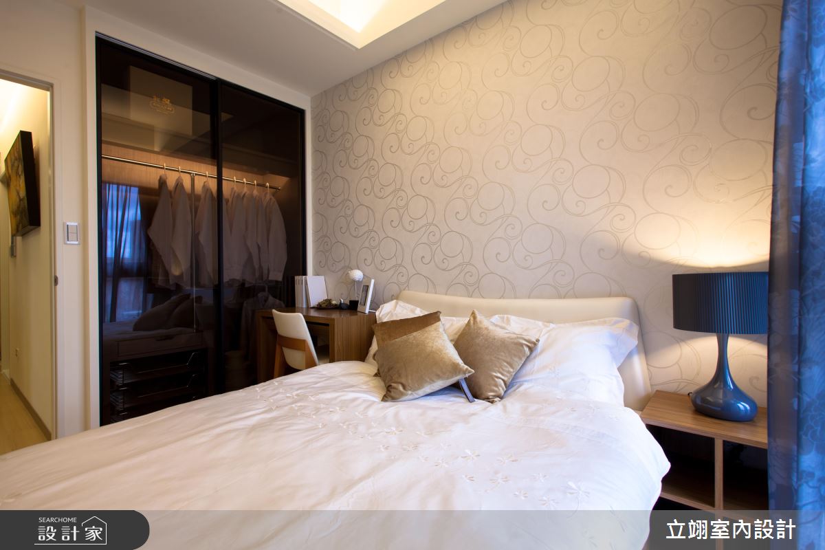 整體透過木皮作為延伸基底,創造場域之間的連結,使空間感獲得充分放大,搭配燈光提點、烘托滿室溫馨氛圍,沙發牆則穿插鑲嵌鏡面,在純淨基調中帶出豐盈層次,裝飾性地營造個性之美;客廳旁規劃一座簡易吧檯,同步網羅輕食與餐廳機能,並讓吧檯量體採圓弧造型,形成既協調又優美的韻律感,且讓吧檯銜接牆面的鏡面材質,形成具放大感的延伸效果;寢臥內,呈現白淨明亮的基調,選用深色玻璃區隔更衣機能,既達成屏蔽目的,也維持了穿透感,讓場域視覺更形通透!
