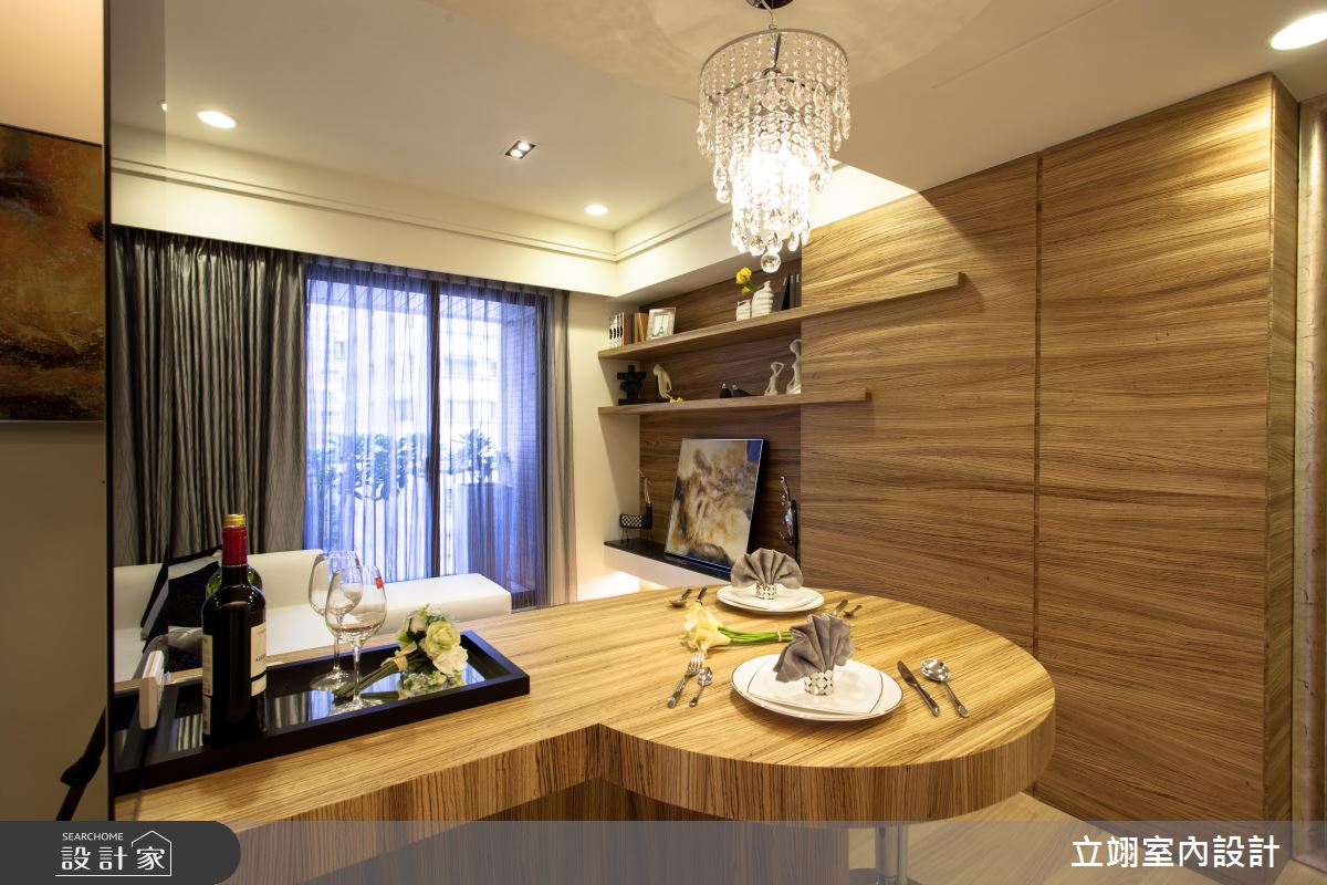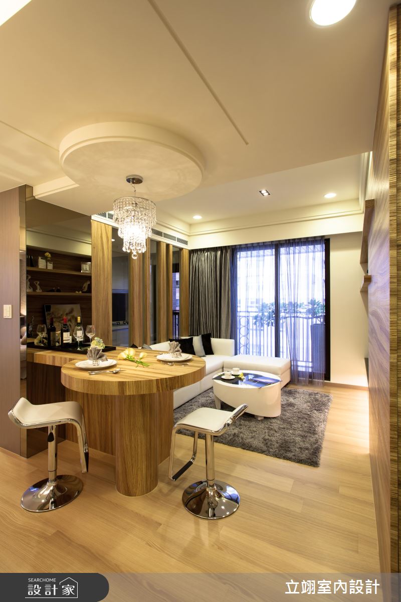 廳區天花加入圓弧造型,帶出線條變化的豐富性,並與底下吧檯形成趣味呼應,搭佐一盞水晶吊燈妝點,替溫潤木質調添注一絲迷人的低奢感!