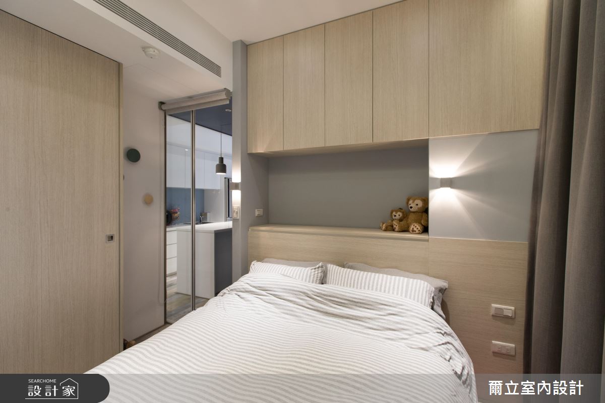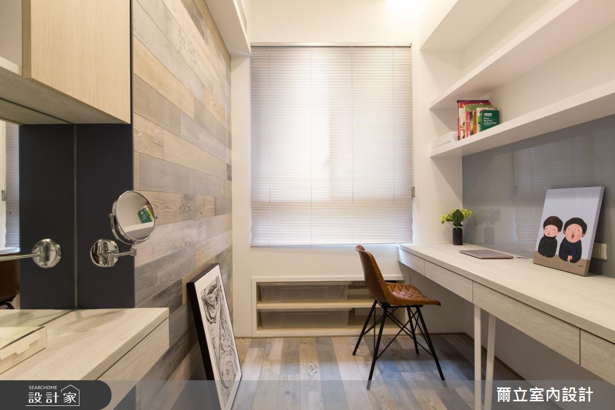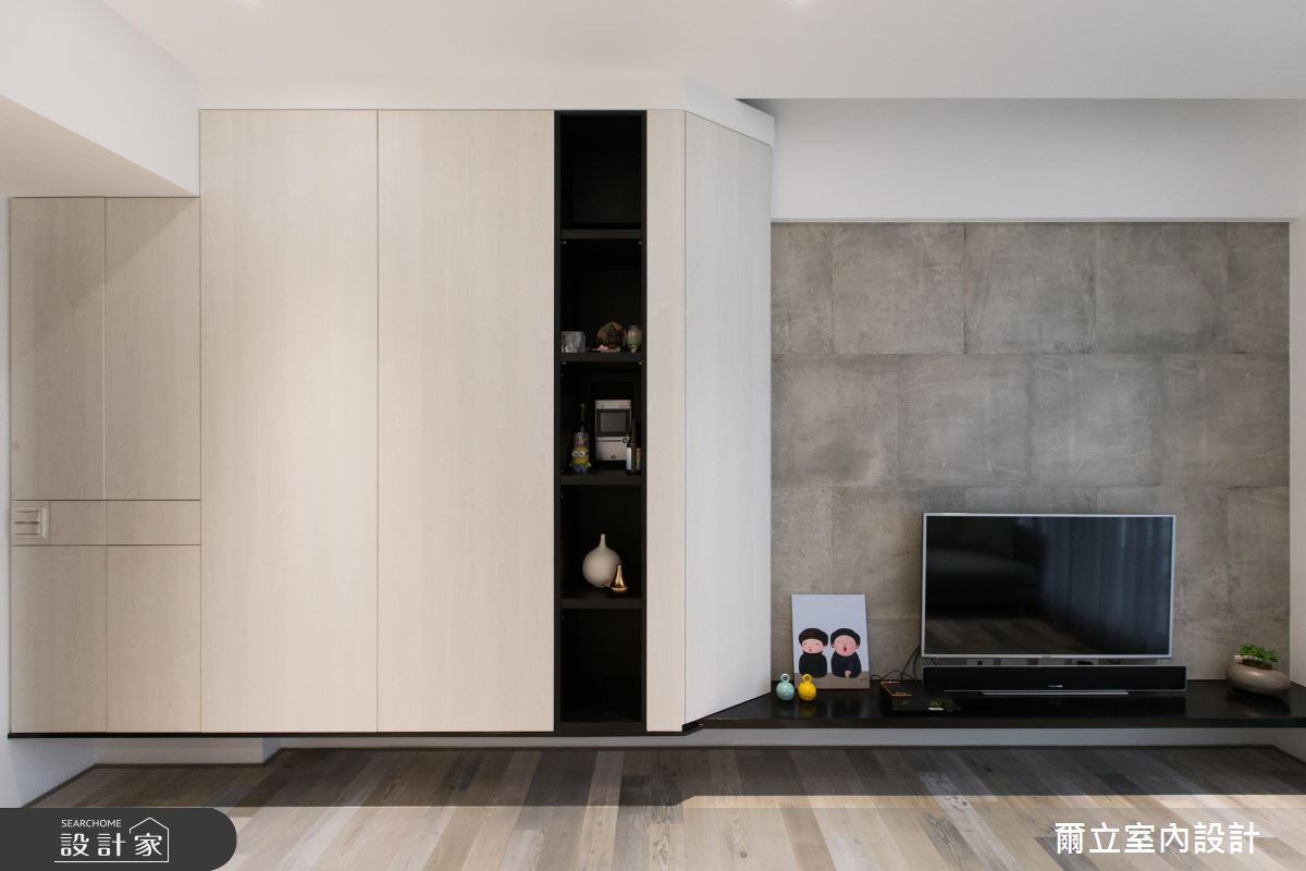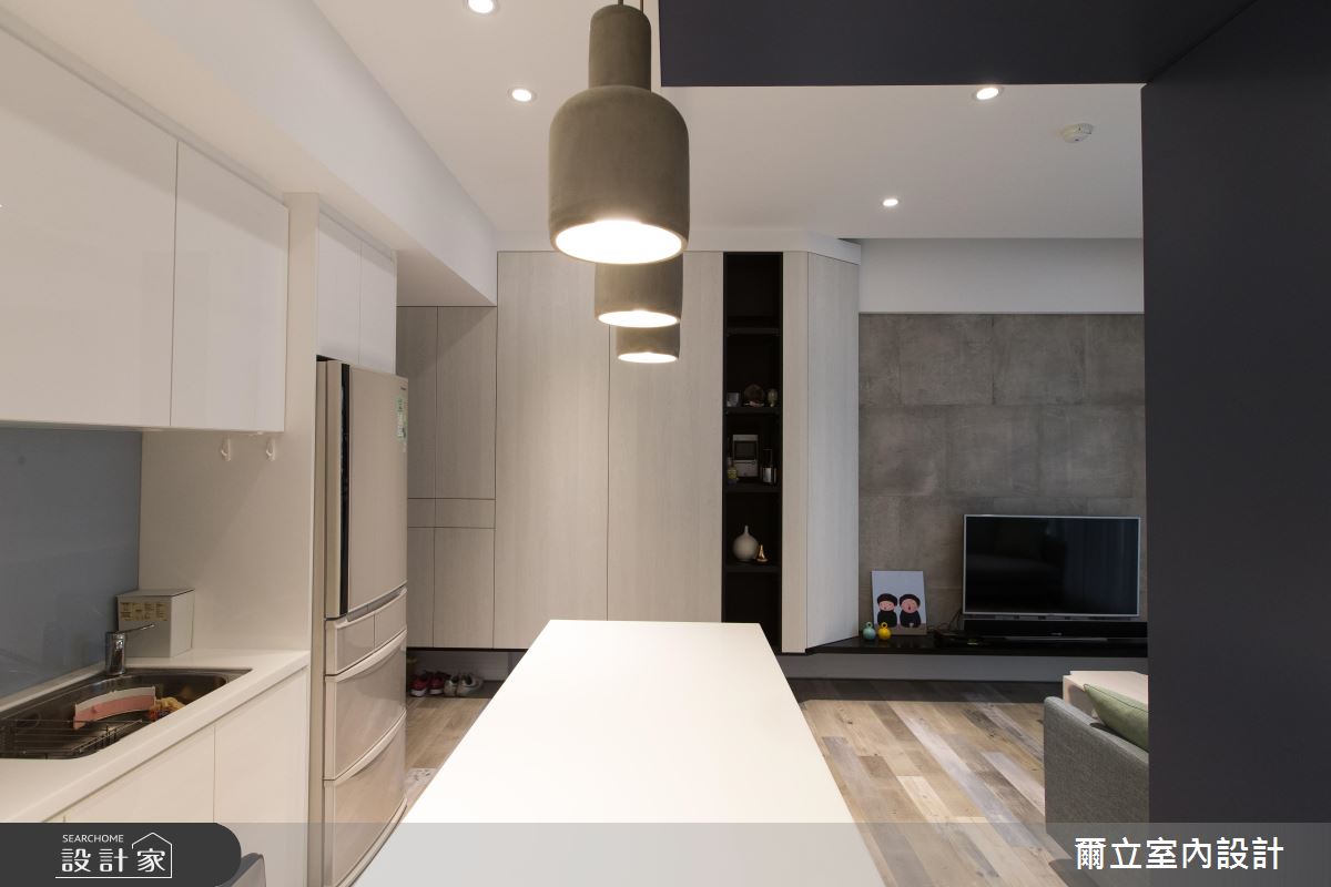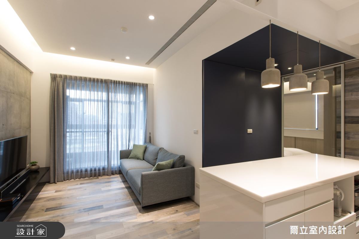設計師透過採光挹注,以及極簡的材質色調運用,營造出居宅的淨透質感,電視牆則刻意採以懸空設計,塑造立面的輕質表情,同時鋪陳深淺錯色的木地坪,搭配灰色的磚石電視牆,延展出天然而溫潤的氛圍;並讓白色延續至餐廚地帶,刻意以一道延伸至天花的深藍色牆面帶出反差,劃出不同的場域主題,再懸吊三盞水泥吊燈強化視覺個性,藉著低彩度的色調安排,讓空間深具清爽中性感;書房、寢臥則延續素雅質地,並結合俐落的量體造型,讓場域雖小卻不顯侷促,體現大方雅致的氣氛!