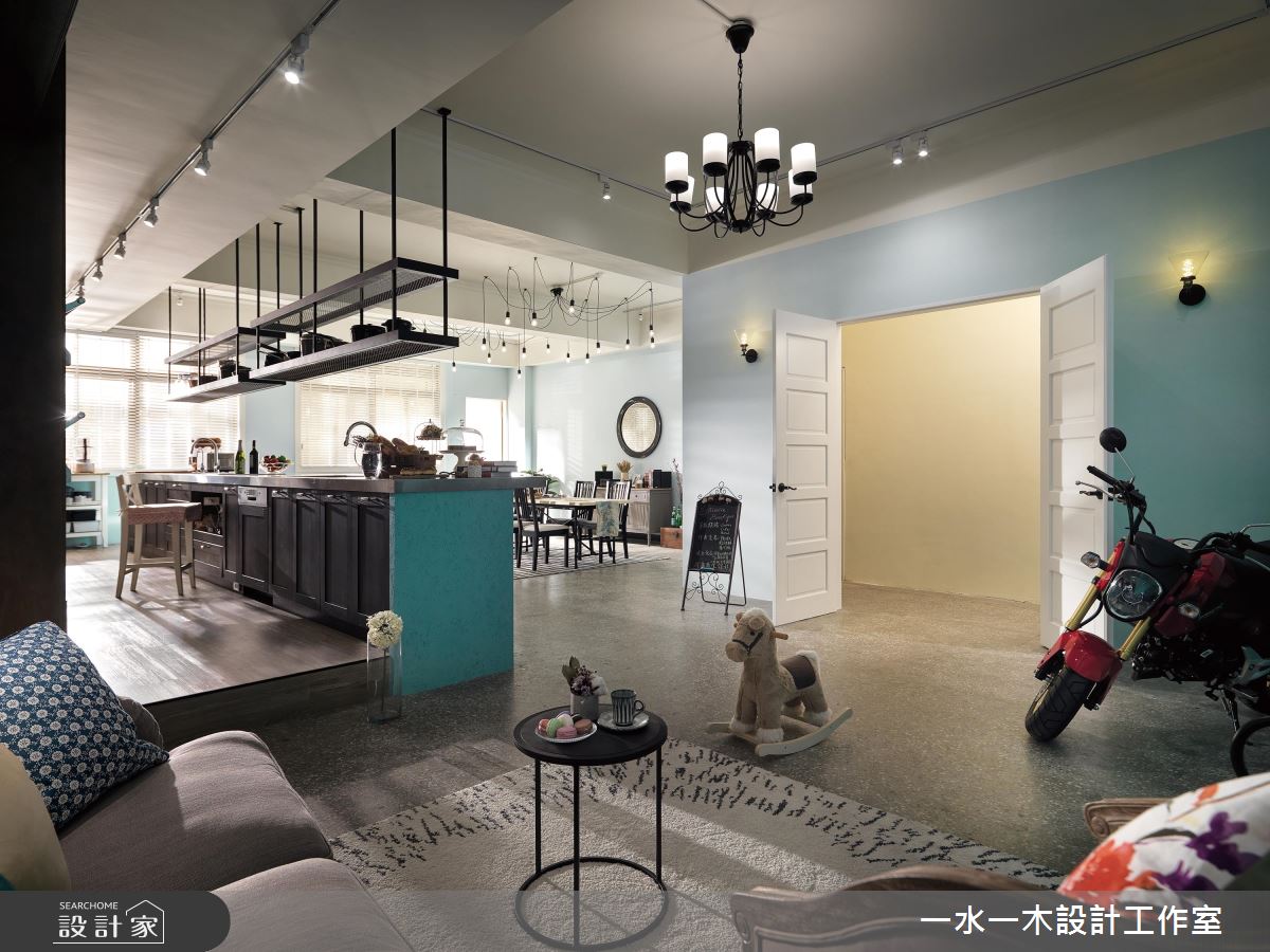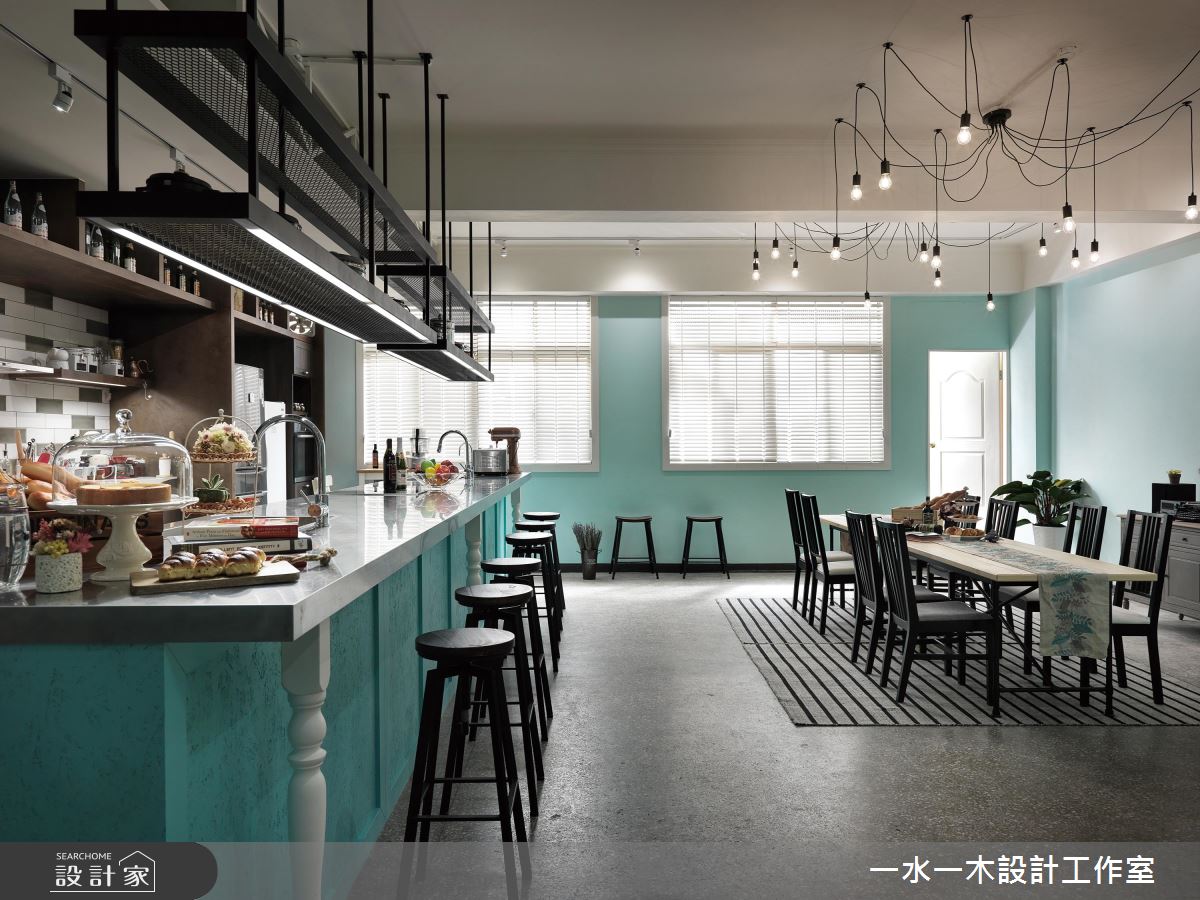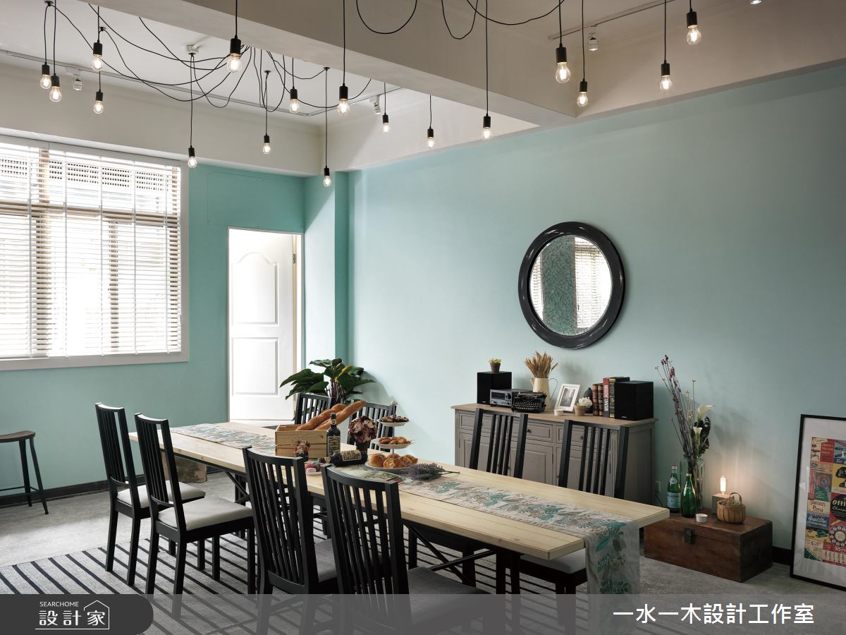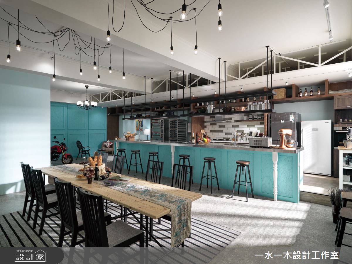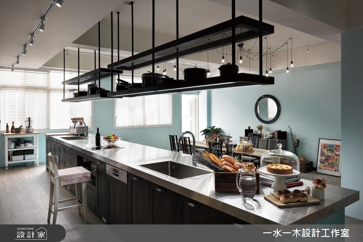25 坪老屋利用各式細節與配件,裝載著滿滿的復古異國氣息,地坪保留原先帶著歷史氣息的磨石子材質,搭配大面積薄荷奶油綠以及純白木百葉,散發經典氣息。烹飪教室最重要的莫過於流暢的烹飪動線,因此設計師以加大的一字型廚房搭配多功能中島吧台,創造豐富的烹飪機能,除了遵循冰箱→水槽→瓦斯爐的優良動線外,更在中島增設水槽與電磁爐、上方設計吊櫃,擴充寬敞的烹飪用度,並以黑白軌道磚與不鏽鋼檯面打造時髦、好清理的廚房樣貌。針對風格營造,女主人精心挑選軟件、家具與家飾,利用木質餐桌椅搭配富有美式氣息的餐櫃與復古鏡,並加入線狀吊燈提升工業風情調。開闊的廚房與用餐空間,讓美食佳餚更有著分享的樂趣。