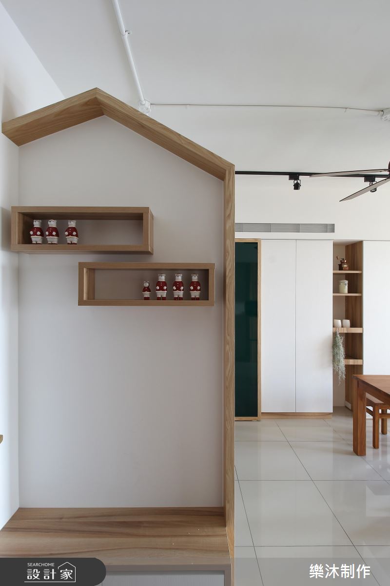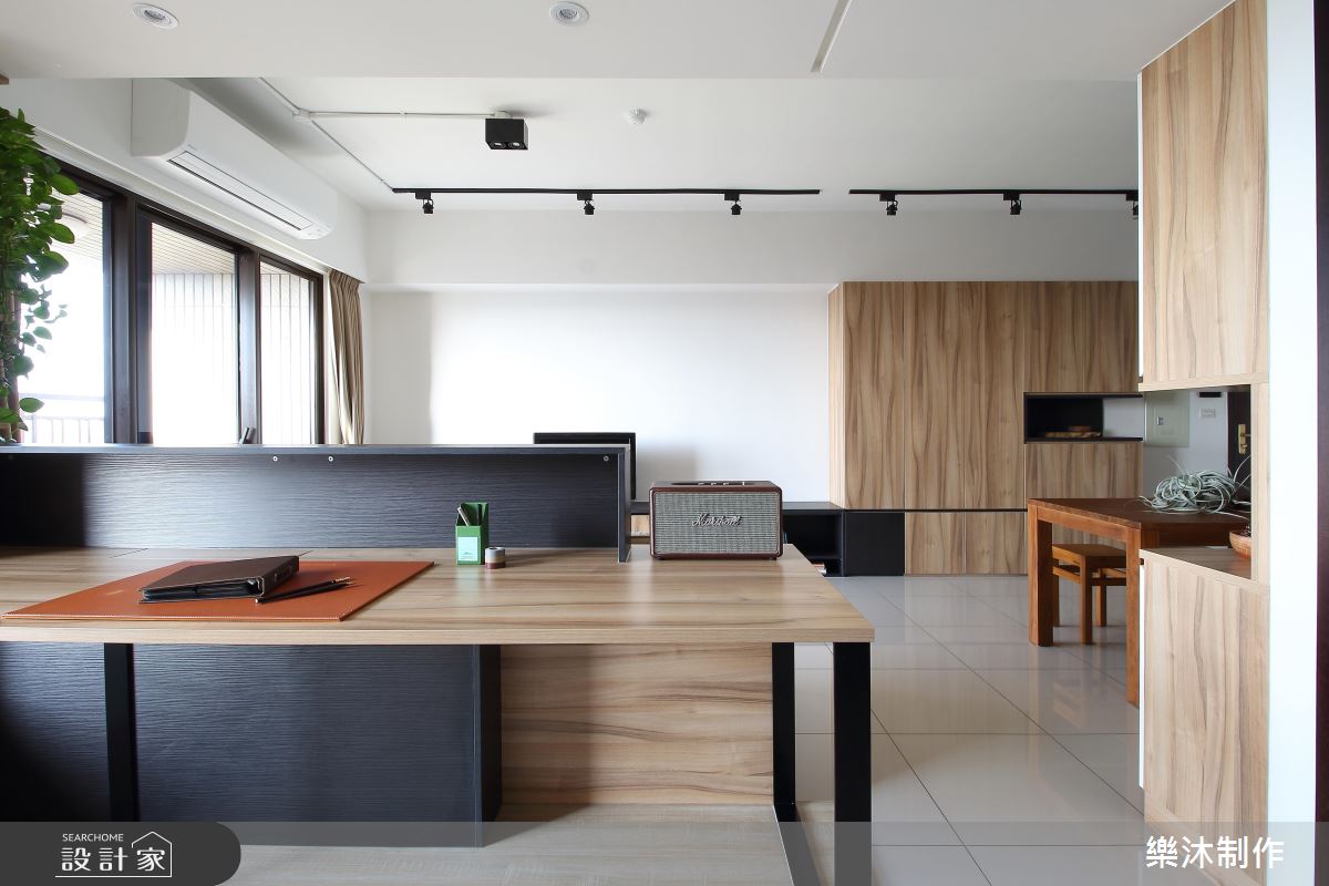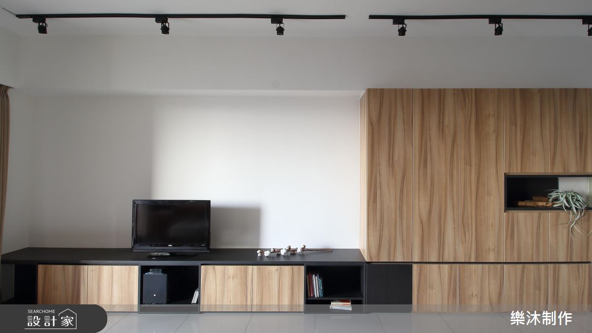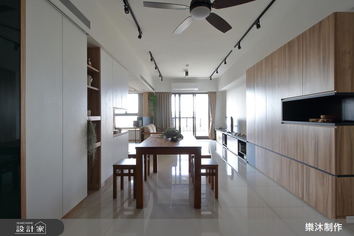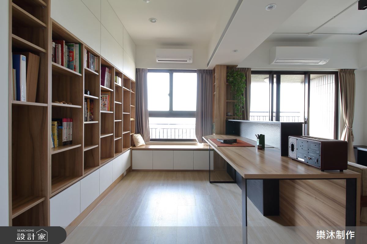 室內大量運用系統櫃作為收納之用,多變且彈性的造型與功能,創造出豐富的居家樣貌。大門左側以白色櫃體為主,中央以開放層架,成為器皿、杯盤或其他風格物件的展示區,替餐廳領域增添一股人文美學的色彩;右側打造整面原木質感的收納櫃,中間以深色層架框構出美學展示的領域,電視牆僅以原有的空間壁面為底,呼應樸實自然的生活態度;客廳後方規劃半開放式書房,臨窗設計一處臥榻區,讓屋主閱讀疲倦後,擁有一處休憩的美好角落,後面整面書牆皆以系統櫃打造,上下兩側以封閉門片收整造型,中央則以開放櫃體呈現,開闔並置搭配層板高度不一的設計手法,交織出輕快、愜意的生活節奏。