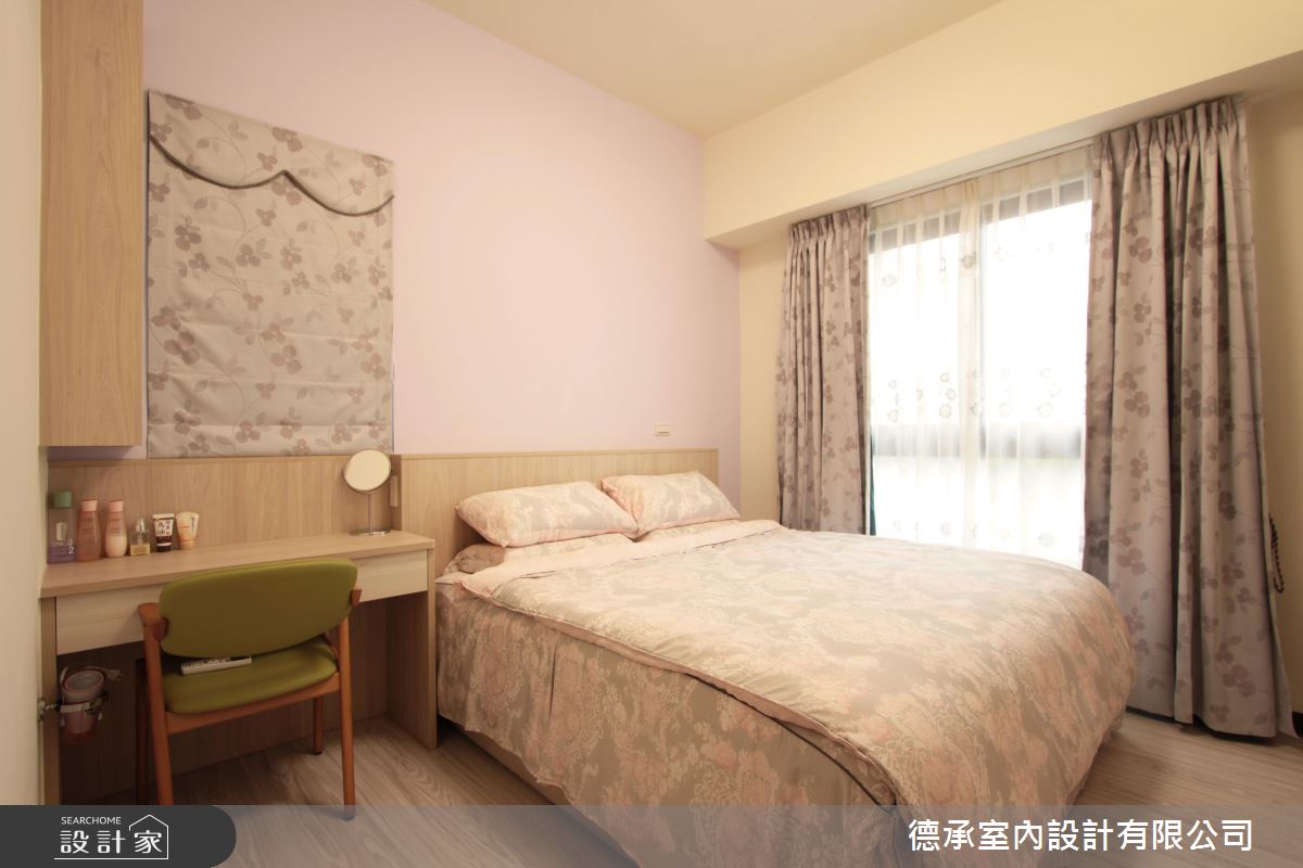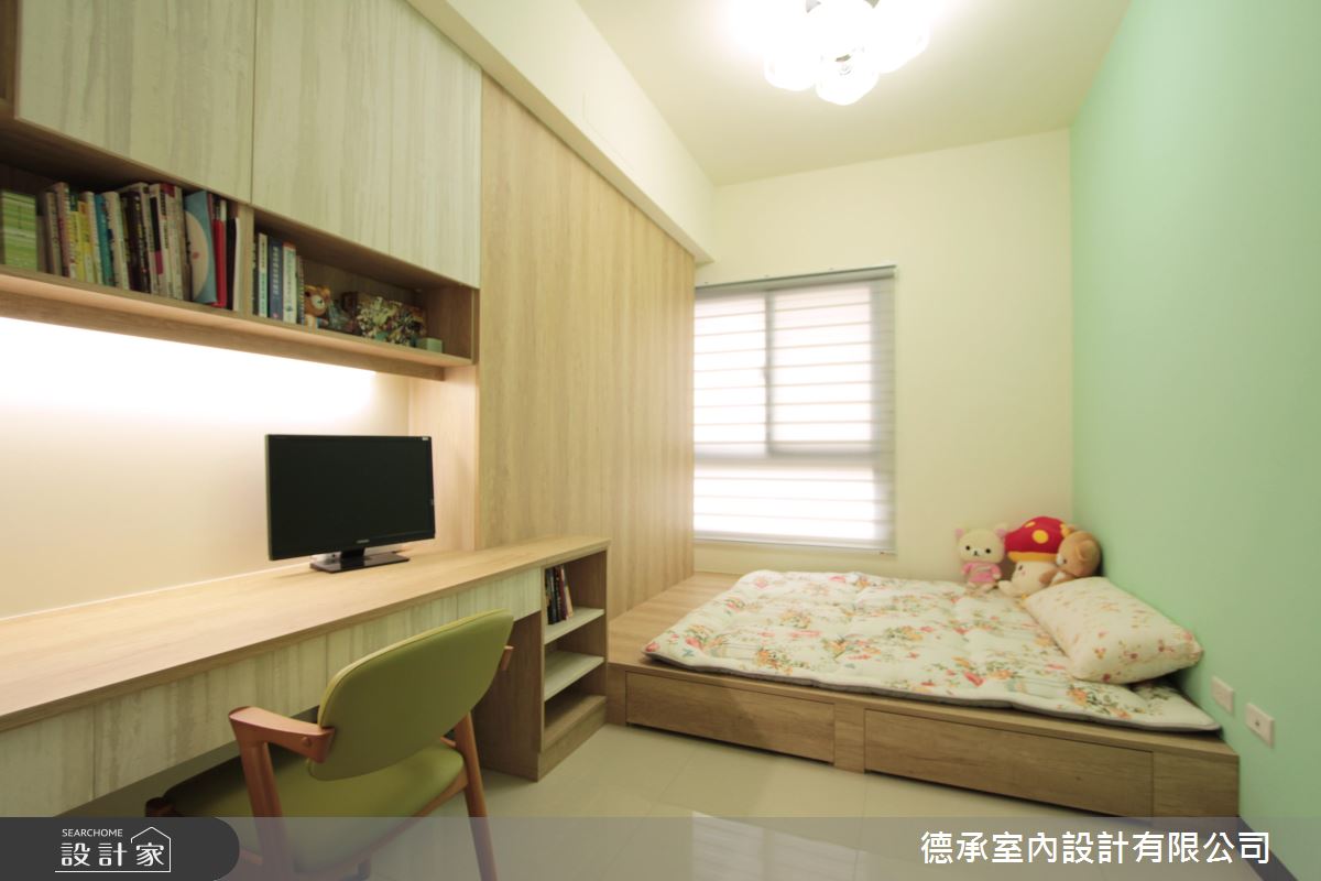 次臥房以溫暖木紋搭配清新的果綠色,並捨棄制式床具,選用架高臥榻的方式規劃睡眠區,打造出更親切無壓的休寢氛圍!