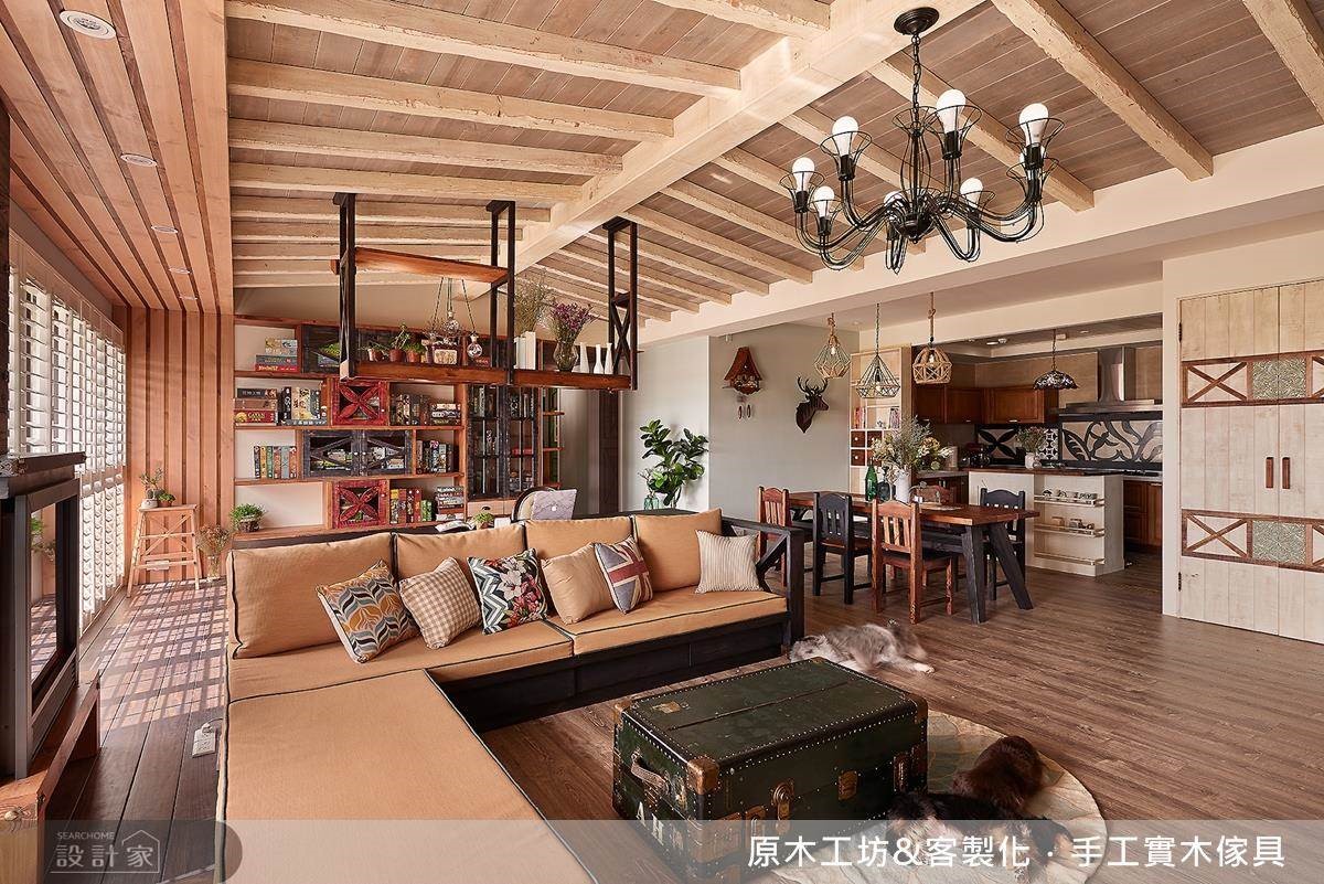 對於愛好社交的屋主、喜愛跑跳的寵物,開放空間感無疑是一大設計準則。讓天花呈現有如木屋般的斜頂線條,除了挹注度假風情,也增添挑高寬敞感,並藉由書房、客廳的開放串聯,以及廚房的通透拉門等設定,延展整個公領域的平面視野、促進採光的自由流通,演繹著充滿交流與互動的生活型態。