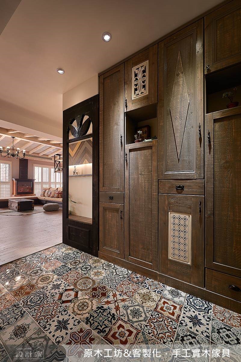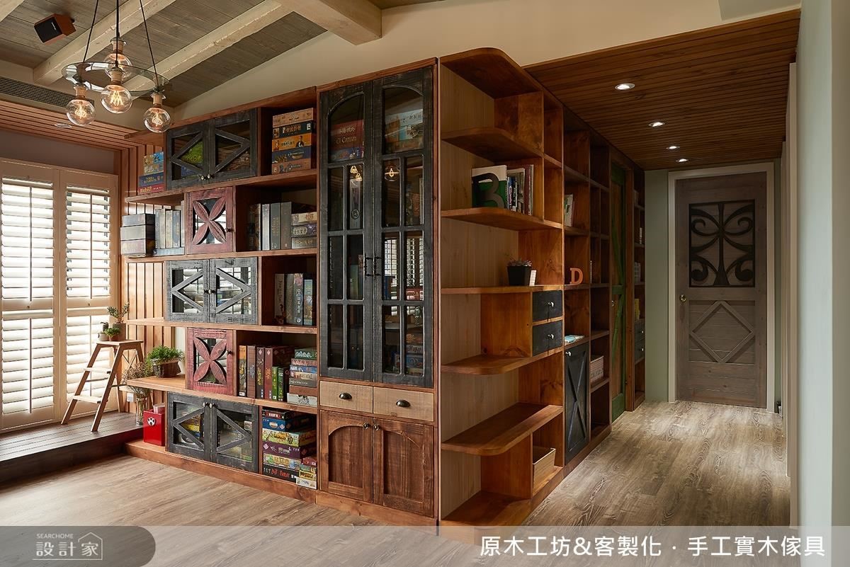 依循屋主生活需求,量身訂製每個儲物機能,從玄關櫃到書櫃,皆加入獨特的櫃面設計,讓櫃體與整體硬裝無違和相融,落實「美形收納」的意義;書房後方一整面充滿特色的多彩書櫃,即是特地為熱愛桌遊的屋主量身打造、用以擺放遊戲盒,而書桌上方的開放懸吊層架,不僅具有燈箱功能、也兼具展示意義,成了公領域中頗富聚焦效果的設計。