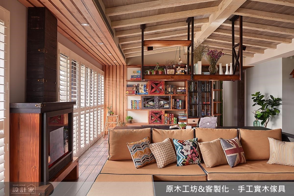 屋主期待客廳能有一個壁爐存在,設計師將其規劃在靠窗的立面軸線,並與整排臥榻相結合,運用木作的延伸、圍塑出一整道窗邊廊道,形成寵物最愛的日光浴地帶;而特別訂製的沙發座椅,除了於坐檯底部增添隱藏收納空間外,也特別使用便於換洗的沙發布套形式,更適用於寵物住宅。