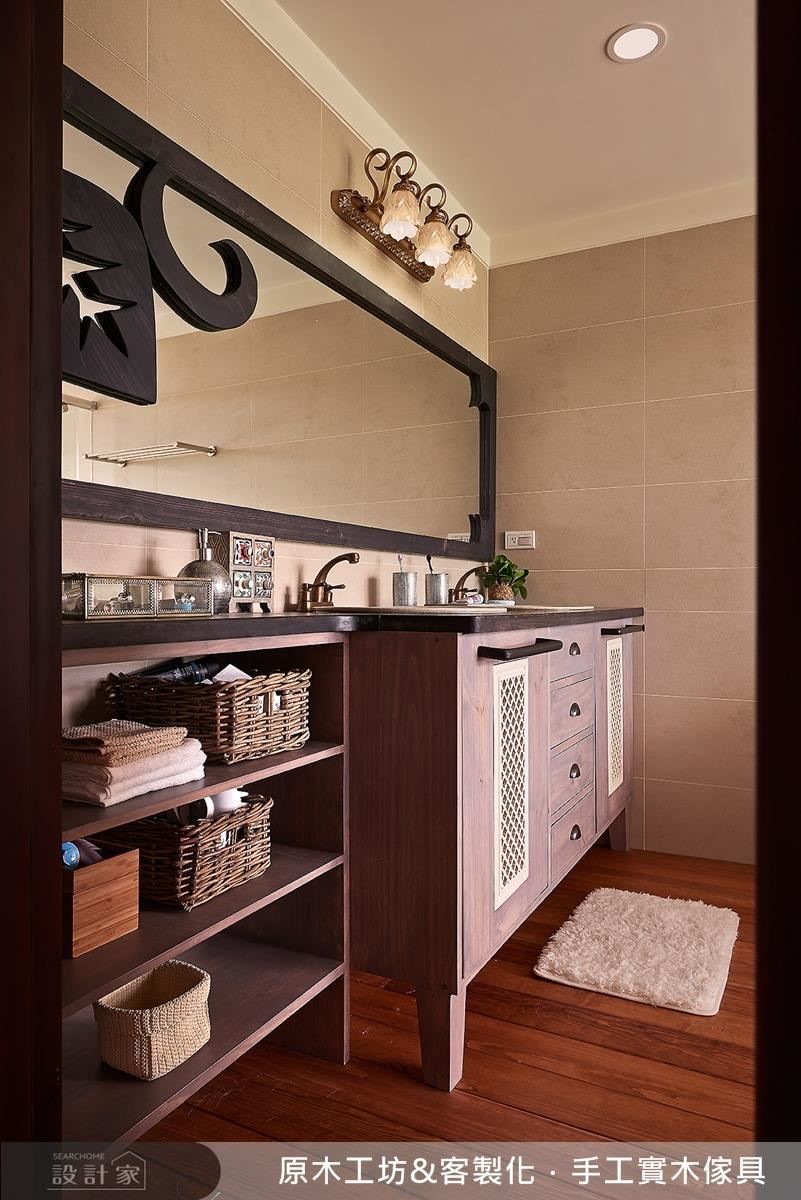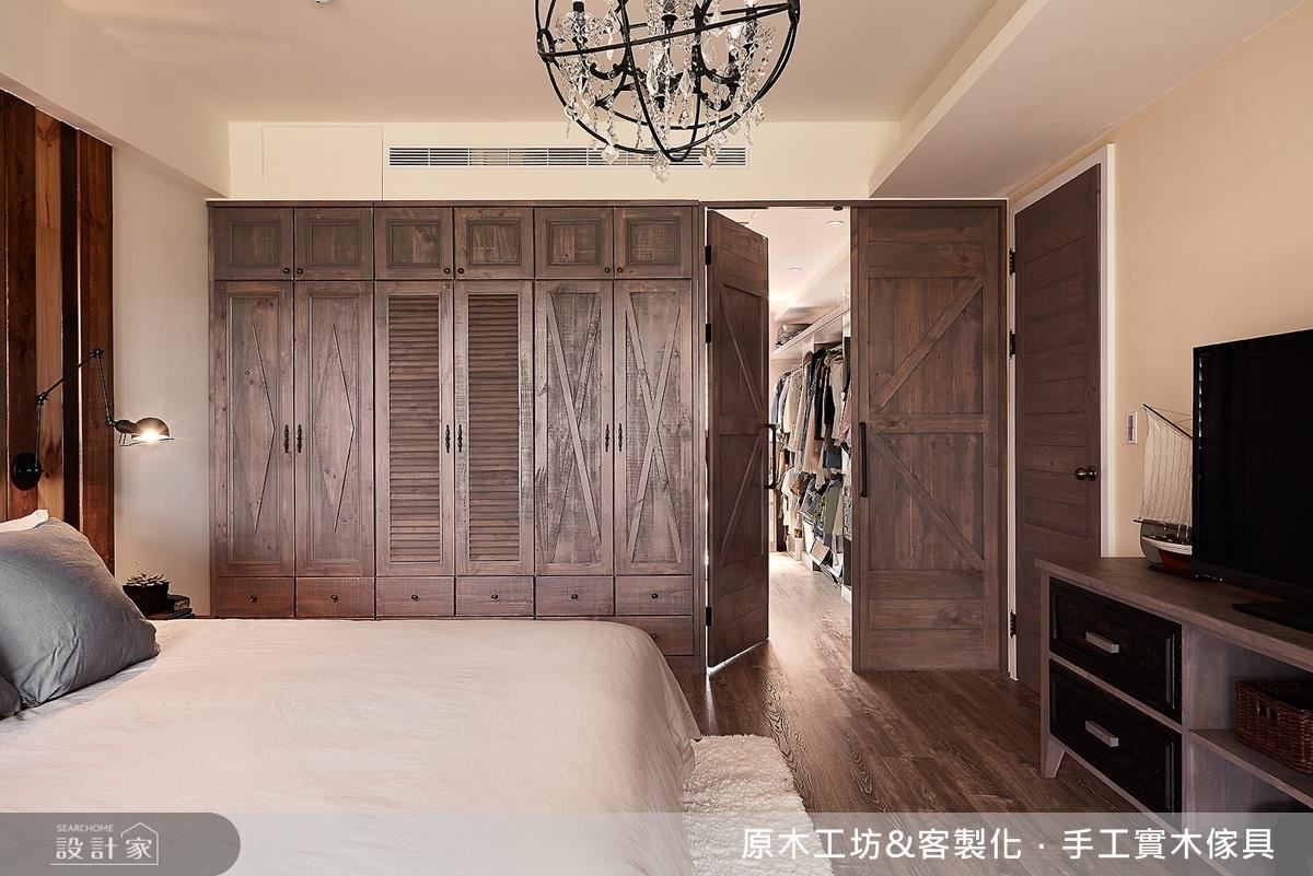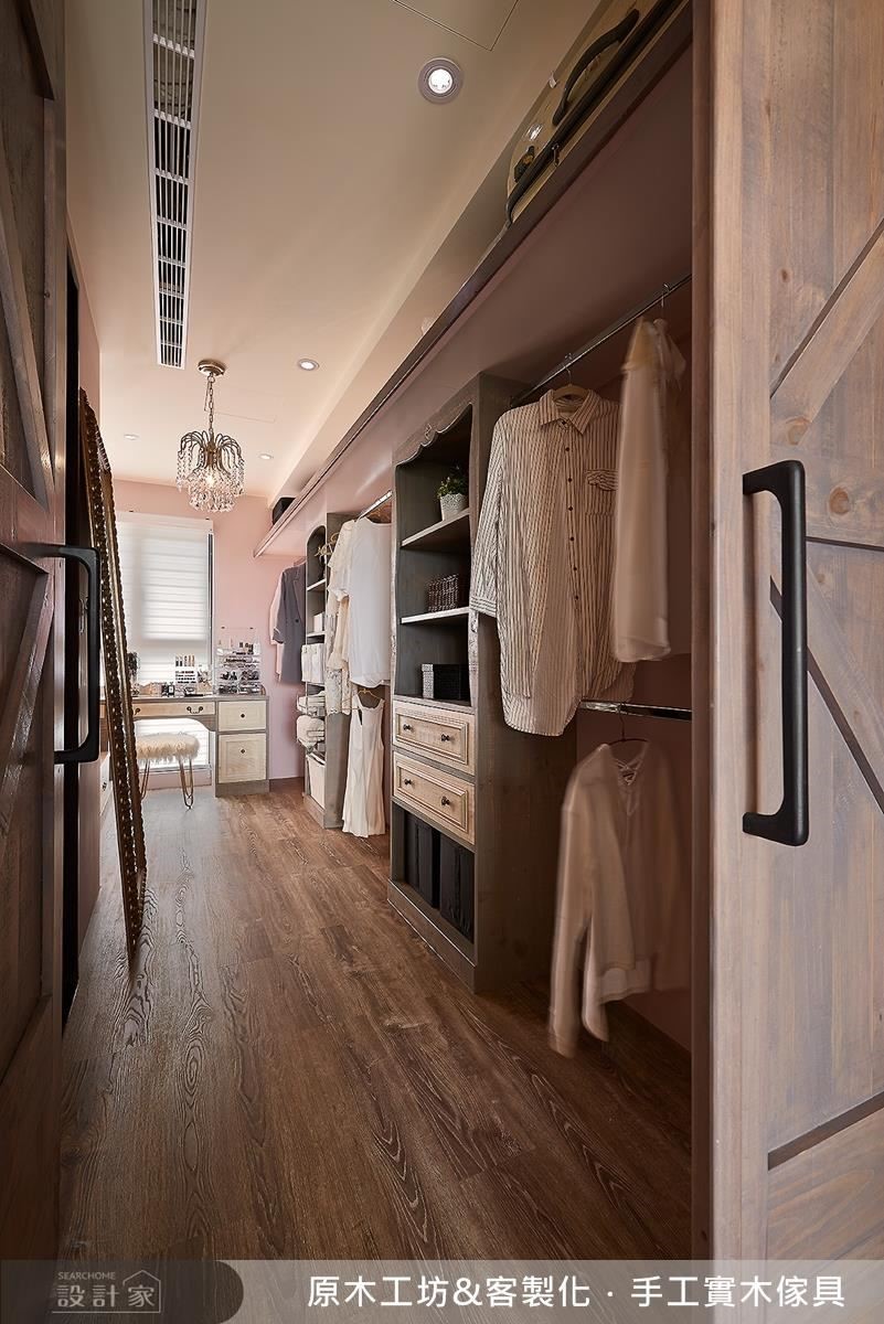回歸兩人的私領域空間,從更衣間到浴室,皆同樣承襲著實木的溫潤觸感,而女主人專屬的更衣室,更運用隱藏手法將其藏匿於衣櫃後方;推門而入,可見到夢幻的粉色基底,除了分門別類的櫃體規畫之外,其耐用防潮的實木材料,也形構出有利衣物保養的收納環境!
