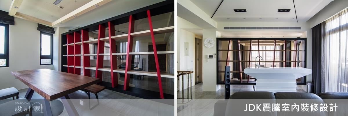 可以兼做隔間牆的紅色「八」字型開放書櫃從客廳看過去,反而像幅現代畫,又能讓視覺穿透,擴大空間感,也呼應了客廳幾何切割的用心(右圖)。