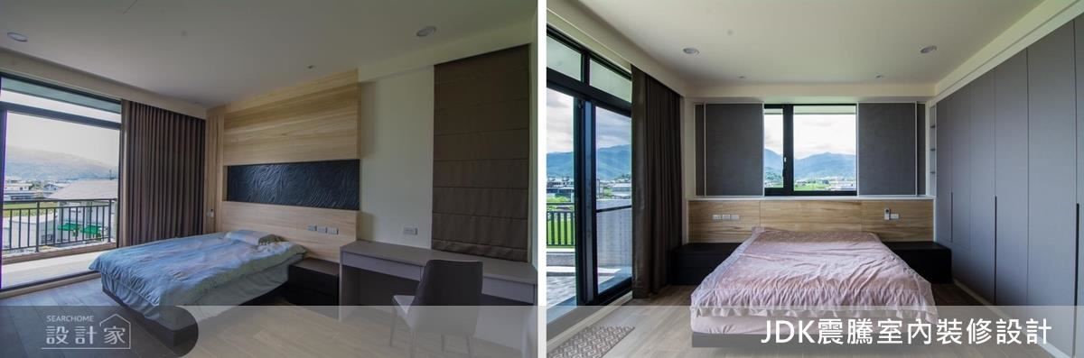 好客的業主招待客人毫不馬虎,連客房都有令人羨慕的視野。位於透天厝的高樓層,落地窗的設計可以把大自然美景盡收眼底,簡單的裝潢就不是想搶了天然風景畫的丰采。左邊臥室背牆以梧桐實木+亂紋板的組合,簡單又有型;右邊臥室則有風水考量,做出可以開闔的床頭背板,絕對讓客人賓至如歸。