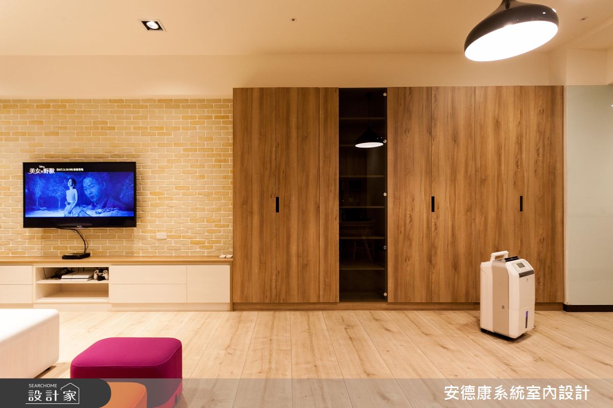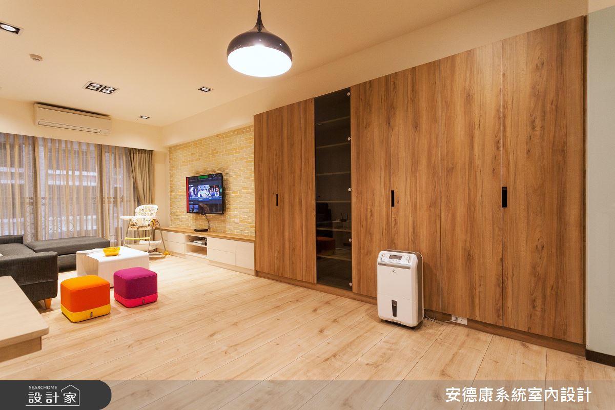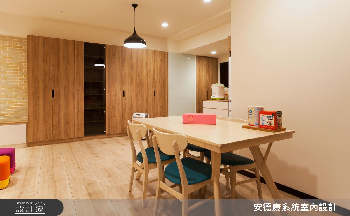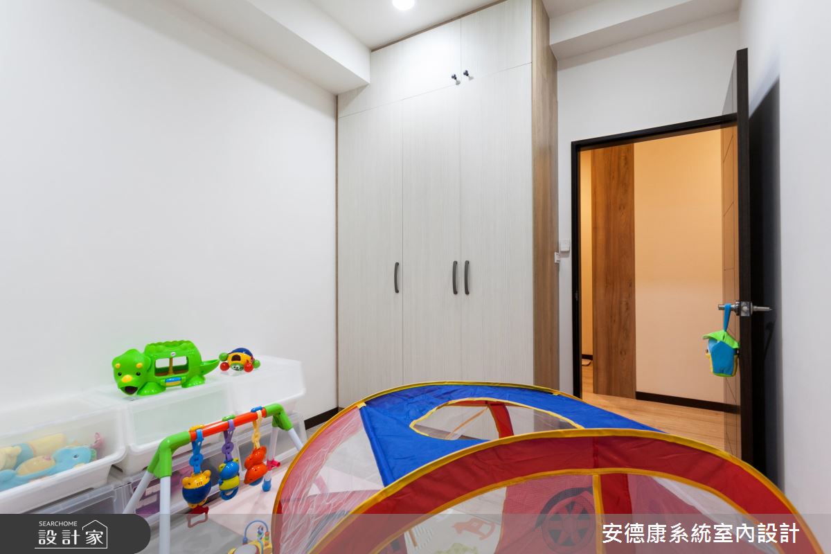 甫入門,設計師即沿著樑線鋪排木作櫃體,讓溫潤肌理一路延伸,連接至石材電視牆,展現天然無壓的立面表情,其間穿插帶有現代感的白色烤玻、深色玻璃、增添牆面的造型變化,其烤玻位置也正好靠近大門口,兼具居家備忘留言板功能;並嚴選建材品質,強調遠離過敏源和甲醛危害,講究提供給孩子一個安心成長的環境;廚房則因空間不足,於是向外延伸機能,不僅增添冰箱與餐邊櫃功能,也填補了樑體與結構柱產生的畸零空間,而開放式的餐區設定,亦促進了公領域整體的互動交流;孩童遊戲室內則不做過多設計,除了基礎櫃體機能外,一切以軟件鋪排為主,讓孩童的未來定義空間主題!