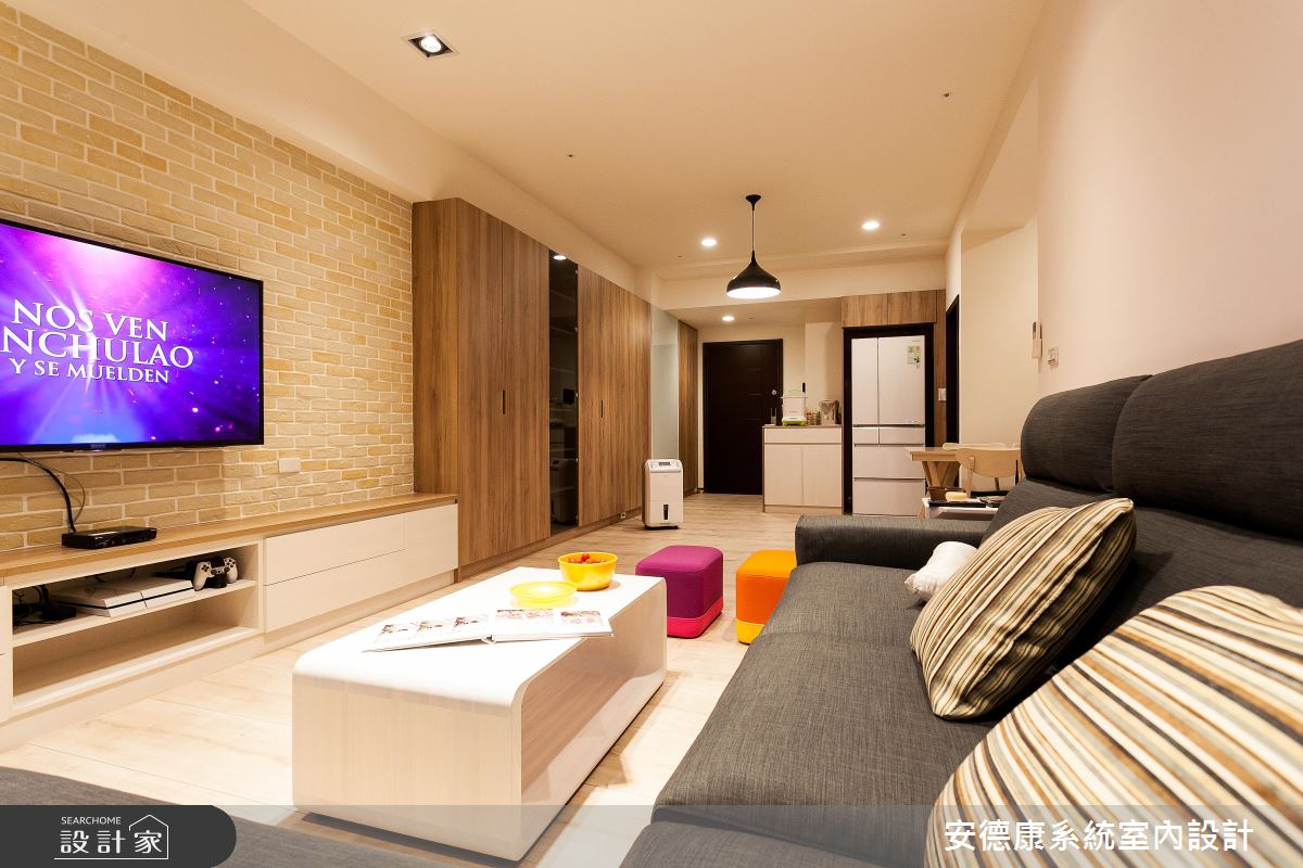 整體藉由一致性的木質底調,型塑溫煦生活情境,客廳則適時妝點跳色軟件,點出視覺活力,營造續紛趣意!