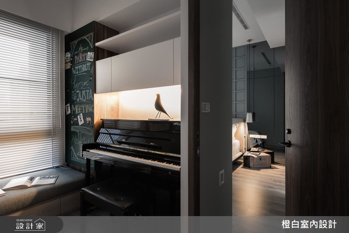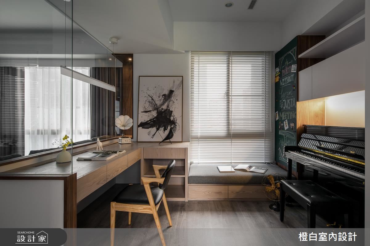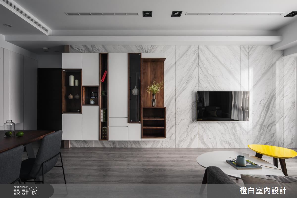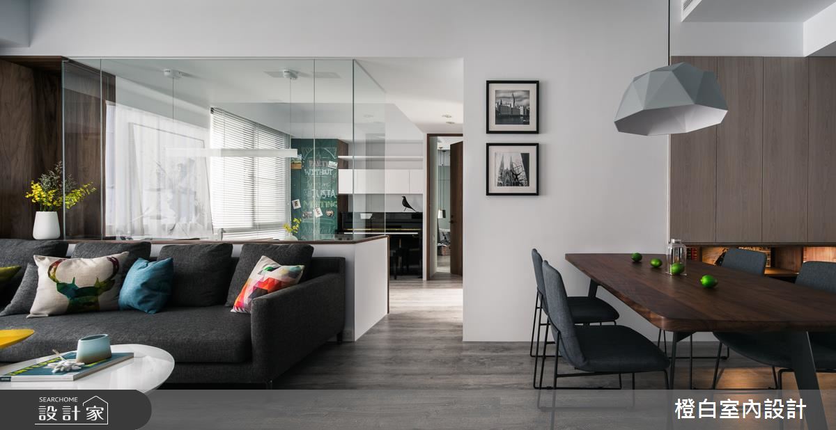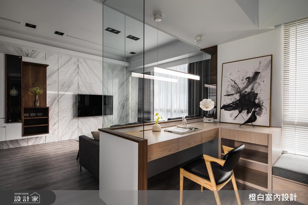 設計師以純淨白色作為基底,選用木紋肌理鋪敘地坪與局部牆面,傳遞溫暖的人文氣息,並採以通透玻璃打造隔間,型塑客廳與書房之間的清透視野,銀狐大理石電視牆則加入懸吊展示格櫃,達到基礎功能之餘的美型意義,同時運用柔軟輕盈的彩色軟裝,適時柔化稜角線條,帶出活潑意趣;餐廳、書房內各自於櫃體內妝點隱藏式光源,讓現代風褪去冰冷印象,凸顯出溫煦的生活暖度;寢臥在床頭牆做出獨特設計,以延伸到頂的灰色立面帶出場域個性,兩側則連結深色鏡面,營造視覺延伸的趣味感受,讓整道牆面顯得極致放大!