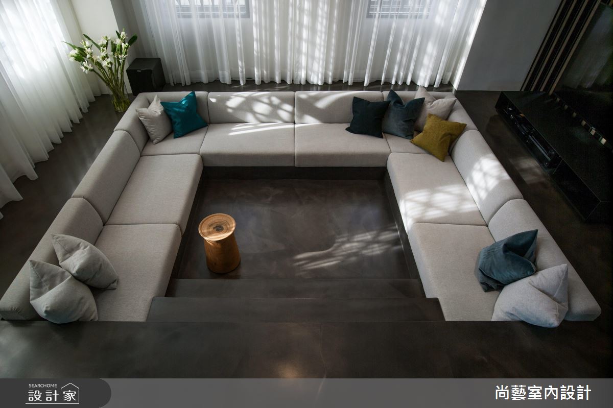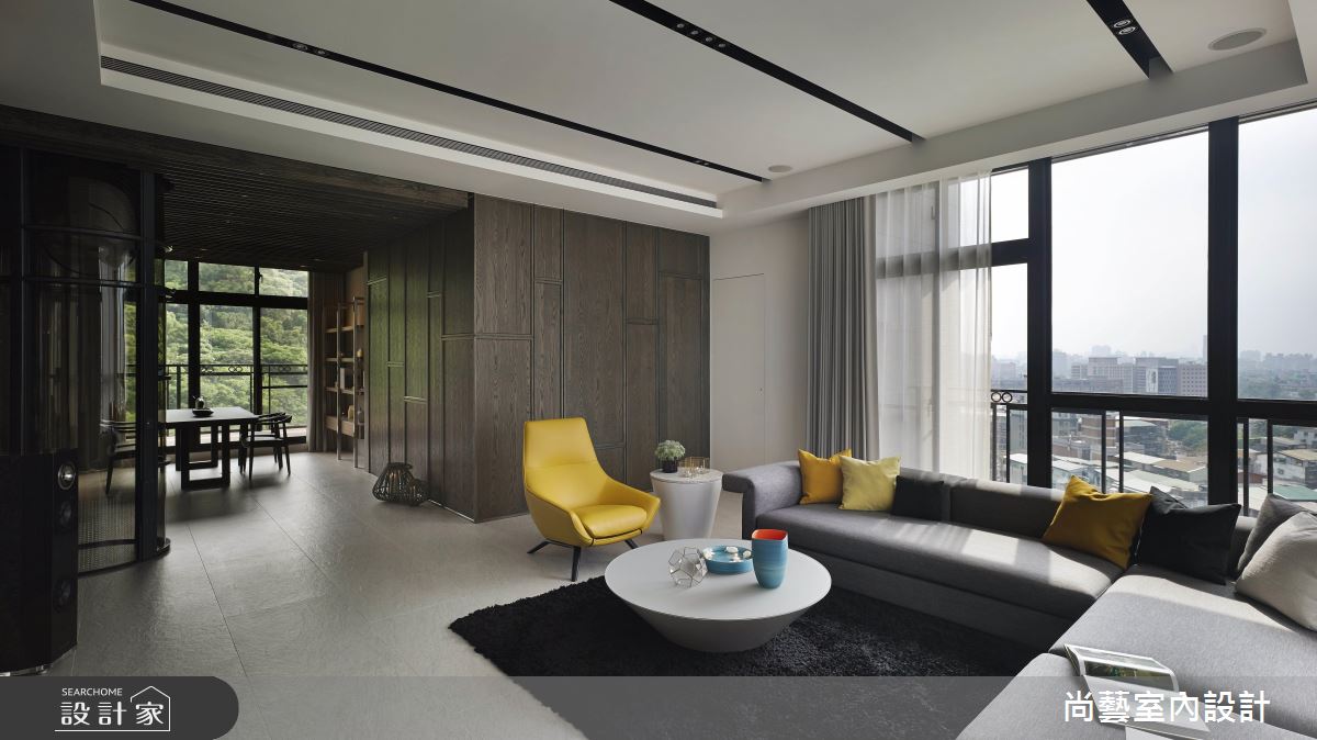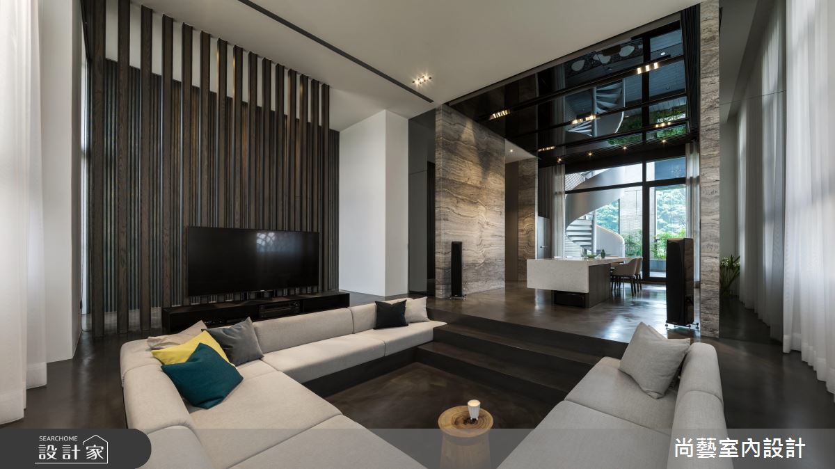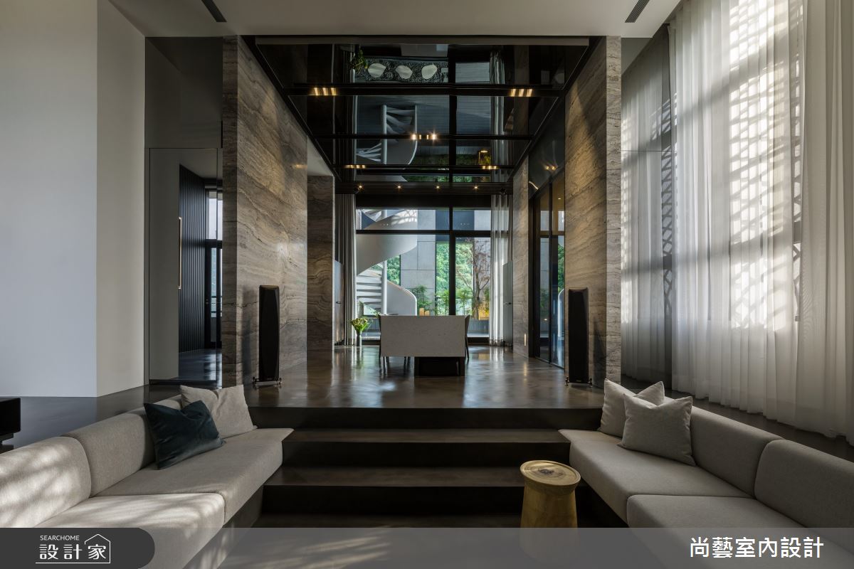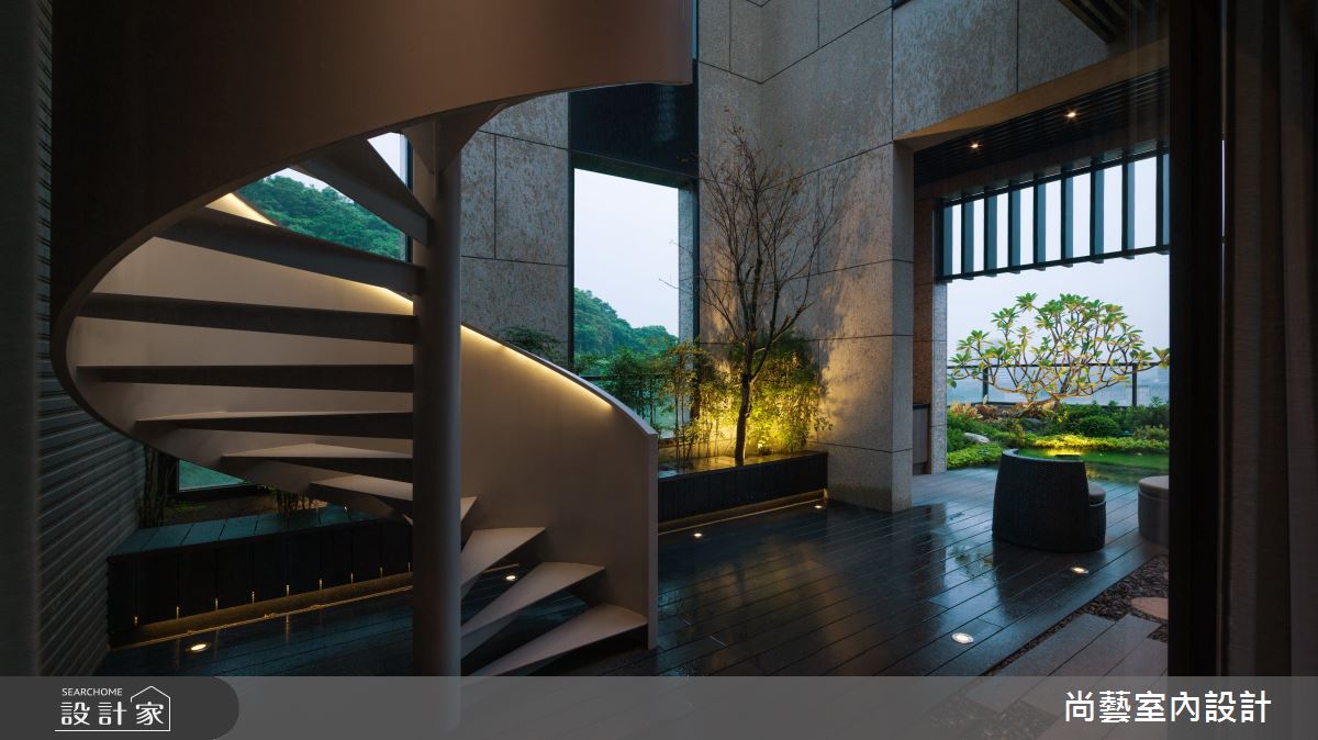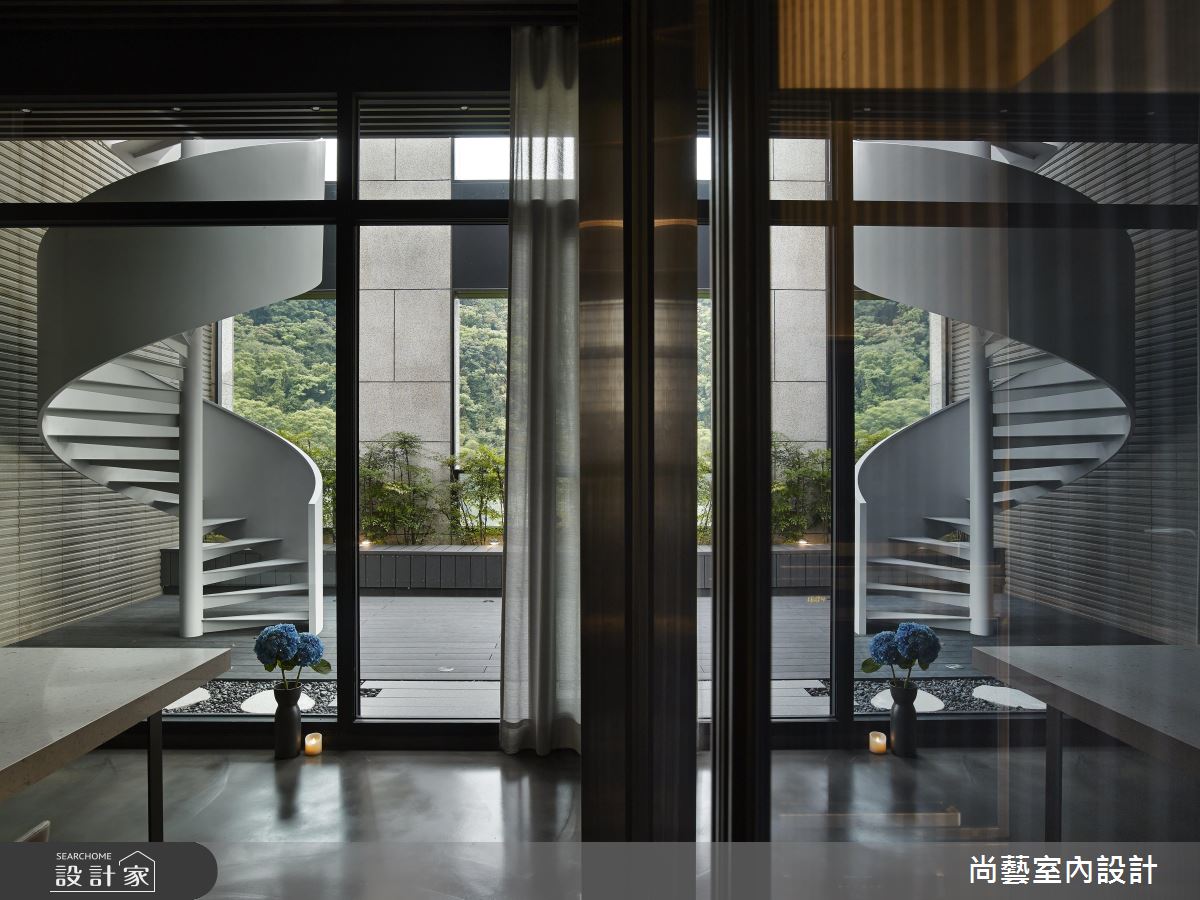 屋外,藉由戶外旋轉梯的配置,使樓梯搖身一變為視覺焦點,採以緞帶作為設計概念,拉出向上延伸的視覺效果,而夜間的暈光設計,亦讓旋轉梯化為一座發光雕塑,同時,藉由鏡面的變化,讓旋轉梯從鏡面延伸折射,形成對稱的兩個量體,架構出視覺新意;室內,則運用灰調石材帶出焦點氣勢、搭配溫潤木色,調合出沉靜安穩的氛圍,並藉由開放格局保留最大景觀面,讓屋外景色延伸入內,使時間變化與日常生活產生互動;而為了型塑沙發區域的休閒感,刻意利用ㄇ字型的場域概念、結合往下走的動線,框架出寬敞的降板沙發區域,使人可在此享有不同的景觀視角,感受多變的空間感,並保留沙發周邊原有的鐵件造型窗框,映著日光若隱若現,展現出深具層次的視野變化!