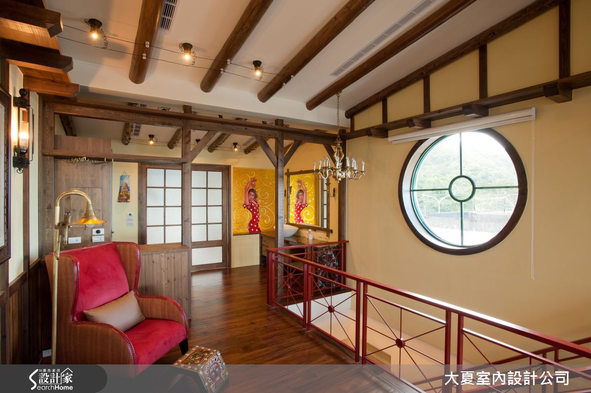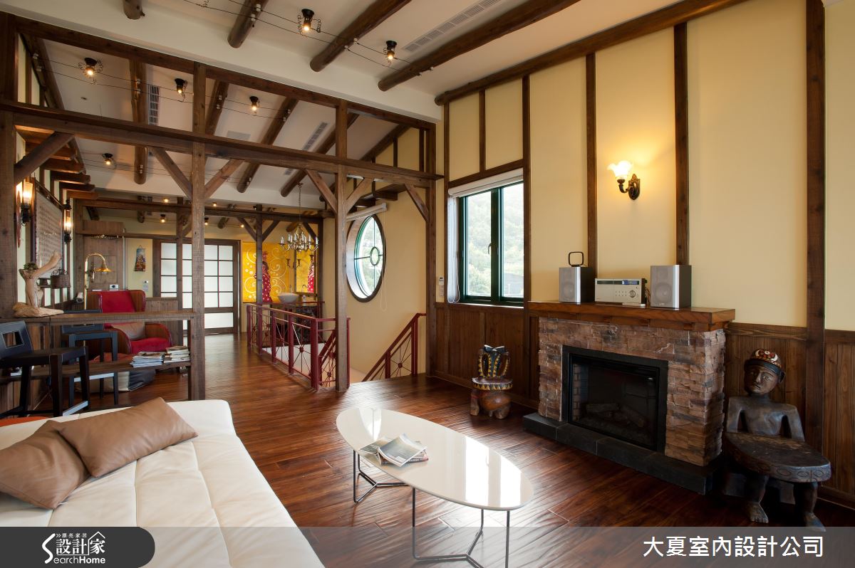 頂樓以深咖啡色系的木紋鋪陳,結合自然粗獷的石材壁爐,加上豔紅單椅與女郎的畫作,有如置身島國般的熱情氛圍。