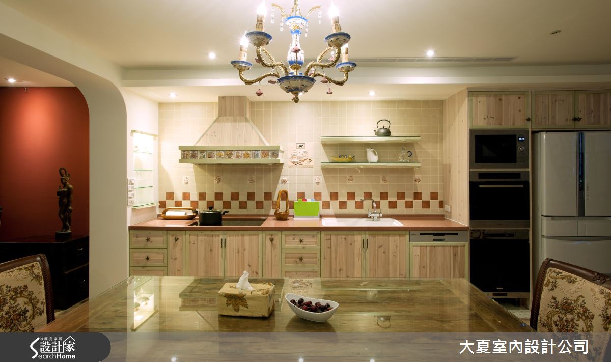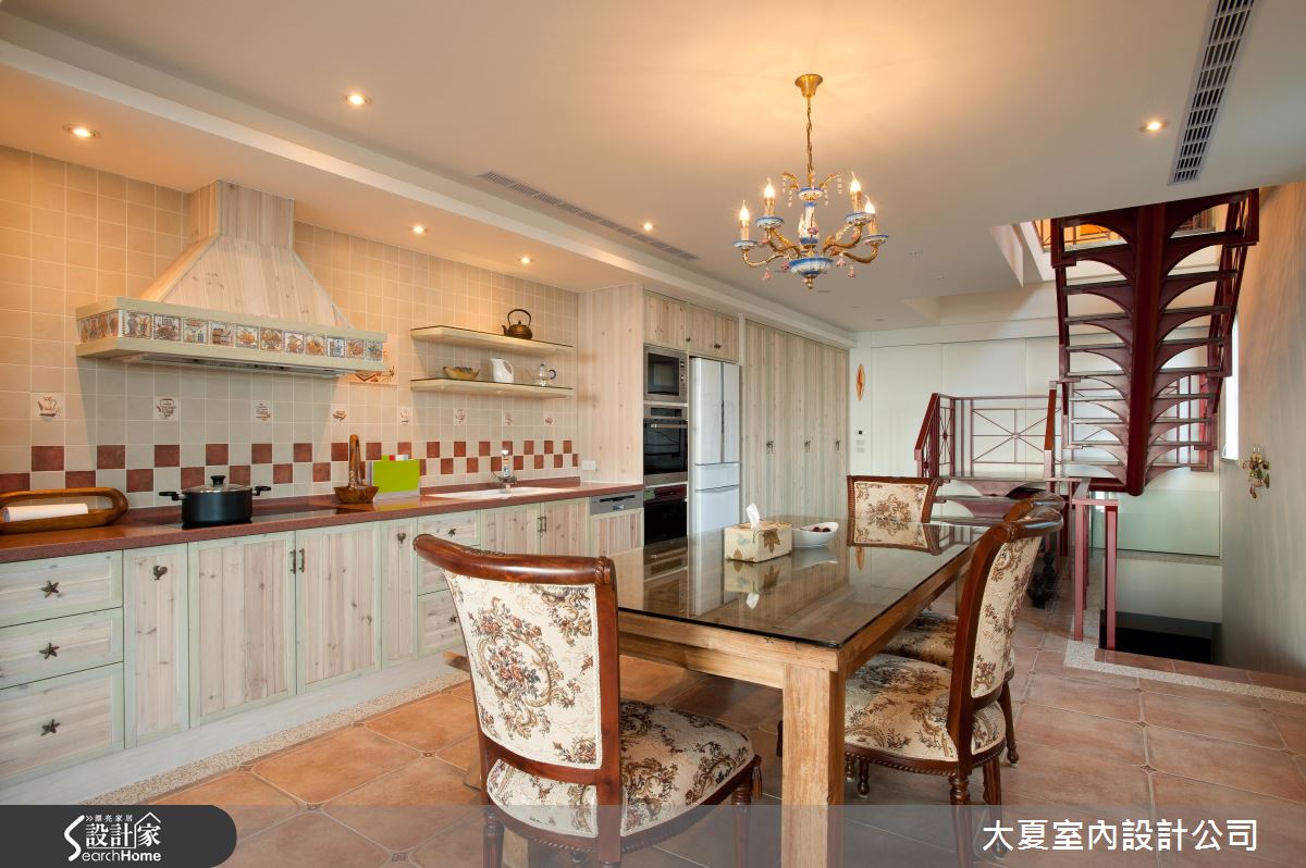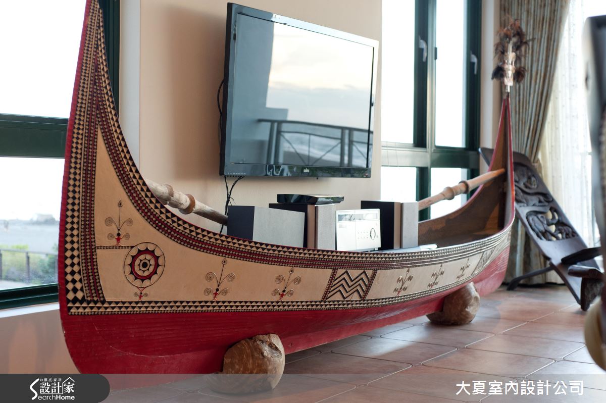 精緻的線條勾勒船身,紅色系鋪陳船底與描繪周圍線條,一艘別具質感的獨木舟乘載著音響電器設備,創造獨一無二的客廳風景,同時也成為音響、電器設備的絕佳收納;客廳裡擺設古典造型的家具,隨著嵌燈映照在深紅色的壁面,光線灑落在歐風畫作,醞釀藝術美學的氣息,同時調和一抹戲劇性張力的空間感受;淺色系的木紋創造柔美的廚房氛圍,別緻的吊燈與印花描繪的椅身增添浪漫情懷,格紋跳色鋪陳的磁磚壁面及下方利用淺綠描繪櫃體的手法,增添視覺層次與變化;循著深紅色的鐵件階梯而上,樓上規劃休憩與睡眠的私領域,無論是優雅圖騰鋪陳的淡雅風情,還是嫵媚女郎畫作挹注的熱情氣息,皆詮釋豐盛的歐風美學。