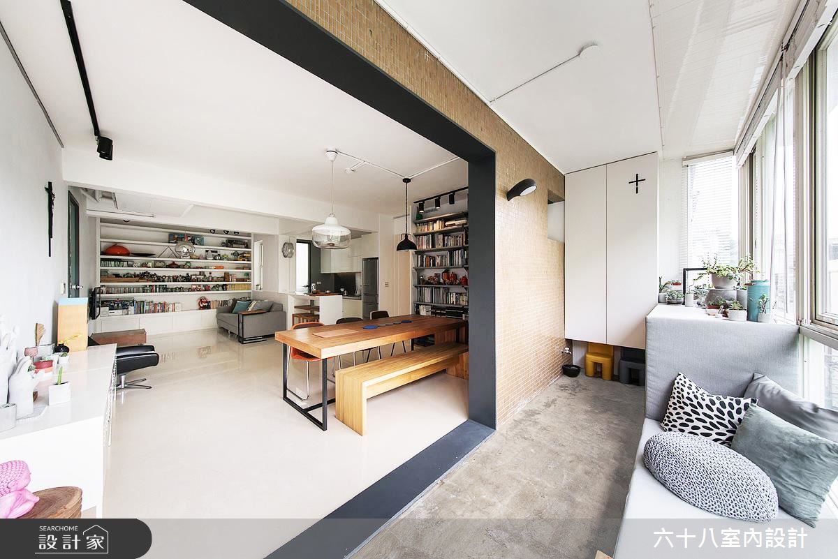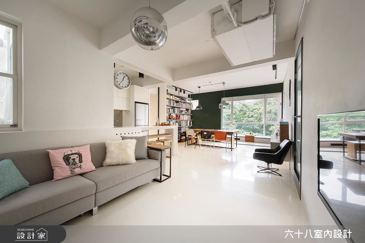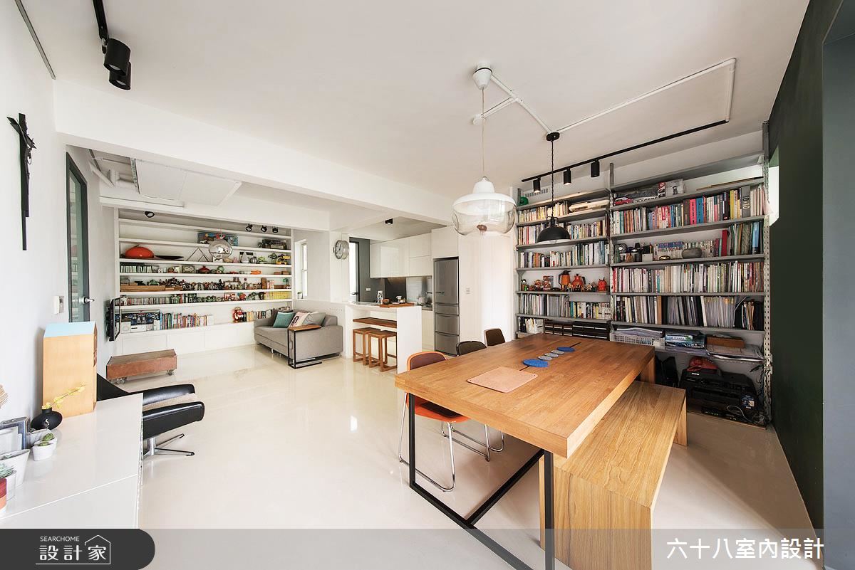 以清爽的白色系為基底,提升了整體空間的清新明亮感,客廳入口不以門片阻隔,讓玄關處的樹景可以完全映入室內,剩餘的牆面則繪上墨綠色,與戶外景色相互呼應,窗檯邊也安排了臥榻設計,成為日常生活中舒心的放鬆角落。餐廚區和客廳採開放式設計,開拓了寬敞的生活視野,搭配大面的展示收納設計,讓喜愛閱讀、擁有眾多公仔收藏的屋主,擁有非常足夠的收納空間。