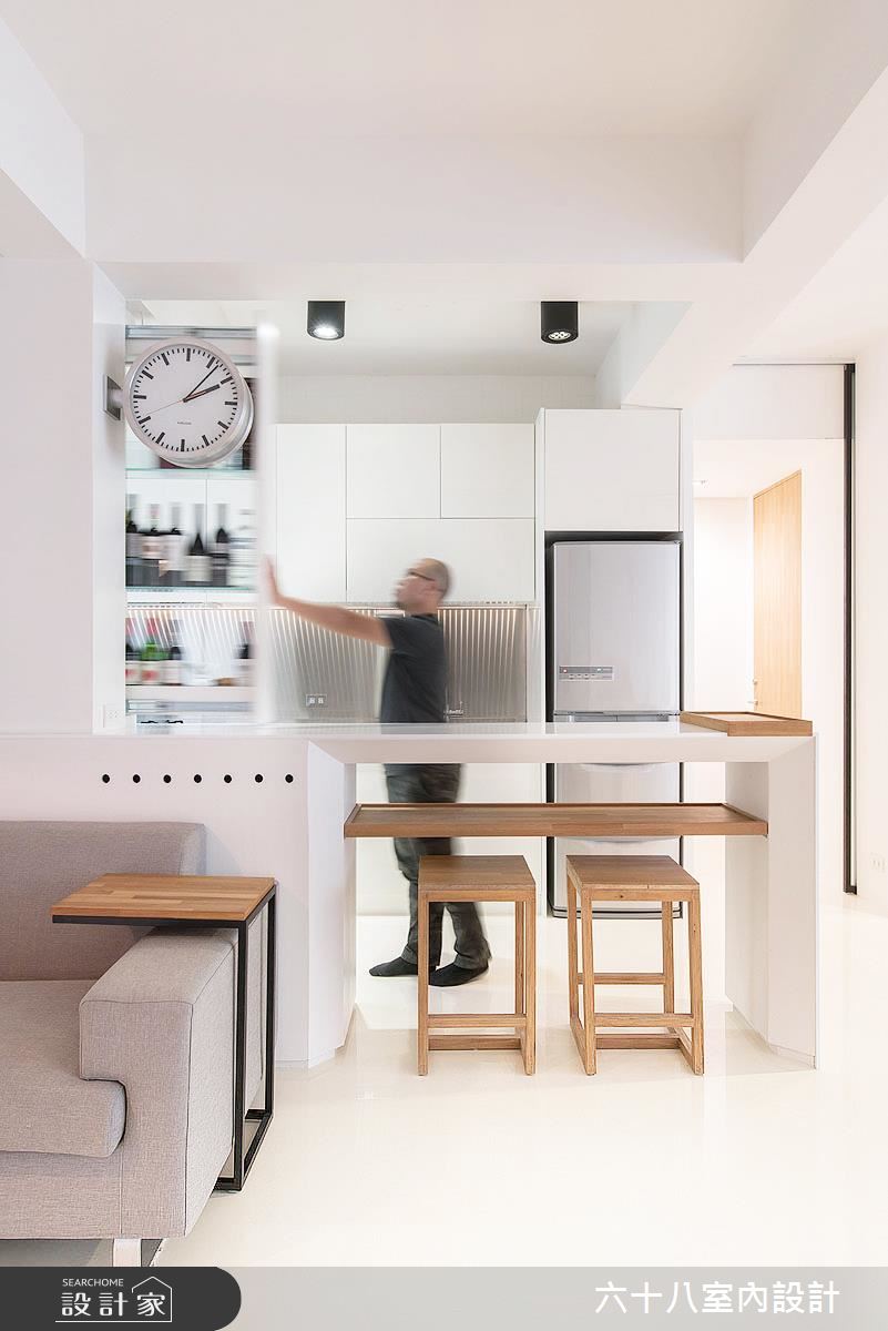 融合了舒適自由的北歐風和現代風格的時尚態度,廚房處並運用隱藏式的收櫃收納,讓空間變得更加簡約和俐落。