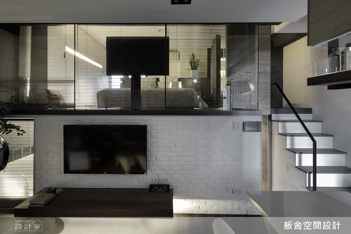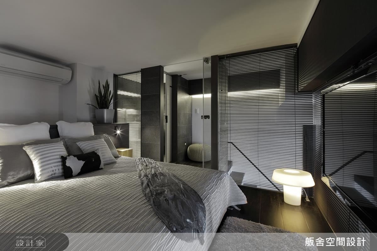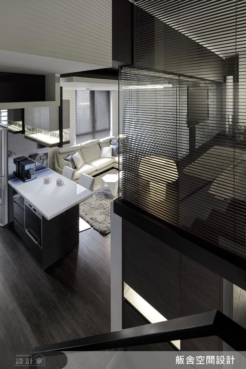 設計師利用挑高四米的優勢增加空間使用,黑白材質的分割帶出空間的界定,並以虛實的手法如木百葉與清玻璃增加空間的穿透感,百葉之間的細縫利用 truss(支架)作為玻璃的分割線,如此手法讓開放式的上層臥室擁有良好的採光效果。