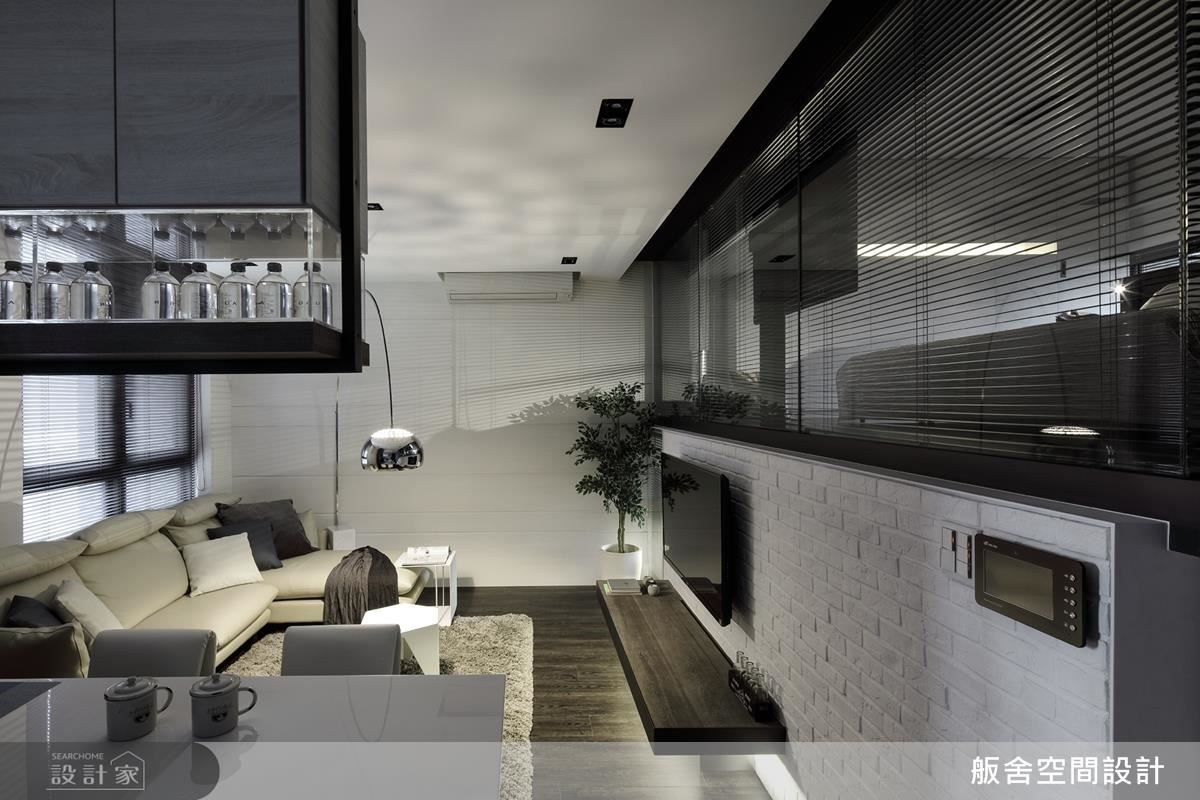 此外,由於女業主曾提及希望空間納入鄉村風,設計師以極簡與工業風元素轉化鄉村元素,純白文化石搭配鐵件作為電視牆主述,呼應了黑白調性,材質肌理更展現出立面層次。